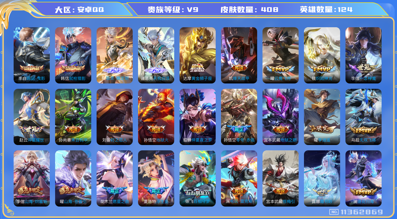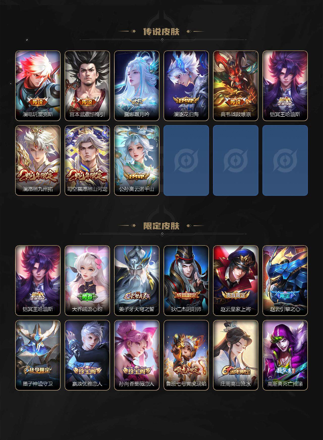 - [12049656]V9 4典藏 36传说 125英雄 453皮肤 可修改实名 优质装备:鸣剑·曳影,星域神启(倪克斯贼亮),幻阙歌(貂蝉典藏),弑枪猎影(韩信典藏),云鹰飞将(小将军),绛天战甲(鸡嘴战神),黄金白羊座,久胜战神,炽阳神光,一念神魔,末日机甲-孙尚香(绿蚂蚱),地狱火,仲夏夜之梦(大飞蛾),地狱之眼,飞鸢探春,胖达荣荣,时之恋人-刘备(电焊工),淬星耀世,超时空战士-狄仁杰,末日机甲-孙策,碎云,炽翼辉光(娃娃菜牛角包),电玩·雷克斯,妄想实况,黄金天蝎座,涂山容容 传说皮:云诺千山,幻光神枪 珍宝阁皮:妄想食味,万物之道,优雅恋人,玩趣恶龙 限定皮:愿照·山河定(司空震年限),愿照·众生和(妲己年限),逐霄战戟,鸣野蒿,至尊宝,白虎志(电光耗子),异界灵契(白毛香),傲雪梅枪,补天,前尘镜,绯月行,神威(电光马子),飞衡(韩信年限),遇见飞天,高山流水,诗剑行,五谷丰年,幽恒(沐浴露),游园惊梦,梁祝,御风骁将(吕布年限),龙胆,岱宗(典韦年限),李小龙,辉光之辰,霸王别姬-虞姬,默契交锋-花木兰,孙行者,一生所爱,神奇女侠,匿光追影者,寅虎·御盾(廉颇年限),寅虎·心曲(虎婆),寅虎·赤拳(老虎年限),百木心枪,玉兔公主,启示之音,唐三藏,枫霜尽,时之奇旅-妲己,神器·万象笔 史诗皮:鸭鸭历险记-刘禅,器灵·浮梦炉,狼魂孤将,化蝶舞,灵蛊蚀心,星界战将,谪仙醉月,龙之律动,雪豹·霜爪,石田雨龙,百相守梦-周瑜,茶境仙,破空之剑,东方月初,蔬乡物语(鲁班七号),百相守梦-百里守约,百相守梦-黄忠,紫霞仙子,苍穹之光,电玩小子(小书包),黄金分割率,特工魅影,千年之狐,永昼,江河有灵,末日机甲-莱西奥,鹤归松栖(赵怀真),雪夜绮愿(周瑜),百解令(蒙犽),高渐离燃音魔法,蒙恬荣光圣徽,无限星赏官,冰冠公主,青蛇,偶像歌手,白蛇,晚萤,电玩·爆裂旋风,暗夜猫娘,百相守梦(关羽),龙骑士(小龙虾),末日机甲-吕布,猫狗日记-孙策,猫狗日记-大乔,时之恋人-孙尚香,乱世虎臣,节奏热浪,修罗,女仆咖啡,摇滚巨星,水果甜心,绅士熊喵,天才门将,星夜王子,心灵骇客,功夫厨神,德古拉伯爵,暗隐猎兽者,幽灵船长,鬼剑武藏,暗渊魔法,心灵战警,乐园奇幻夜,舞动绿茵,地狱岩魂,诗语江南,纤云弄巧,繁星吟游(呼啦呼啦),拒霜思,缤纷独角兽,乘风破浪,逐浪之夏,月团寄思,水晶猎龙者,曙光守
