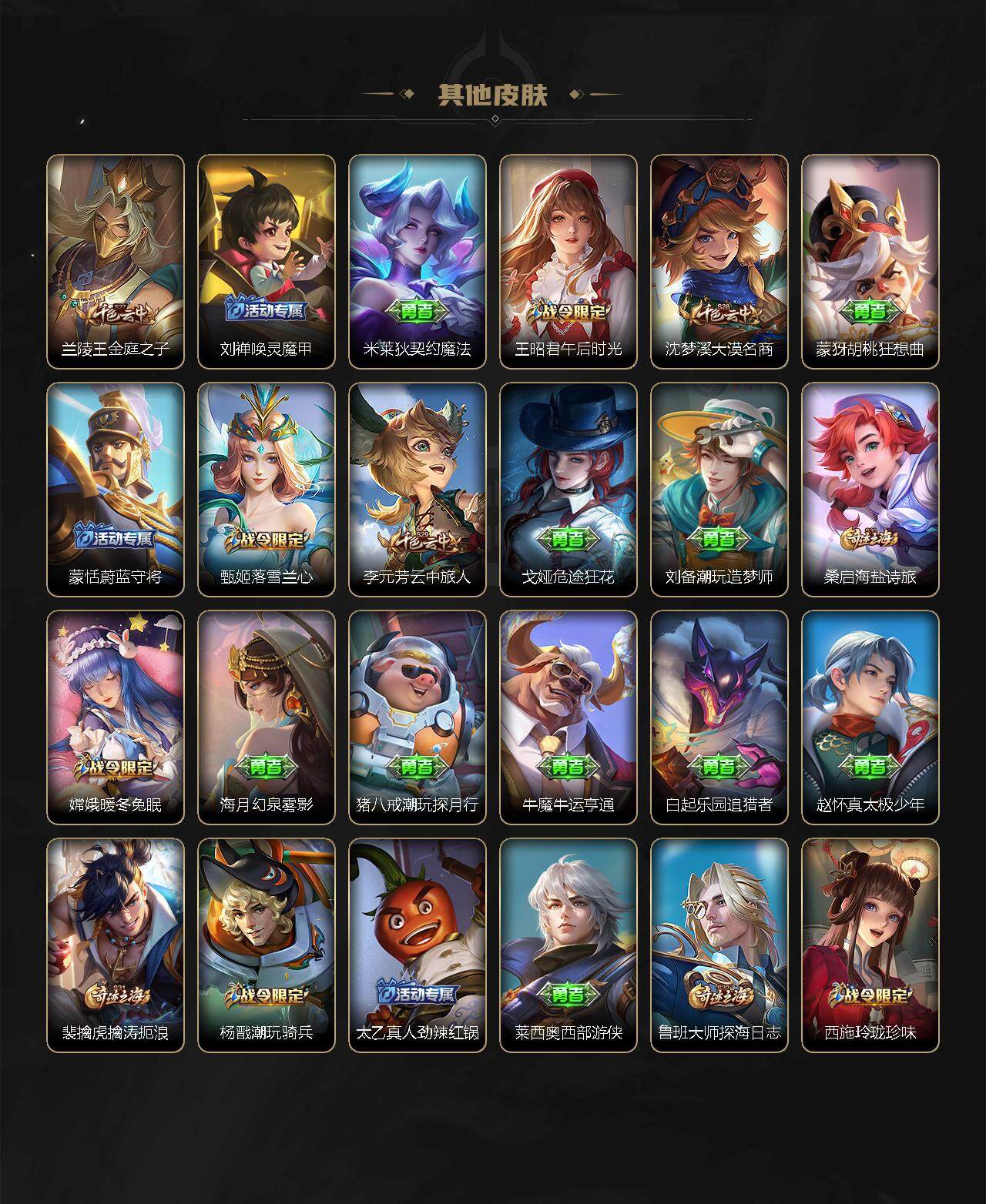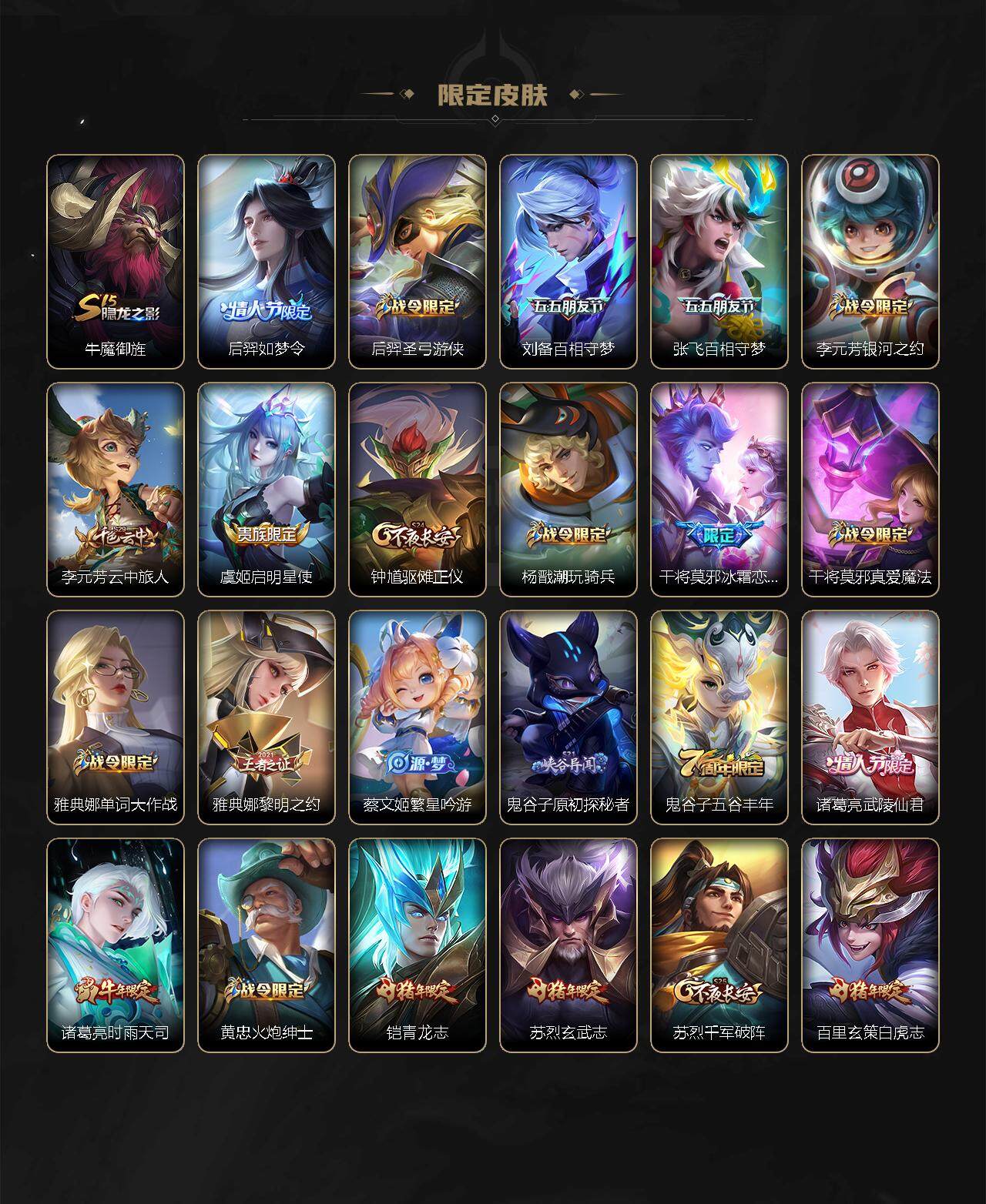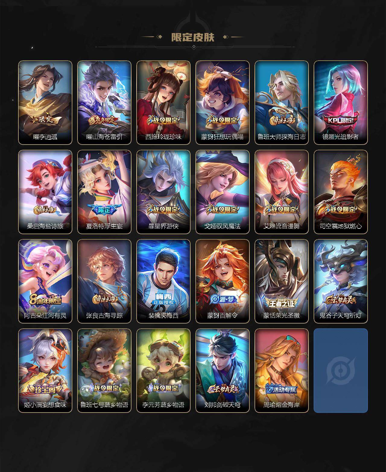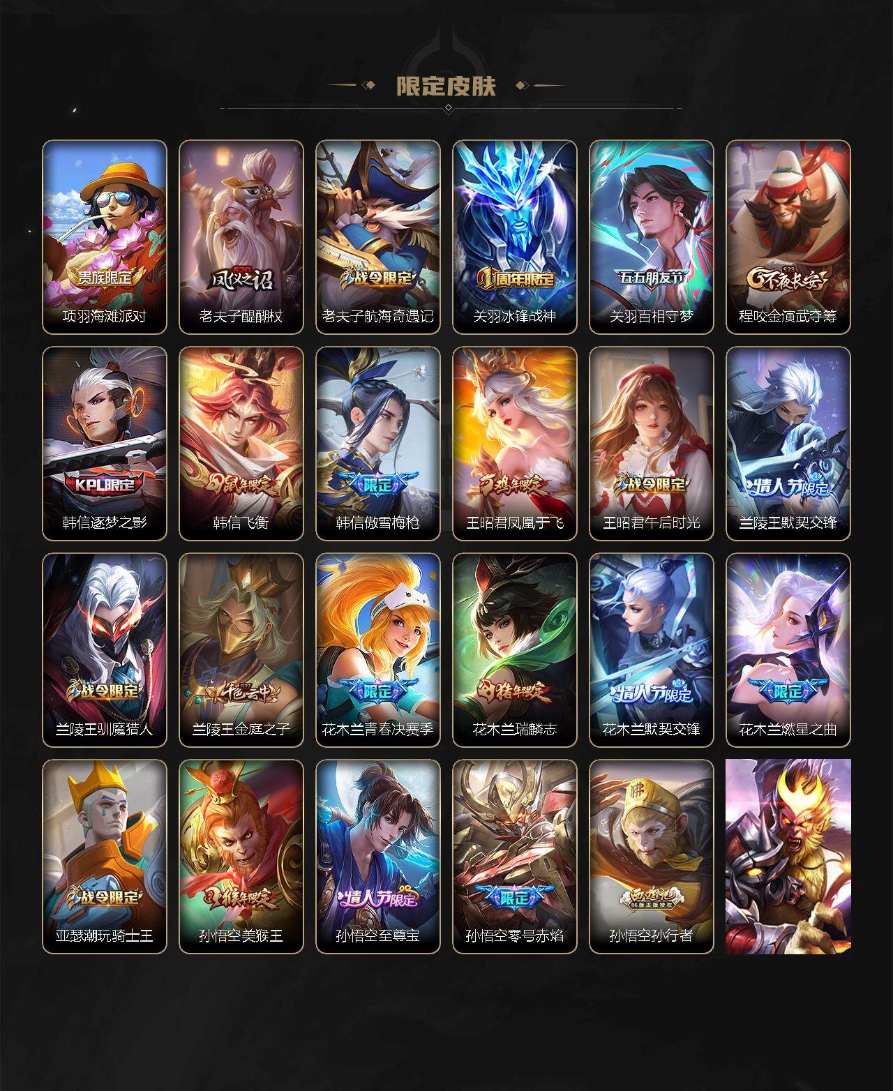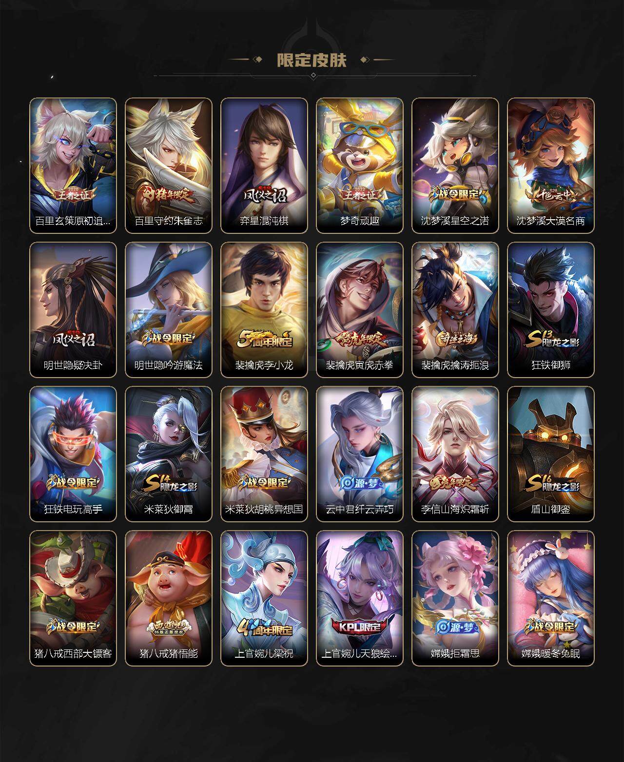 【限定皮肤】:铠冥王哈迪斯,大乔绒语心约,姜子牙天穹之誓,狄仁杰阴阳师,赵云皇家上将,赵云引擎之心,墨子神迹守卫,嬴政优雅恋人,孙尚香蔷薇恋人,鲁班七号寅虎瑞焰,庄周高山流水,高渐离死亡摇滚,钟无艳超时空战士,孙膑天狼运算者,扁鹊奇幻香踪,白起夜都怪侠,芈月重明,芈月幻夜卜梦,吕布御风骁将,周瑜赤莲之焰,元歌云间偶戏,元歌无心,夏侯惇朔风刀,甄姬游园惊梦,甄姬落雪兰心,曹操天狼征服者,典韦穷奇,典韦岱宗,马可波罗逐梦之星,马可波罗暗影游猎,马可波罗深海之息,马可波罗山海玄木吟,狄仁杰魔术师,狄仁杰万华元夜,达摩星际陆战队,达摩沙漠行僧,项羽海滩派对,老夫子醍醐杖,老夫子航海奇遇记,关羽冰锋战神,关羽百相守梦,程咬金演武夺筹,韩信逐梦之影,韩信飞衡,韩信傲雪梅枪,王昭君凤凰于飞,王昭君午后时光,兰陵王默契交锋,兰陵王驯魔猎人,兰陵王金庭之子,花木兰青春决赛季,花木兰瑞麟志,花木兰默契交锋,花木兰燃星之曲,亚瑟潮玩骑士王,孙悟空美猴王,孙悟空至尊宝,孙悟空零号赤焰,孙悟空孙行者,孙悟空齐天大圣,牛魔御旌,后羿如梦令,后羿圣弓游侠,刘备百相守梦,张飞百相守梦,李元芳银河之约,李元芳云中旅人,虞姬启明星使,钟馗驱傩正仪,杨戬潮玩骑兵,干将莫邪冰霜恋舞曲,干将莫邪真爱魔法,雅典娜单词大作战,雅典娜黎明之约,蔡文姬繁星吟游,鬼谷子原初探秘者,鬼谷子五谷丰年,诸葛亮武陵仙君,诸葛亮时雨天