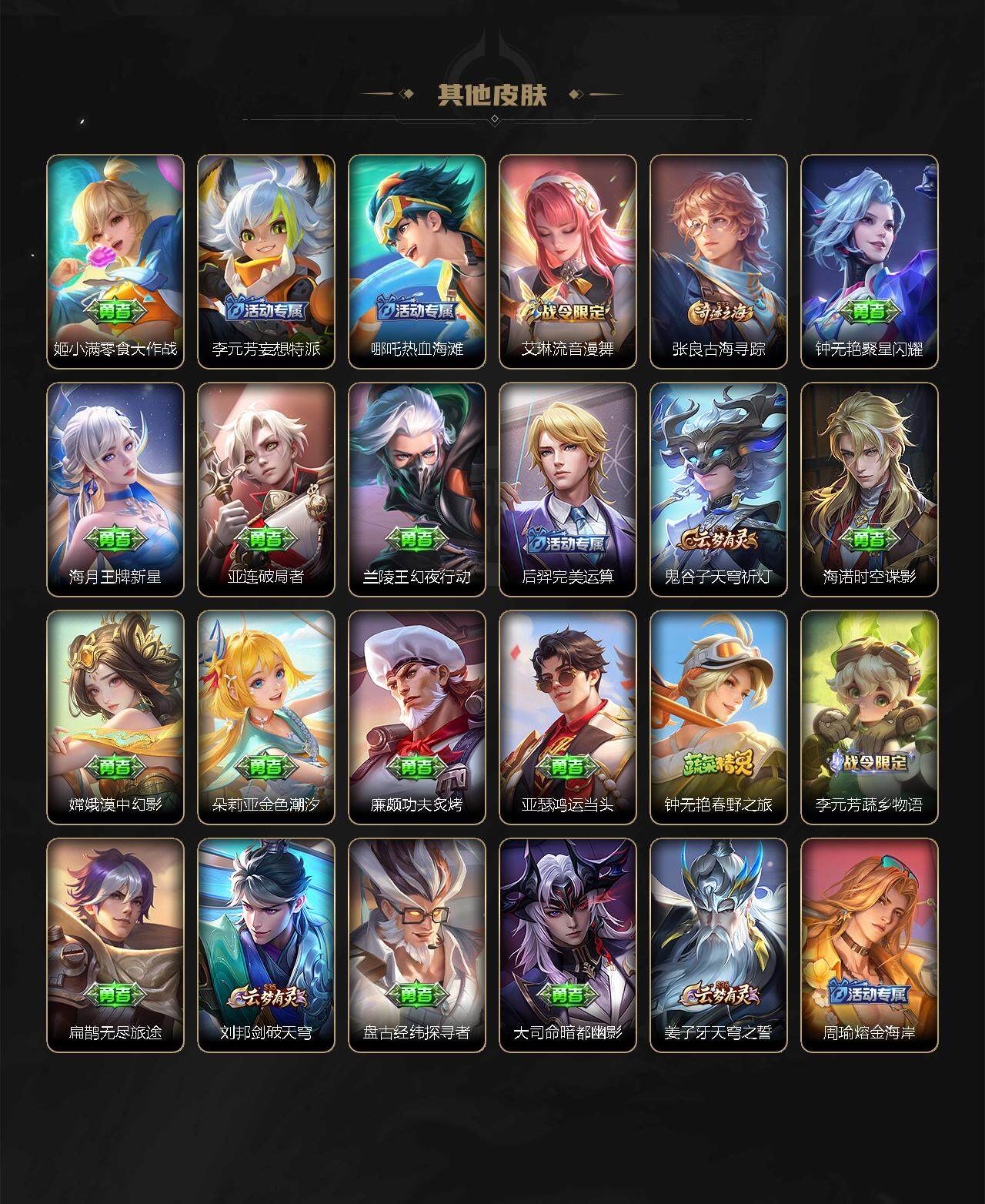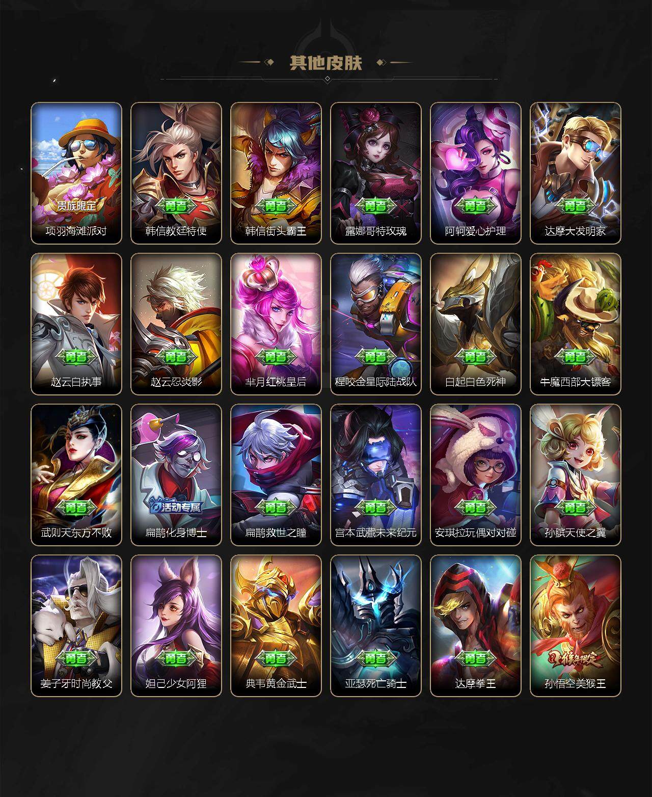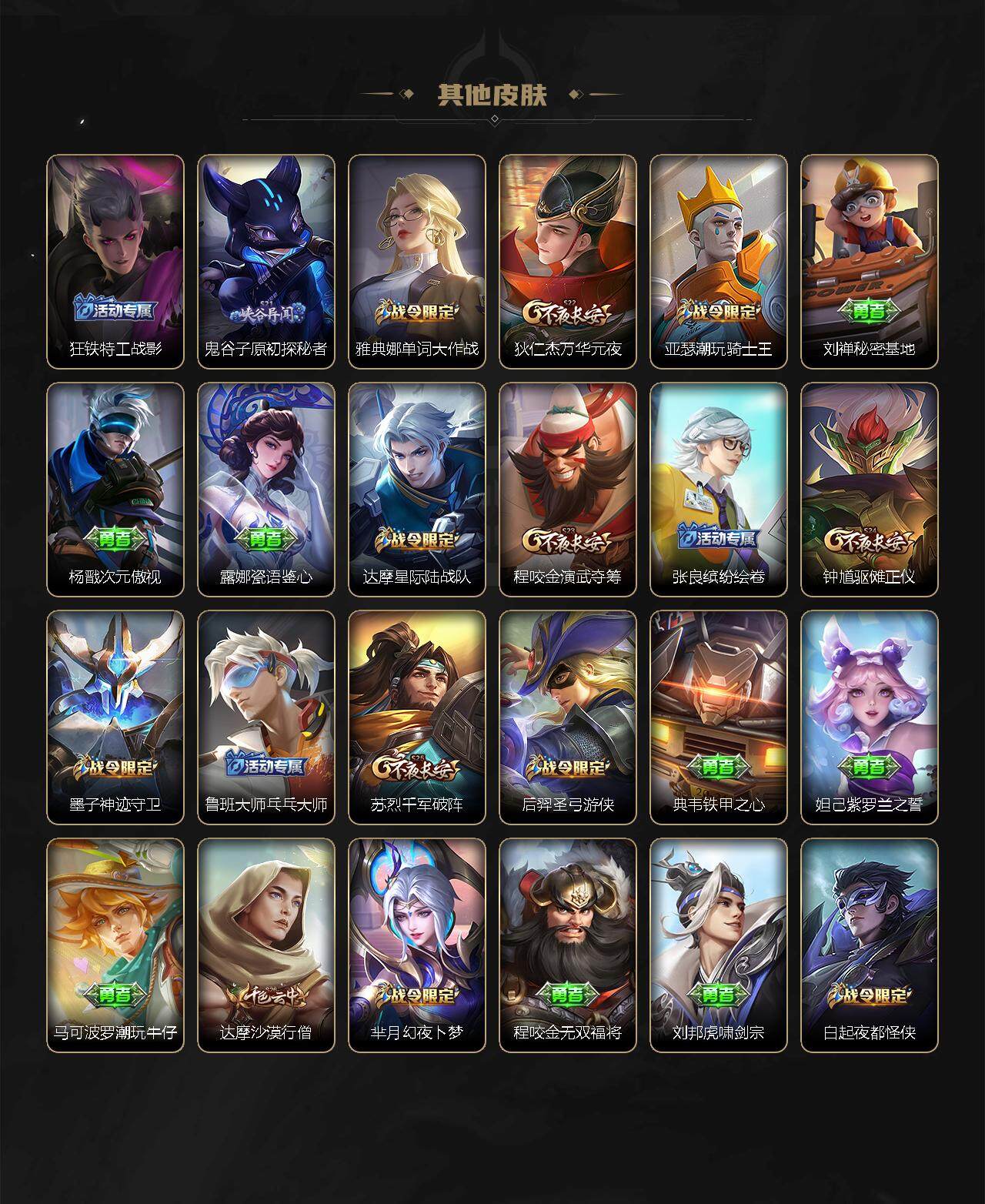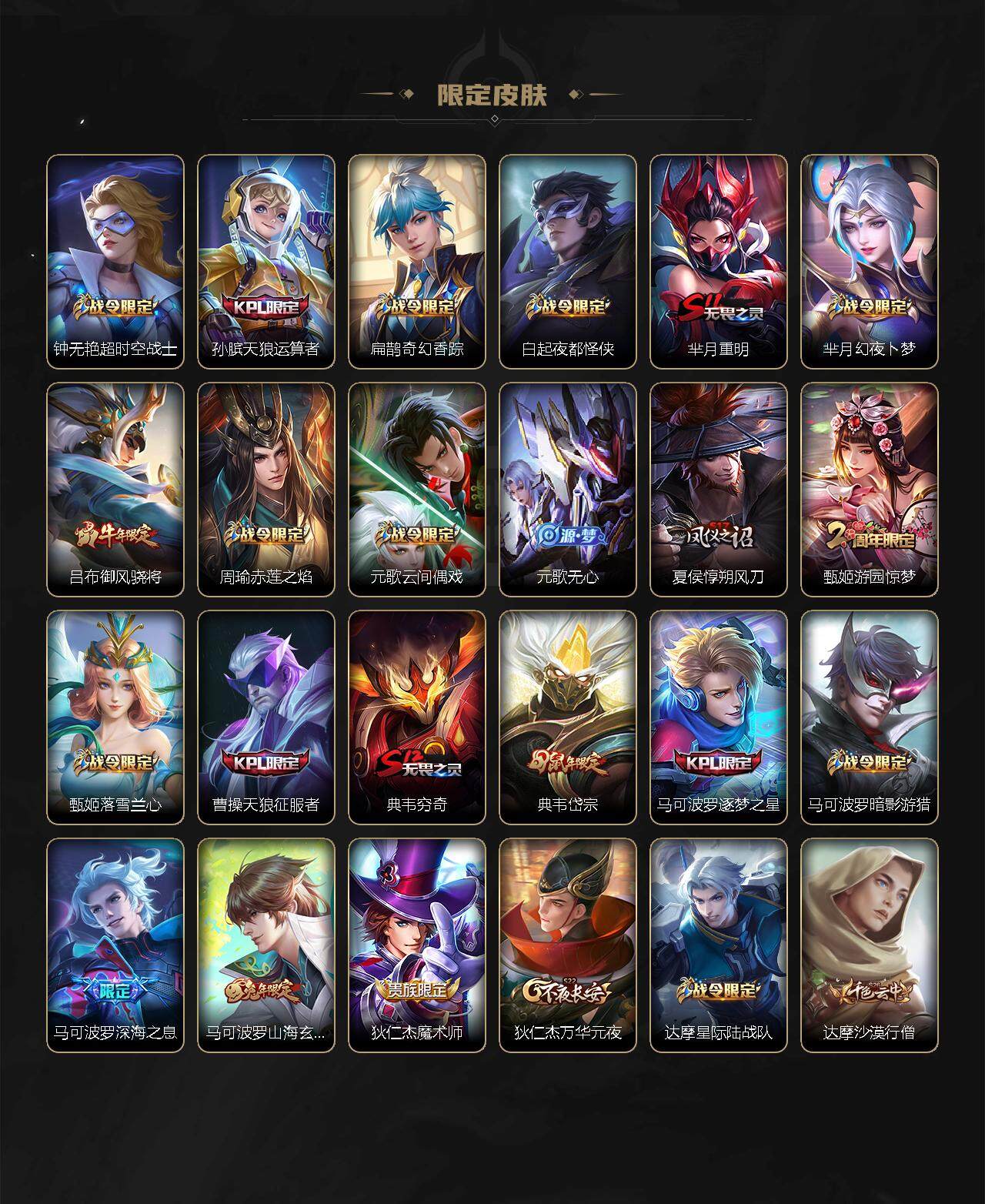 【限定皮肤】:铠冥王哈迪斯,大乔绒语心约,姜子牙天穹之誓,狄仁杰阴阳师,赵云皇家上将,赵云引擎之心,墨子神迹守卫,嬴政优雅恋人,孙尚香蔷薇恋人,鲁班七号寅虎瑞焰,庄周高山流水,高渐离死亡摇滚,钟无艳超时空战士,孙膑天狼运算者,扁鹊奇幻香踪,白起夜都怪侠,芈月重明,芈月幻夜卜梦,吕布御风骁将,周瑜赤莲之焰,元歌云间偶戏,元歌无心,夏侯惇朔风刀,甄姬游园惊梦,甄姬落雪兰心,曹操天狼征服者,典韦穷奇,典韦岱宗,马可波罗逐梦之星,马可波罗暗影游猎,马可波罗深海之息,马可波罗山海玄木吟,狄仁杰魔术师,狄仁杰万华元夜,达摩星际陆战队,达摩沙漠行僧,项羽海滩派对,老夫子醍醐杖,老夫子航海奇遇记,关羽冰锋战神,关羽百相守梦,程咬金演武夺筹,韩信逐梦之影,韩信飞衡,韩信傲雪梅枪,王昭君凤凰于飞,王昭君午后时光,兰陵王默契交锋,兰陵王驯魔猎人,兰陵王金庭之子,花木兰青春决赛季,花木兰瑞麟志,花木兰默契交锋,花木兰燃星之曲,亚瑟潮玩骑士王,孙悟空美猴王,孙悟空至尊宝,孙悟空零号赤焰,孙悟空孙行者,孙悟空齐天大圣,牛魔御旌,后羿如梦令,后羿圣弓游侠,刘备百相守梦,张飞百相守梦,李元芳银河之约,李元芳云中旅人,虞姬启明星使,钟馗驱傩正仪,杨戬潮玩骑兵,干将莫邪冰霜恋舞曲,干将莫邪真爱魔法,雅典娜单词大作战,雅典娜黎明之约,蔡文姬繁星吟游,鬼谷子原初探秘者,鬼谷子五谷丰年,诸葛亮武陵仙君,诸葛亮时雨天