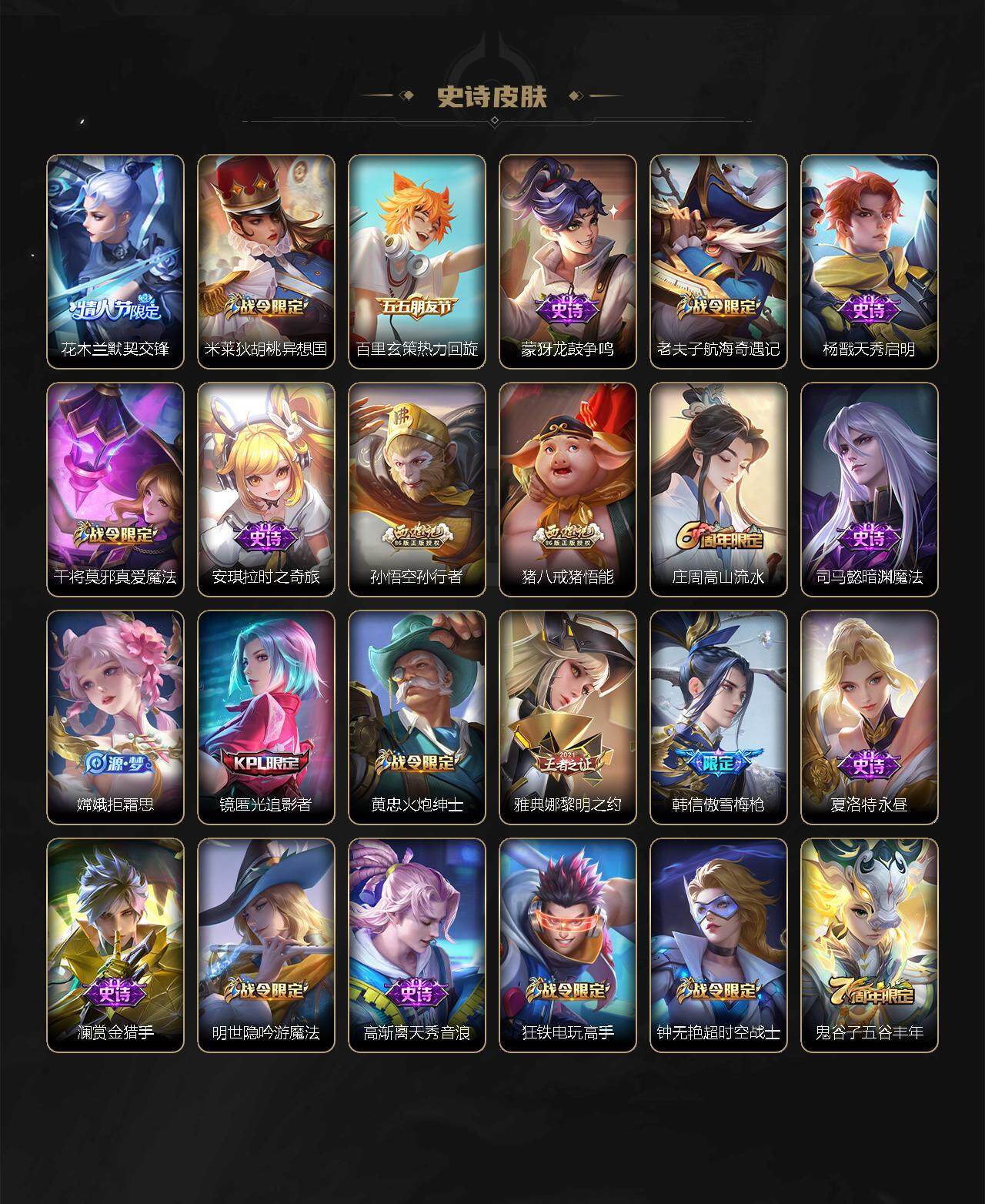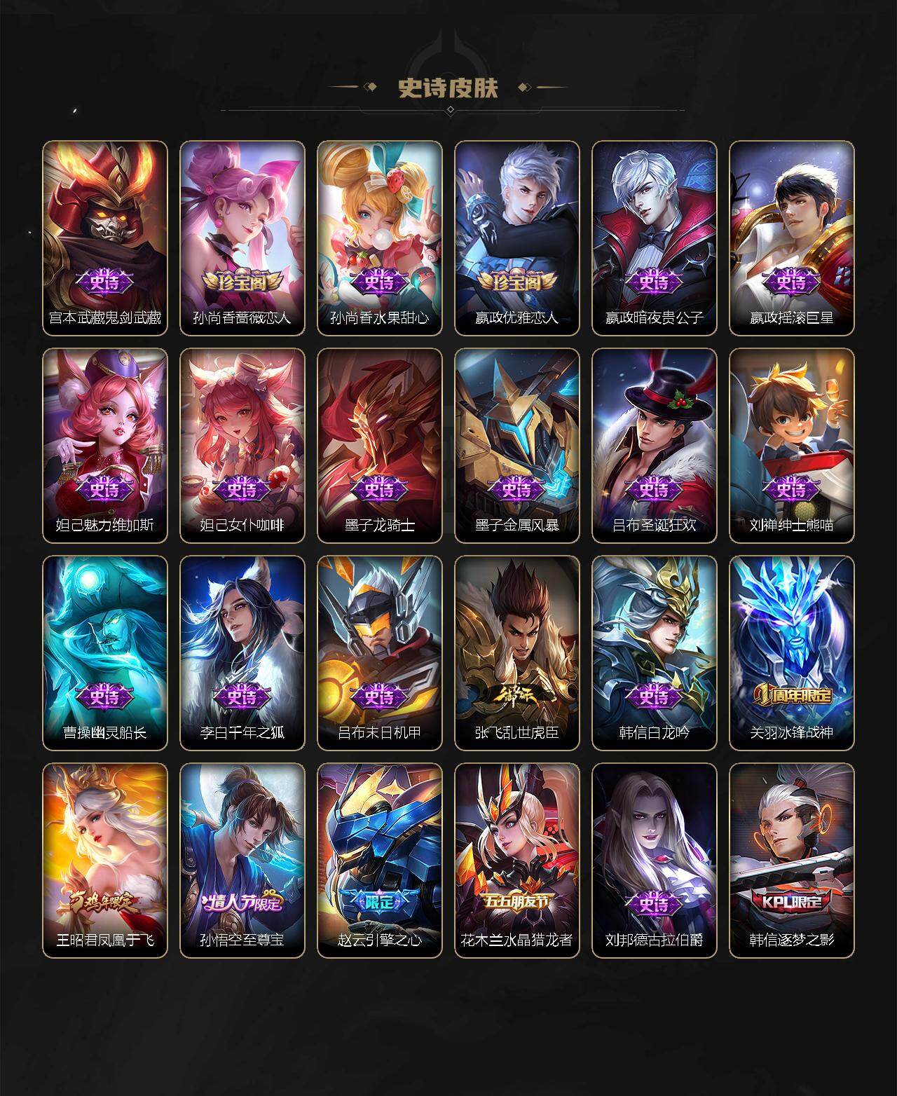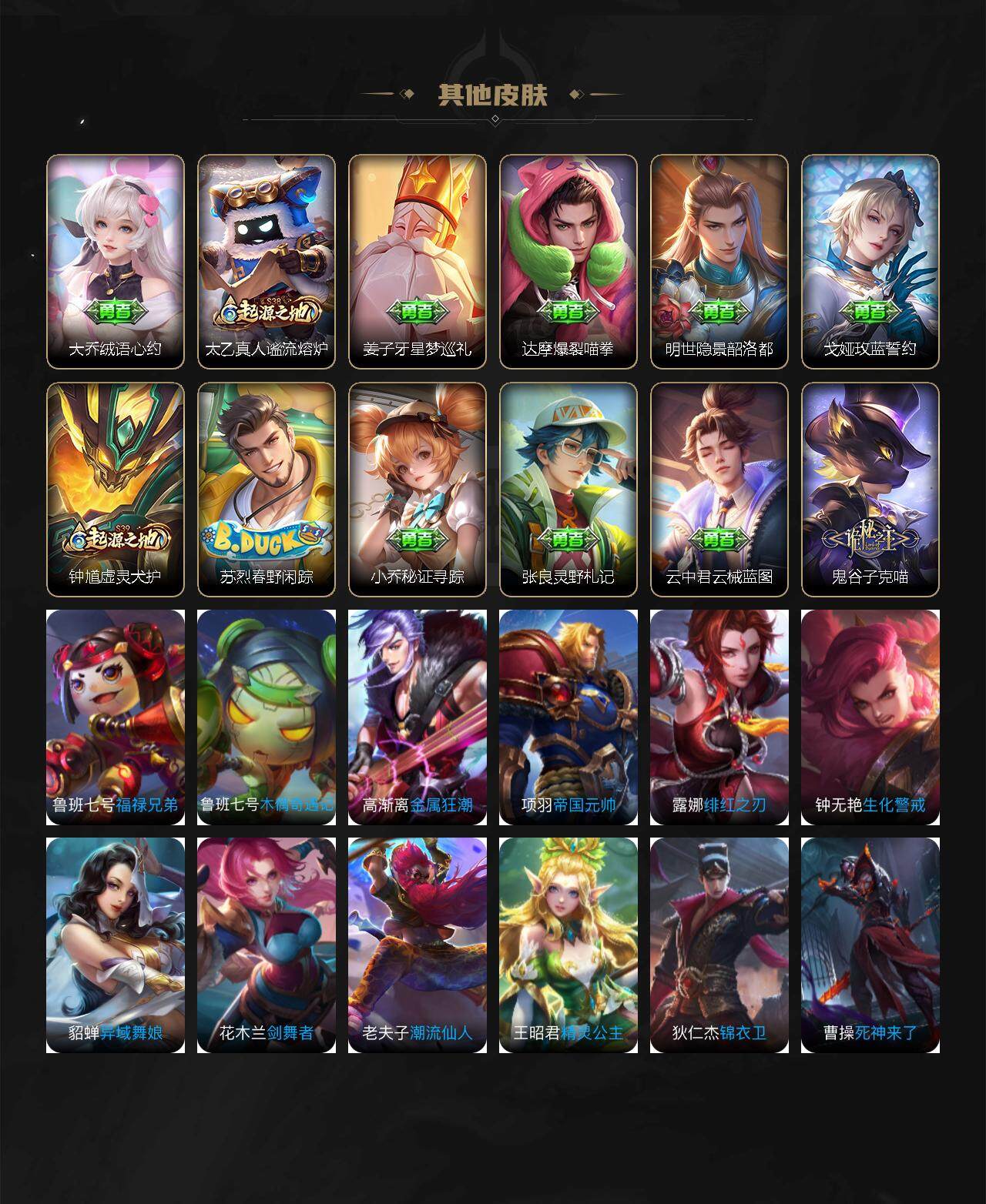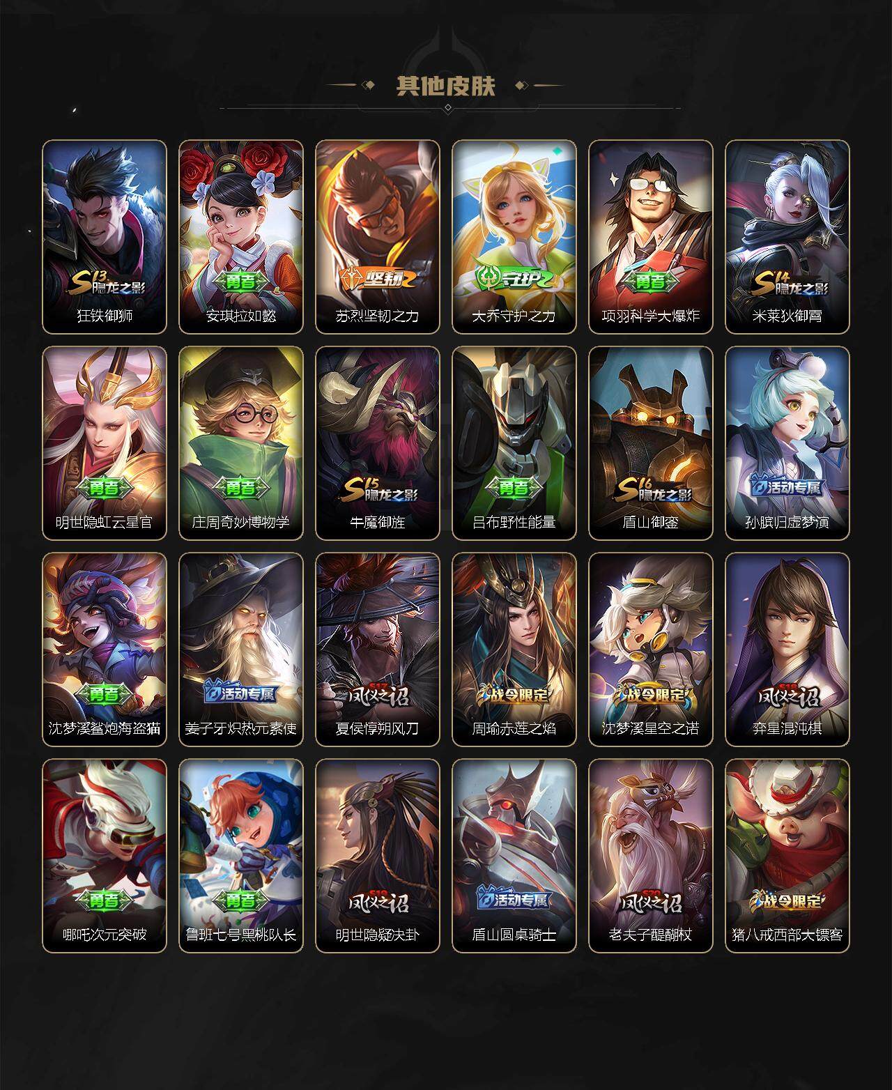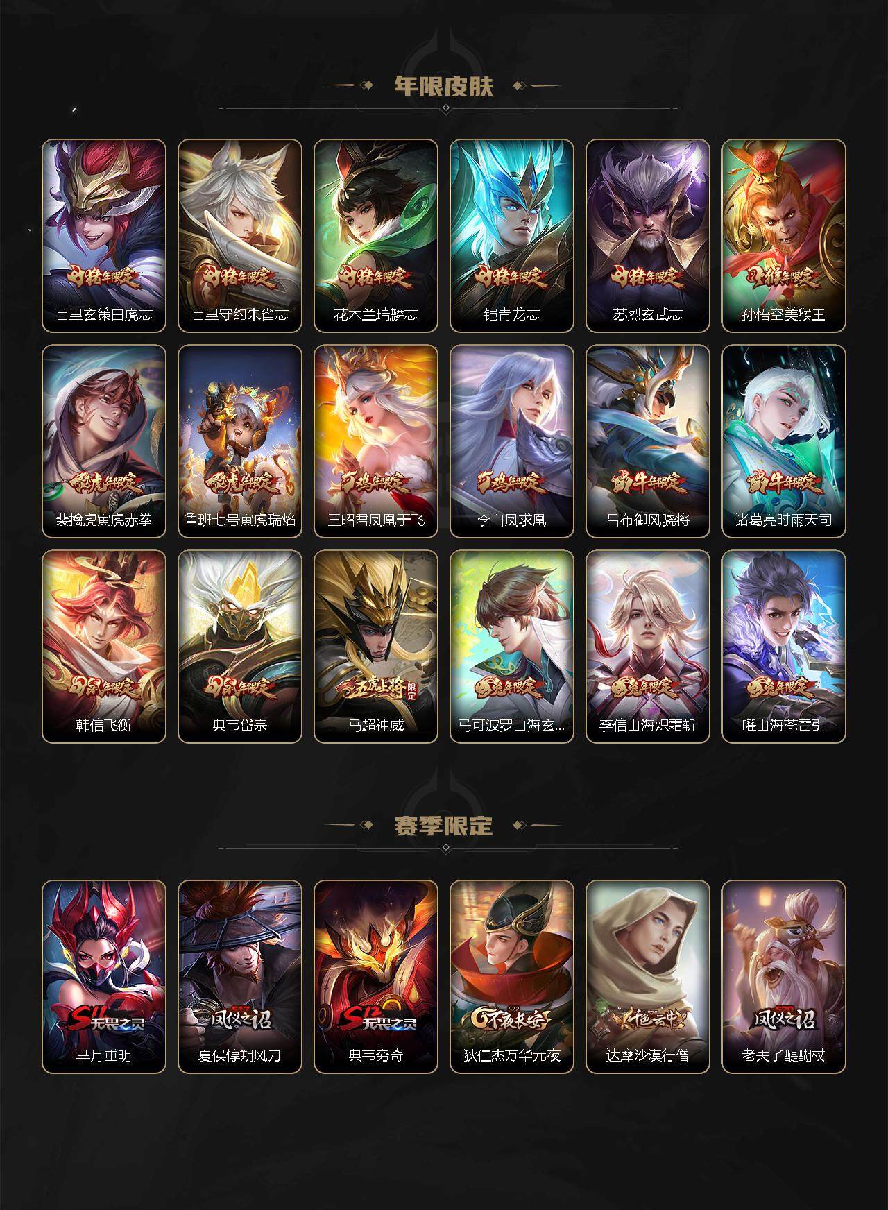 【限定皮肤】:铠冥王哈迪斯,大乔绒语心约,姜子牙天穹之誓,狄仁杰阴阳师,赵云皇家上将,赵云引擎之心,墨子神迹守卫,嬴政优雅恋人,孙尚香蔷薇恋人,鲁班七号寅虎瑞焰,庄周高山流水,高渐离死亡摇滚,钟无艳超时空战士,孙膑天狼运算者,扁鹊奇幻香踪,白起夜都怪侠,芈月重明,芈月幻夜卜梦,吕布御风骁将,周瑜赤莲之焰,元歌云间偶戏,元歌无心,夏侯惇朔风刀,甄姬游园惊梦,甄姬落雪兰心,曹操天狼征服者,典韦穷奇,典韦岱宗,马可波罗逐梦之星,马可波罗暗影游猎,马可波罗深海之息,马可波罗山海玄木吟,狄仁杰魔术师,狄仁杰万华元夜,达摩星际陆战队,达摩沙漠行僧,项羽海滩派对,老夫子醍醐杖,老夫子航海奇遇记,关羽冰锋战神,关羽百相守梦,程咬金演武夺筹,韩信逐梦之影,韩信飞衡,韩信傲雪梅枪,王昭君凤凰于飞,王昭君午后时光,兰陵王默契交锋,兰陵王驯魔猎人,兰陵王金庭之子,花木兰青春决赛季,花木兰瑞麟志,花木兰默契交锋,花木兰燃星之曲,亚瑟潮玩骑士王,孙悟空美猴王,孙悟空至尊宝,孙悟空零号赤焰,孙悟空孙行者,孙悟空齐天大圣,牛魔御旌,后羿如梦令,后羿圣弓游侠,刘备百相守梦,张飞百相守梦,李元芳银河之约,李元芳云中旅人,虞姬启明星使,钟馗驱傩正仪,杨戬潮玩骑兵,干将莫邪冰霜恋舞曲,干将莫邪真爱魔法,雅典娜单词大作战,雅典娜黎明之约,蔡文姬繁星吟游,鬼谷子原初探秘者,鬼谷子五谷丰年,诸葛亮武陵仙君,诸葛亮时雨天
