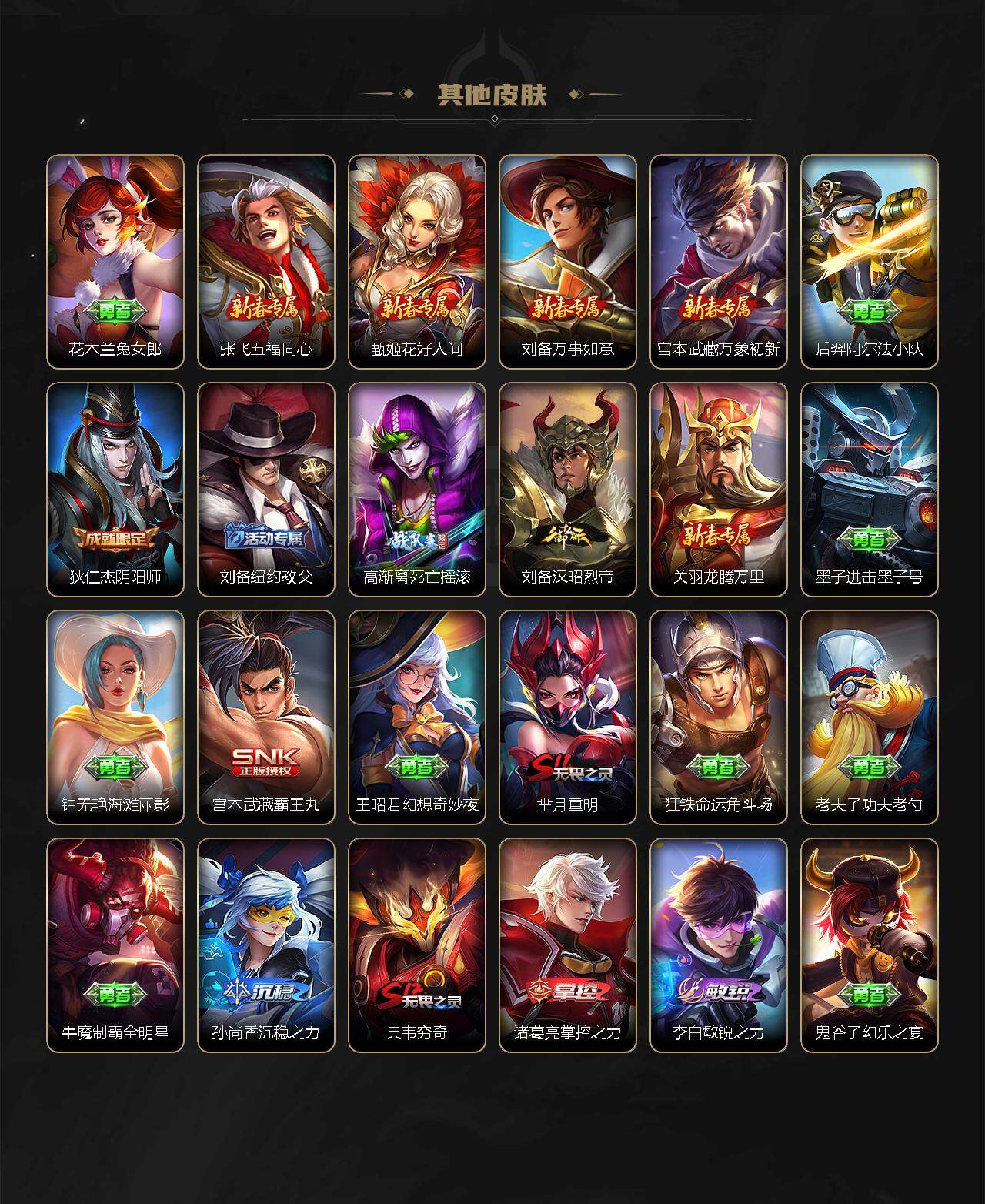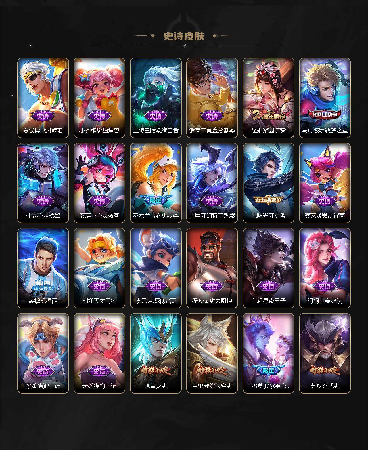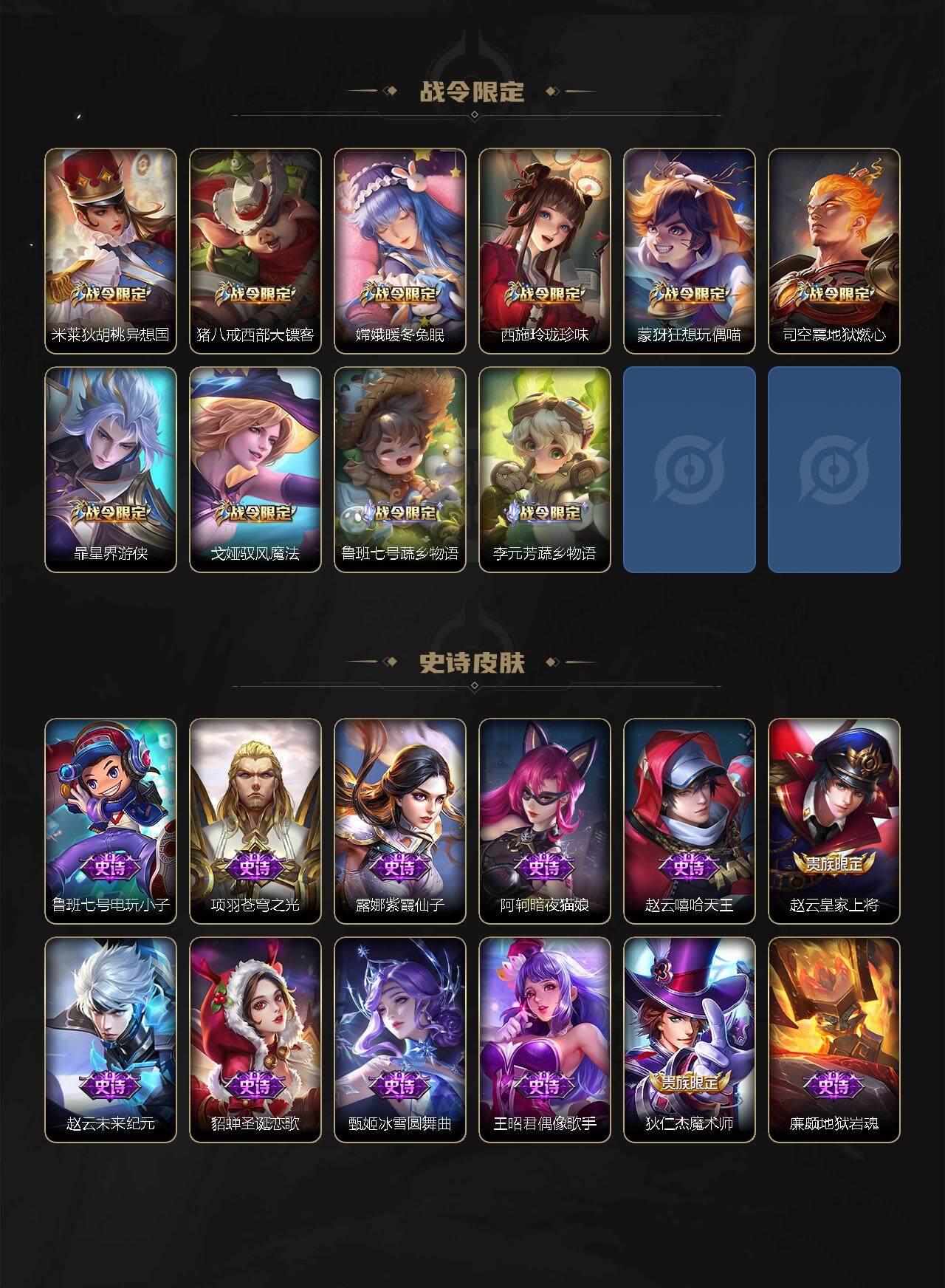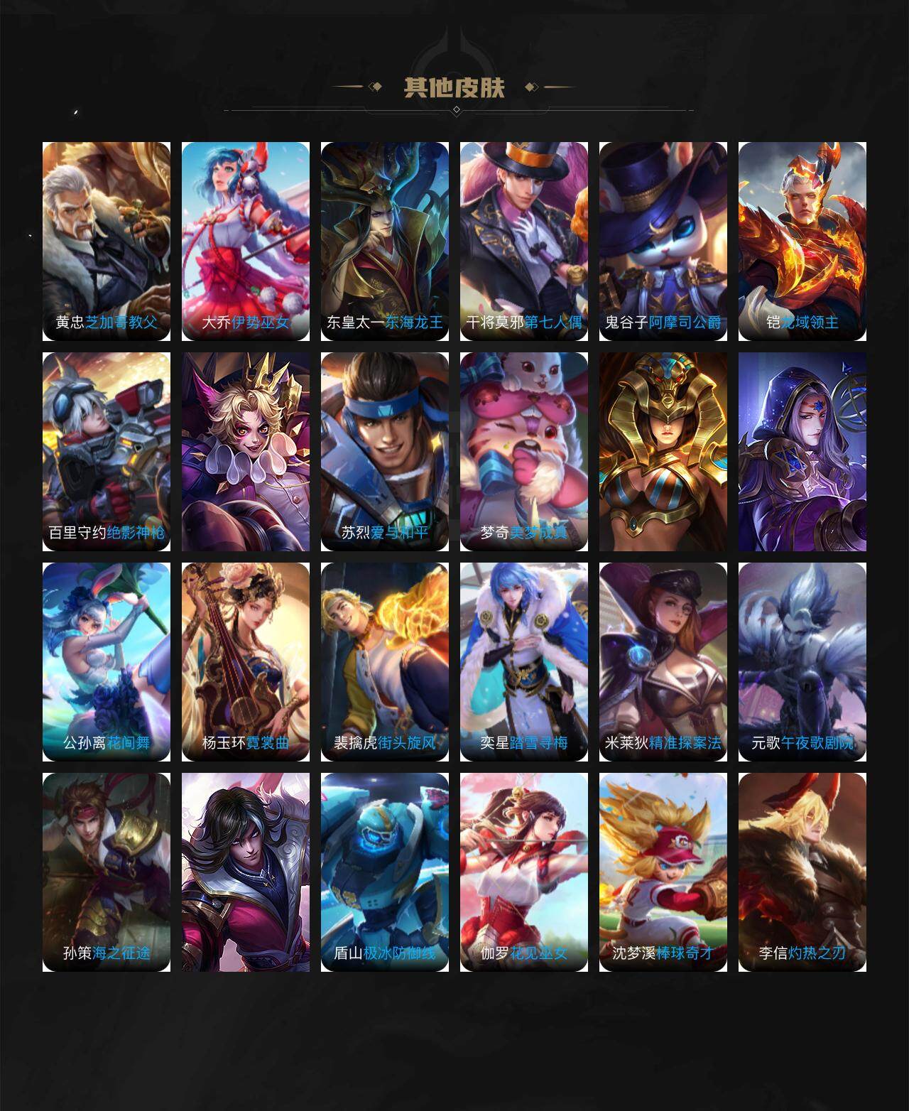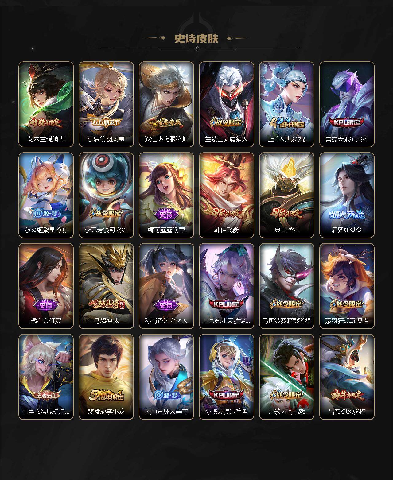 【限定皮肤】:铠冥王哈迪斯,大乔绒语心约,姜子牙天穹之誓,狄仁杰阴阳师,赵云皇家上将,赵云引擎之心,墨子神迹守卫,嬴政优雅恋人,孙尚香蔷薇恋人,鲁班七号寅虎瑞焰,庄周高山流水,高渐离死亡摇滚,钟无艳超时空战士,孙膑天狼运算者,扁鹊奇幻香踪,白起夜都怪侠,芈月重明,芈月幻夜卜梦,吕布御风骁将,周瑜赤莲之焰,元歌云间偶戏,元歌无心,夏侯惇朔风刀,甄姬游园惊梦,甄姬落雪兰心,曹操天狼征服者,典韦穷奇,典韦岱宗,马可波罗逐梦之星,马可波罗暗影游猎,马可波罗深海之息,马可波罗山海玄木吟,狄仁杰魔术师,狄仁杰万华元夜,达摩星际陆战队,达摩沙漠行僧,项羽海滩派对,老夫子醍醐杖,老夫子航海奇遇记,关羽冰锋战神,关羽百相守梦,程咬金演武夺筹,韩信逐梦之影,韩信飞衡,韩信傲雪梅枪,王昭君凤凰于飞,王昭君午后时光,兰陵王默契交锋,兰陵王驯魔猎人,兰陵王金庭之子,花木兰青春决赛季,花木兰瑞麟志,花木兰默契交锋,花木兰燃星之曲,亚瑟潮玩骑士王,孙悟空美猴王,孙悟空至尊宝,孙悟空零号赤焰,孙悟空孙行者,孙悟空齐天大圣,牛魔御旌,后羿如梦令,后羿圣弓游侠,刘备百相守梦,张飞百相守梦,李元芳银河之约,李元芳云中旅人,虞姬启明星使,钟馗驱傩正仪,杨戬潮玩骑兵,干将莫邪冰霜恋舞曲,干将莫邪真爱魔法,雅典娜单词大作战,雅典娜黎明之约,蔡文姬繁星吟游,鬼谷子原初探秘者,鬼谷子五谷丰年,诸葛亮武陵仙君,诸葛亮时雨天