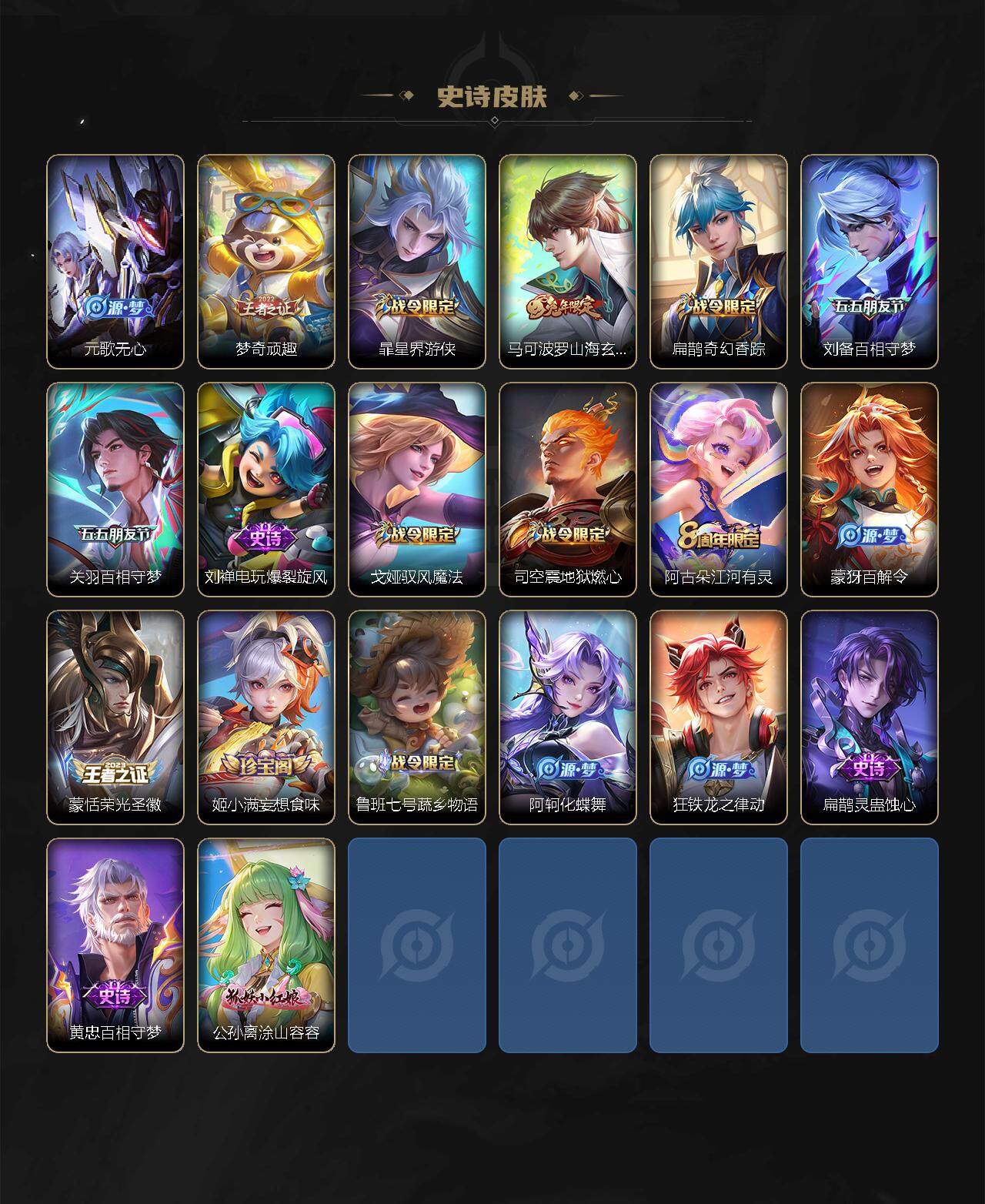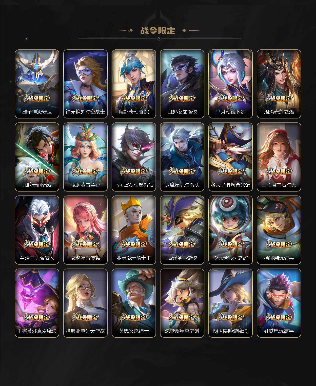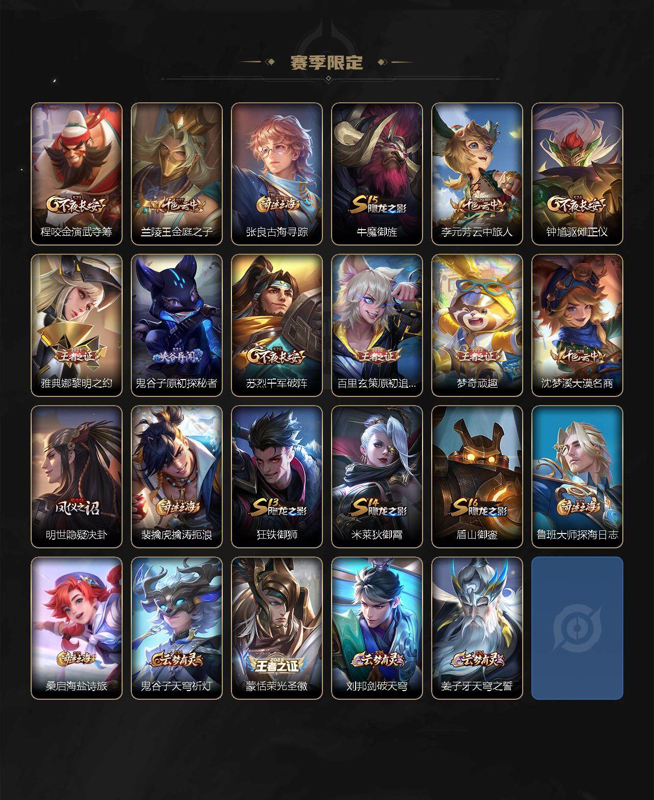 关羽冰锋战神,裴擒虎李小龙,上官婉儿梁祝,吕布御风骁将,诸葛亮时雨天司,马超神威,典韦岱宗,韩信飞衡,曹操天狼征服者,孙膑天狼运算者,上官婉儿天狼绘梦者,马可波罗逐梦之星,韩信逐梦之影,铠青龙志,百里玄策白虎志,花木兰瑞麟志,苏烈玄武志,百里守约朱雀志,王昭君凤凰于飞,花木兰默契交锋,兰陵王默契交锋,后羿如梦令,孙悟空至尊宝,裴擒虎梅西,干将莫邪冰霜恋舞曲,花木兰青春决赛季,赵云引擎之心,孙悟空美猴王,猪八戒猪悟能,孙悟空孙行者,镜匿光追影者,韩信傲雪梅枪,鲁班七号寅虎·瑞焰,裴擒虎寅虎·赤拳,马可波罗深海之息,李白诗剑行,马可波罗山海·玄木吟,澜愿照·九州拓,司空震愿照·山河定