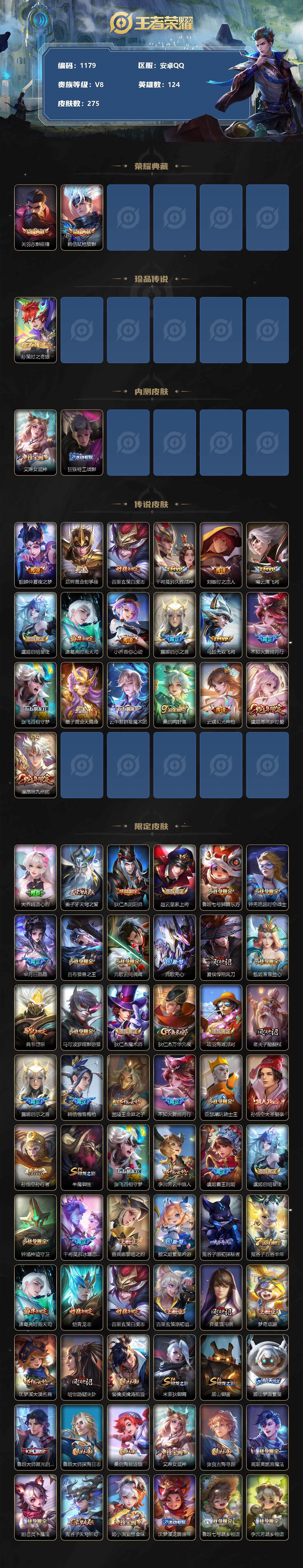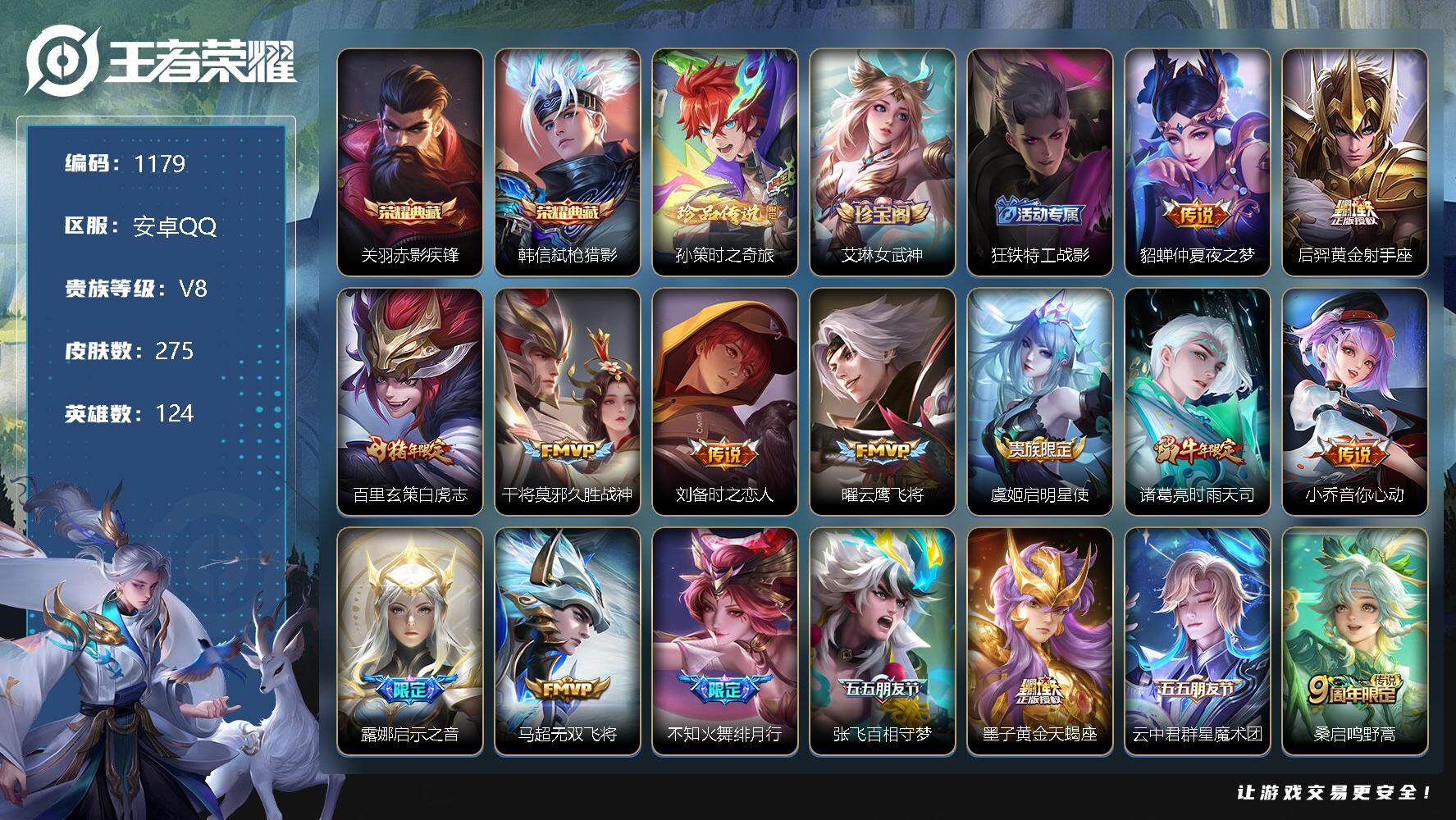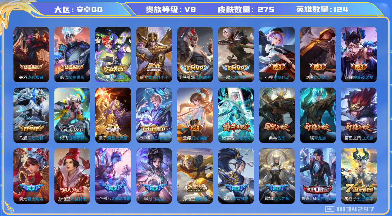 [11134297]【商品标题】:安卓Q-V8-最强王者段位-124英雄-275皮肤-2典藏-0珍品无双-0无双-1珍品传说-19传说-82史诗