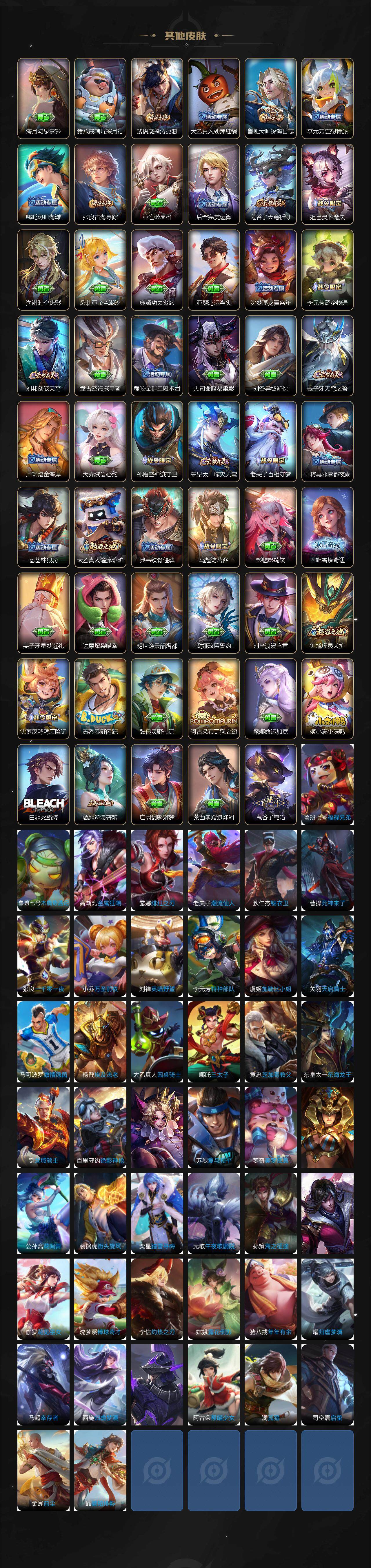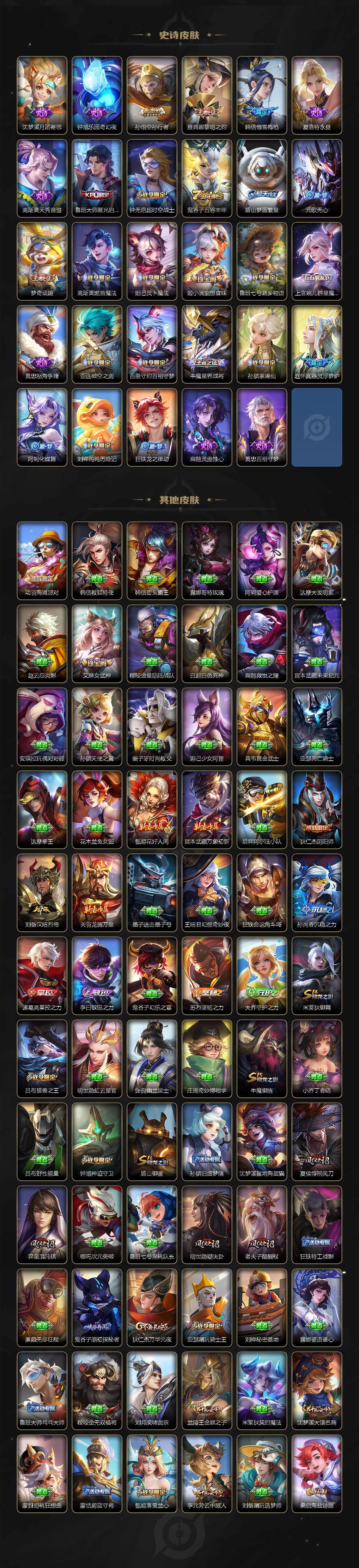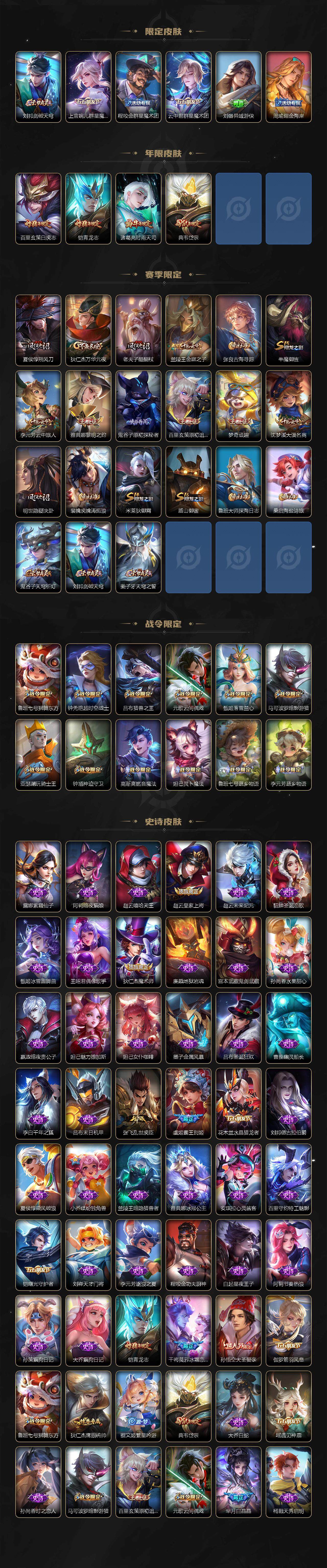 【限定皮肤】:大乔绒语心约,姜子牙天穹之誓,狄仁杰阴阳师,赵云皇家上将,鲁班七号狮舞东方,钟无艳超时空战士,芈月白晶晶,吕布猎兽之王,元歌云间偶戏,元歌无心,夏侯惇朔风刀,甄姬落雪兰心,典韦岱宗,马可波罗暗影游猎,狄仁杰魔术师,狄仁杰万华元夜,项羽海滩派对,老夫子醍醐杖,露娜启示之音,韩信傲雪梅枪,兰陵王金庭之子,不知火舞绯月行,亚瑟潮玩骑士王,孙悟空大圣娶亲,孙悟空孙行者,牛魔御旌,张飞百相守梦,李元芳云中旅人,虞姬霸王别姬,虞姬启明星使,钟馗神迹守卫,干将莫邪冰霜恋舞曲,雅典娜黎明之约,蔡文姬繁星吟游,鬼谷子原初探秘者,鬼谷子五谷丰年,诸葛亮时雨天司,铠青龙志,百里玄策白虎志,百里玄策原初追逐者,弈星混沌棋,梦奇顽趣,沈梦溪大漠名商,明世隐疑决卦,裴擒虎擒涛扼浪,米莱狄御霄,盾山御銮,盾山梦圆繁星,鲁班大师匿光启智者,鲁班大师探海日志,桑启海盐诗旅,艾琳女武神,张良古海寻踪,高渐离燃音魔法,妲己灵卜魔法,鬼谷子天穹祈灯,姬小满妄想食味,沈梦溪龙舞盛年,鲁班七号蔬乡物语,李元芳蔬乡物语,刘邦剑破天穹,上官婉儿群星魔术团,程咬金群星魔术团,云中君群星魔术团,刘备异域游侠,周瑜熔金海岸