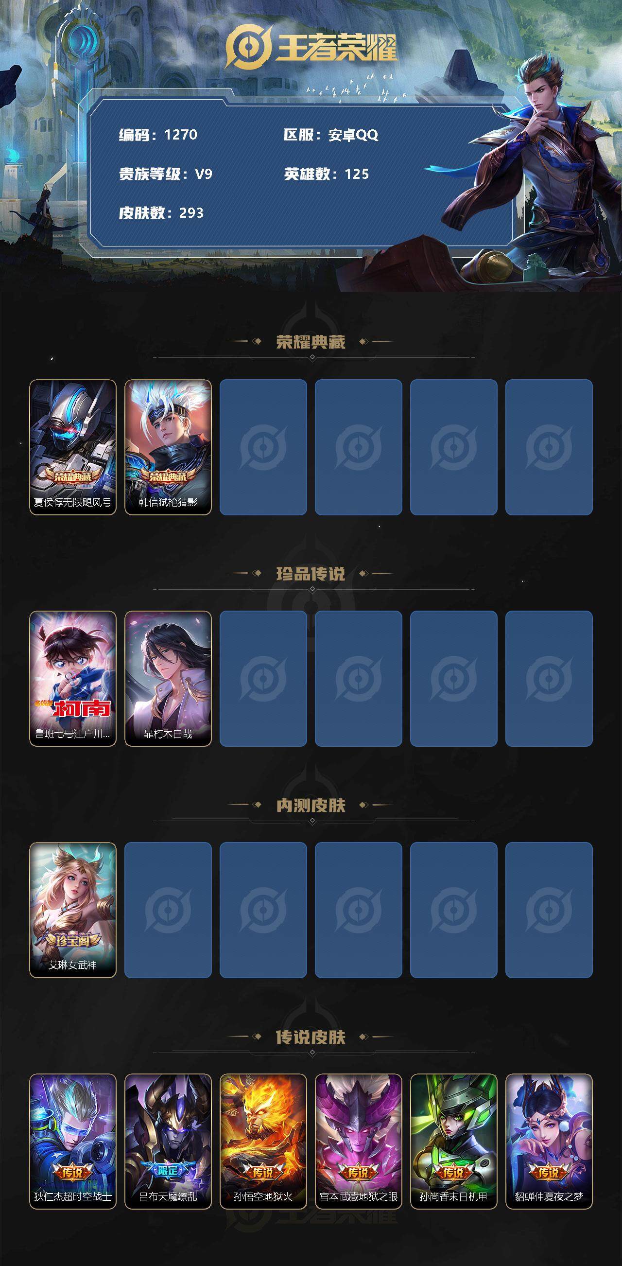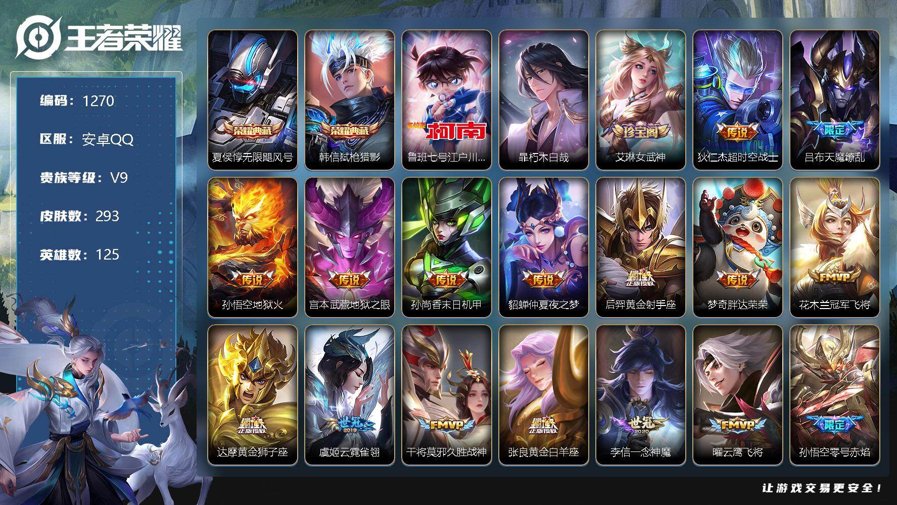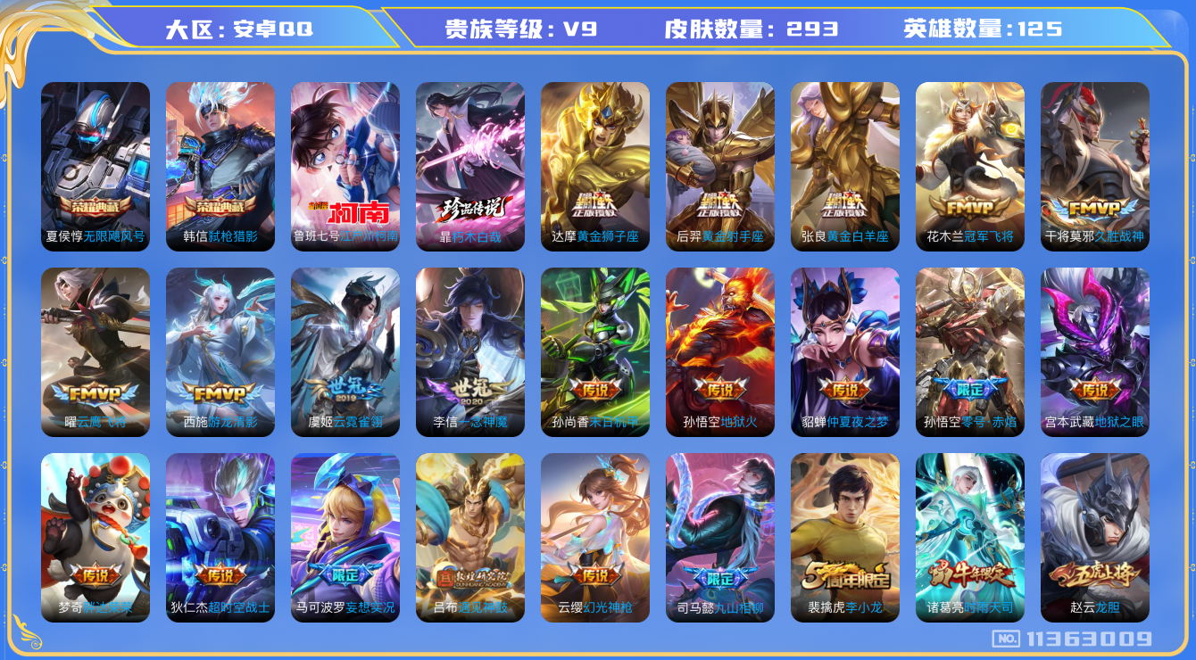 [11363009]【商品标题】:安卓Q-V9-至尊星耀IV段位-125英雄-293皮肤-2典藏-0珍品无双-0无双-2珍品传说-27传说-81史诗