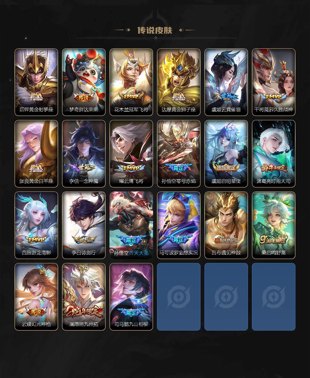 【传说皮肤】:司马懿九山相柳,澜愿照九州拓,云缨幻光神枪,桑启鸣野蒿,吕布遇见神鼓,马可波罗妄想实况,孙悟空齐天大圣,李白诗剑行,西施游龙清影,诸葛亮时雨天司,虞姬启明星使,孙悟空零号赤焰,曜云鹰飞将,李信一念神魔,张良黄金白羊座,干将莫邪久胜战神,虞姬云霓雀翎,达摩黄金狮子座,花木兰冠军飞将,梦奇胖达荣荣,后羿黄金射手座,貂蝉仲夏夜之梦,孙尚香末日机甲,宫本武藏地狱之眼,孙悟空地狱火,吕布天魔缭乱,狄仁杰超时空战士