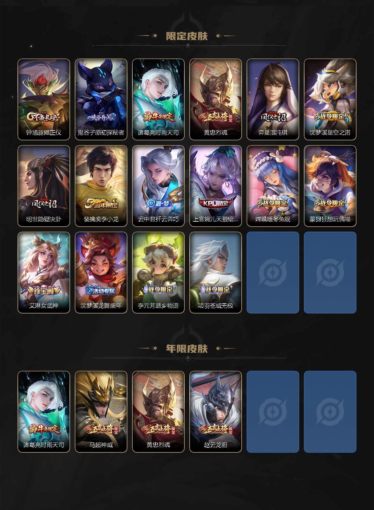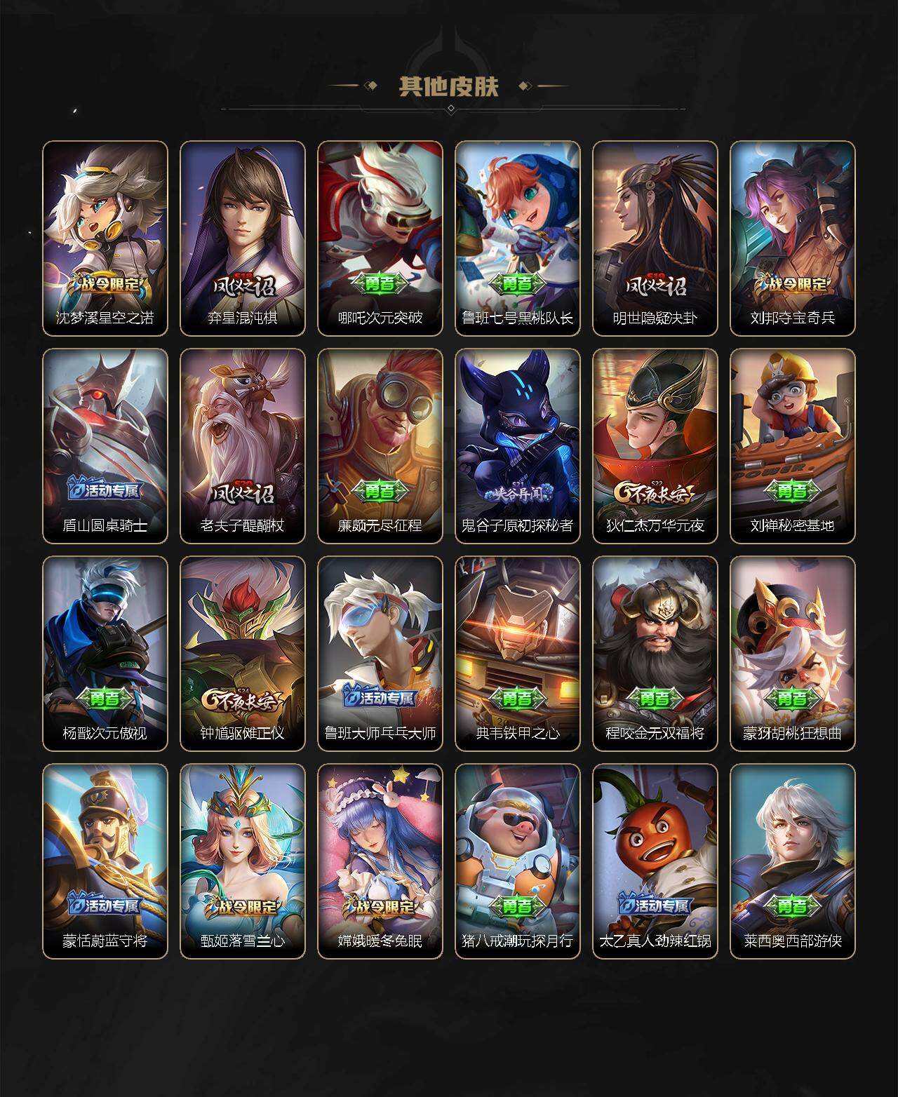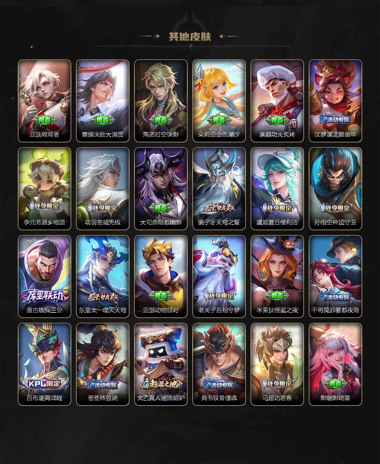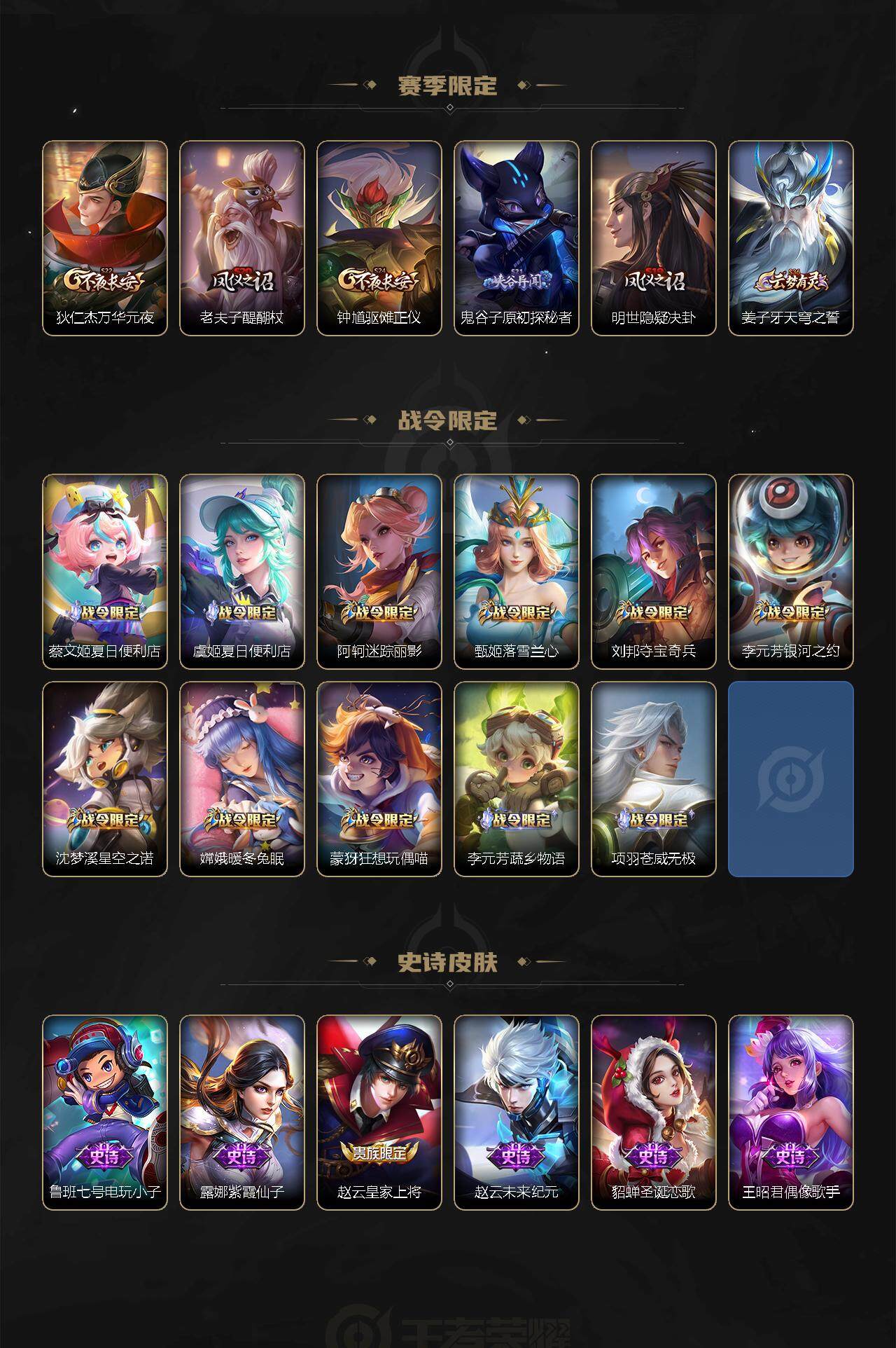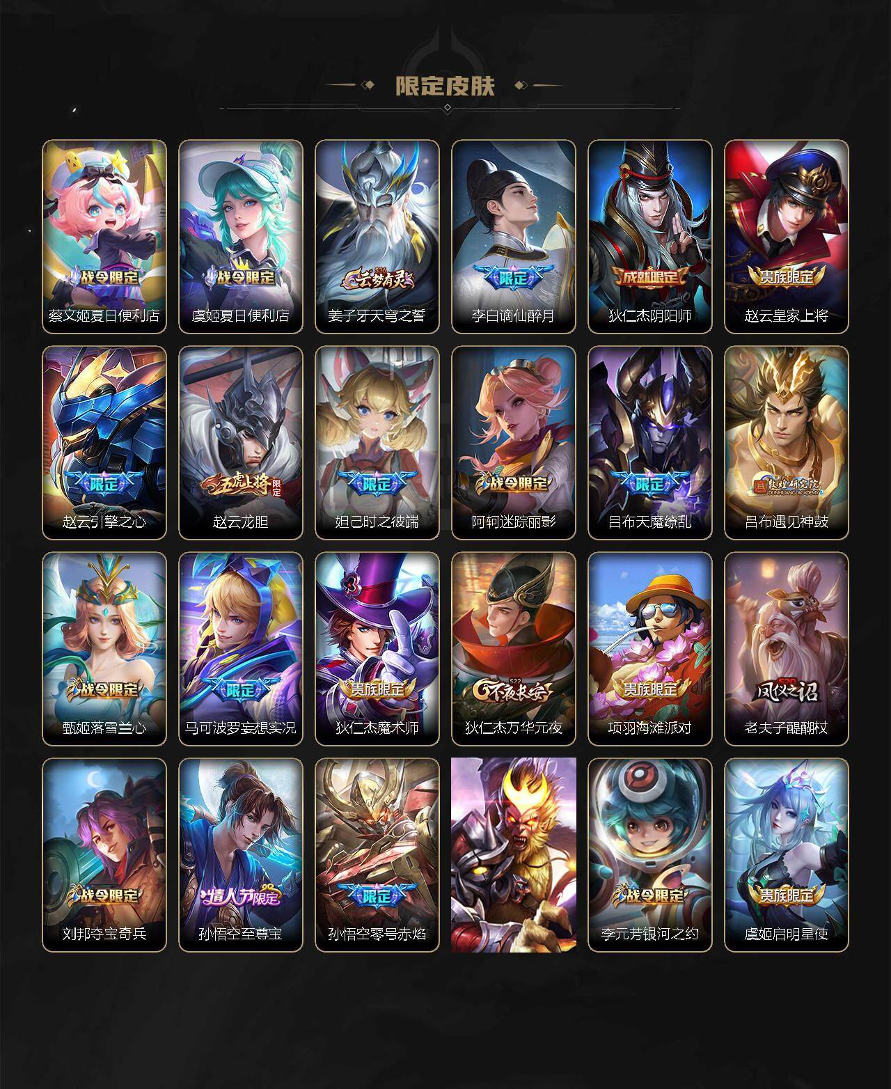 【限定皮肤】:蔡文姬夏日便利店,虞姬夏日便利店,姜子牙天穹之誓,李白谪仙醉月,狄仁杰阴阳师,赵云皇家上将,赵云引擎之心,赵云龙胆,妲己时之彼端,阿轲迷踪丽影,吕布天魔缭乱,吕布遇见神鼓,甄姬落雪兰心,马可波罗妄想实况,狄仁杰魔术师,狄仁杰万华元夜,项羽海滩派对,老夫子醍醐杖,刘邦夺宝奇兵,孙悟空至尊宝,孙悟空零号赤焰,孙悟空齐天大圣,李元芳银河之约,虞姬启明星使,钟馗驱傩正仪,鬼谷子原初探秘者,诸葛亮时雨天司,黄忠烈魂,弈星混沌棋,沈梦溪星空之诺,明世隐疑决卦,裴擒虎李小龙,云中君纤云弄巧,上官婉儿天狼绘梦者,嫦娥暖冬兔眠,蒙犽狂想玩偶喵,艾琳女武神,沈梦溪龙舞盛年,李元芳蔬乡物语,项羽苍威无极
