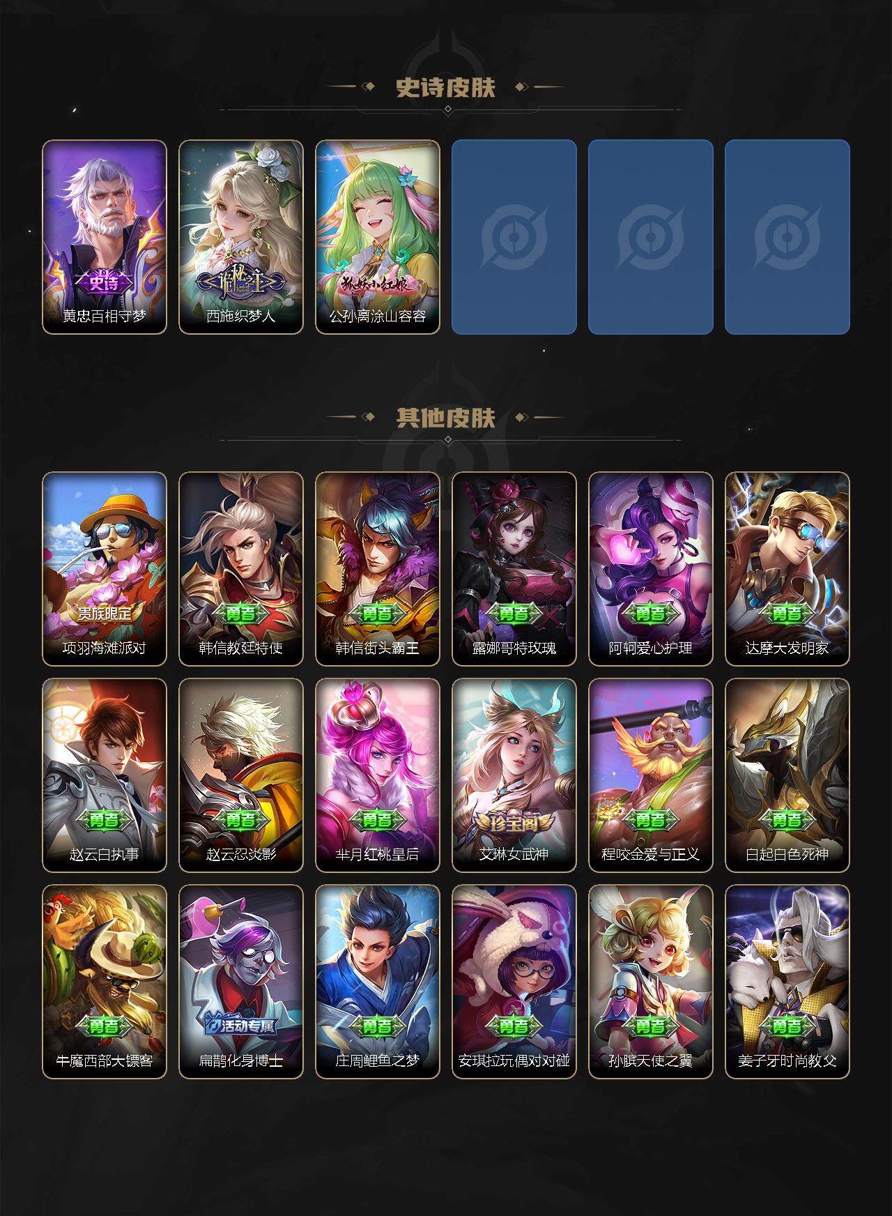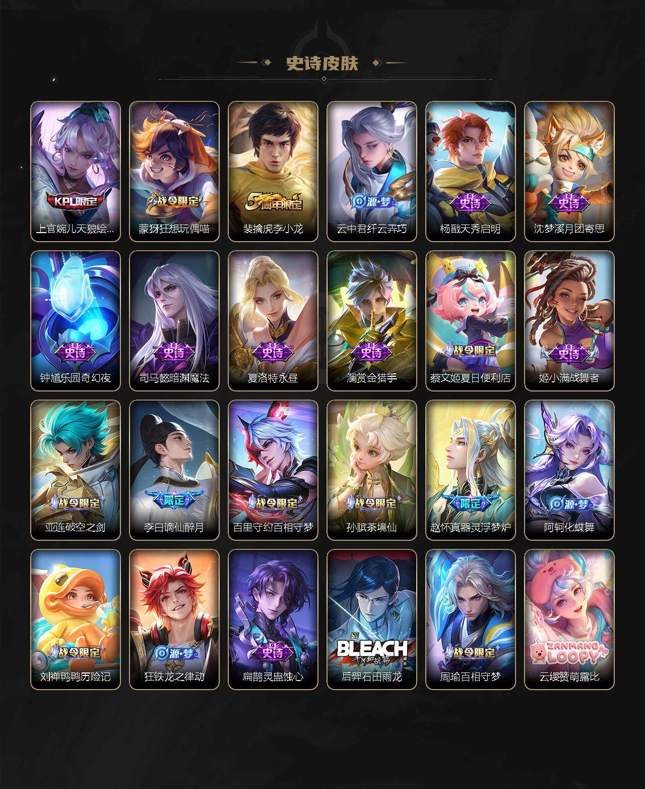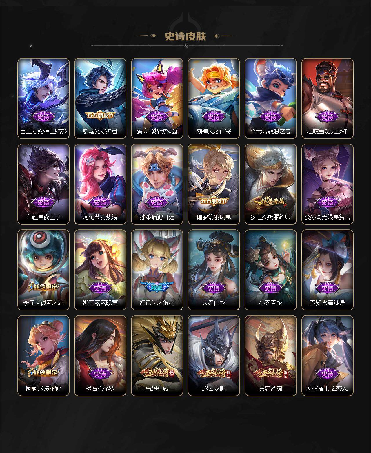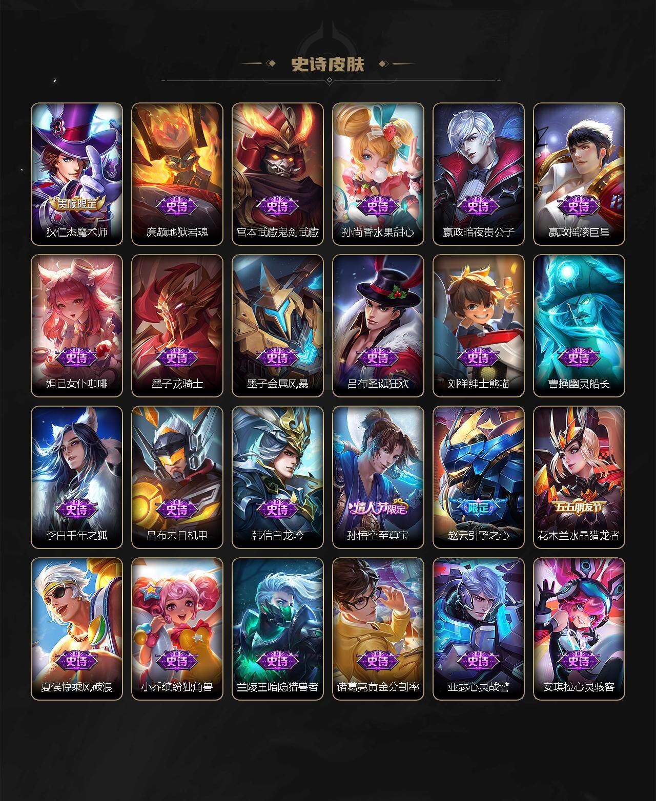 【史诗皮肤】:鲁班七号电玩小子,露娜紫霞仙子,赵云皇家上将,赵云未来纪元,貂蝉圣诞恋歌,王昭君偶像歌手,狄仁杰魔术师,廉颇地狱岩魂,宫本武藏鬼剑武藏,孙尚香水果甜心,嬴政暗夜贵公子,嬴政摇滚巨星,妲己女仆咖啡,墨子龙骑士,墨子金属风暴,吕布圣诞狂欢,刘禅绅士熊喵,曹操幽灵船长,李白千年之狐,吕布末日机甲,韩信白龙吟,孙悟空至尊宝,赵云引擎之心,花木兰水晶猎龙者,夏侯惇乘风破浪,小乔缤纷独