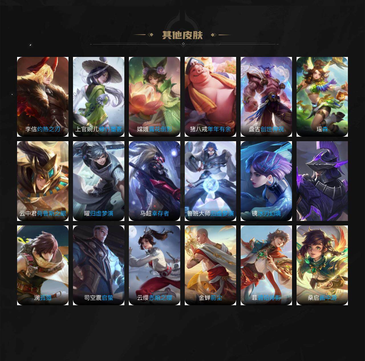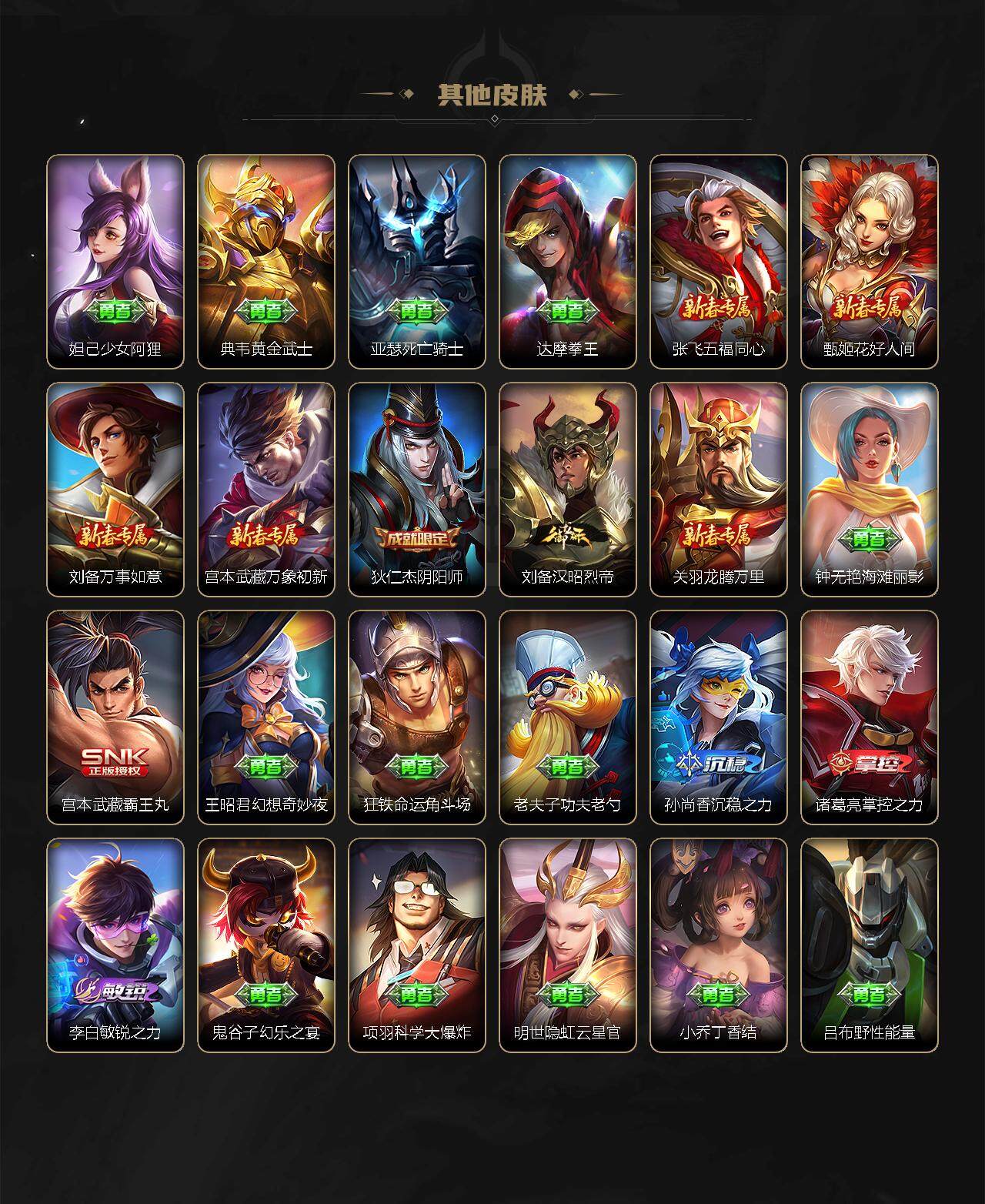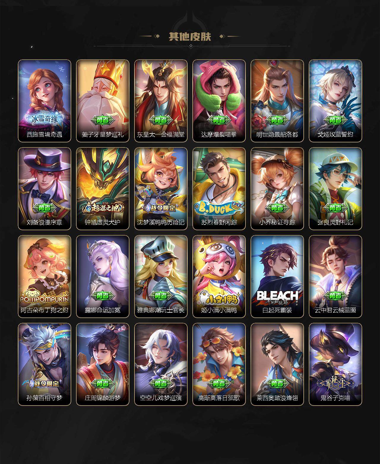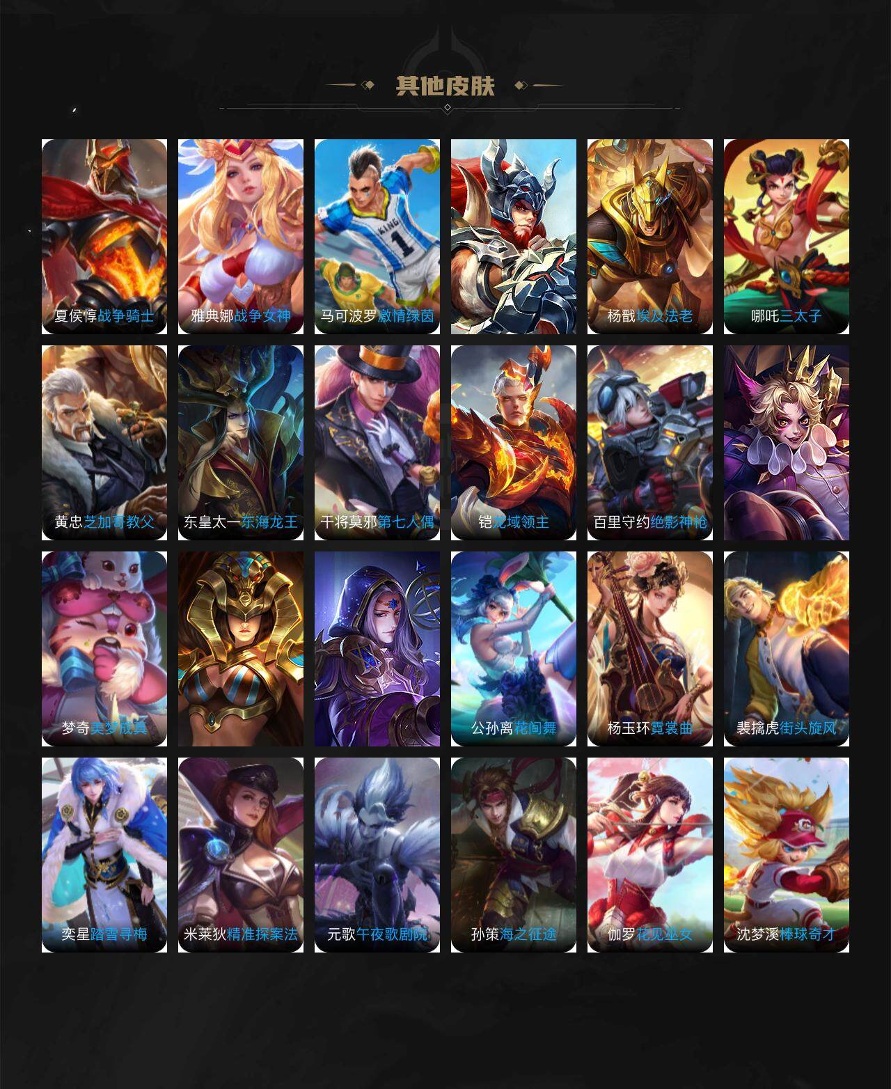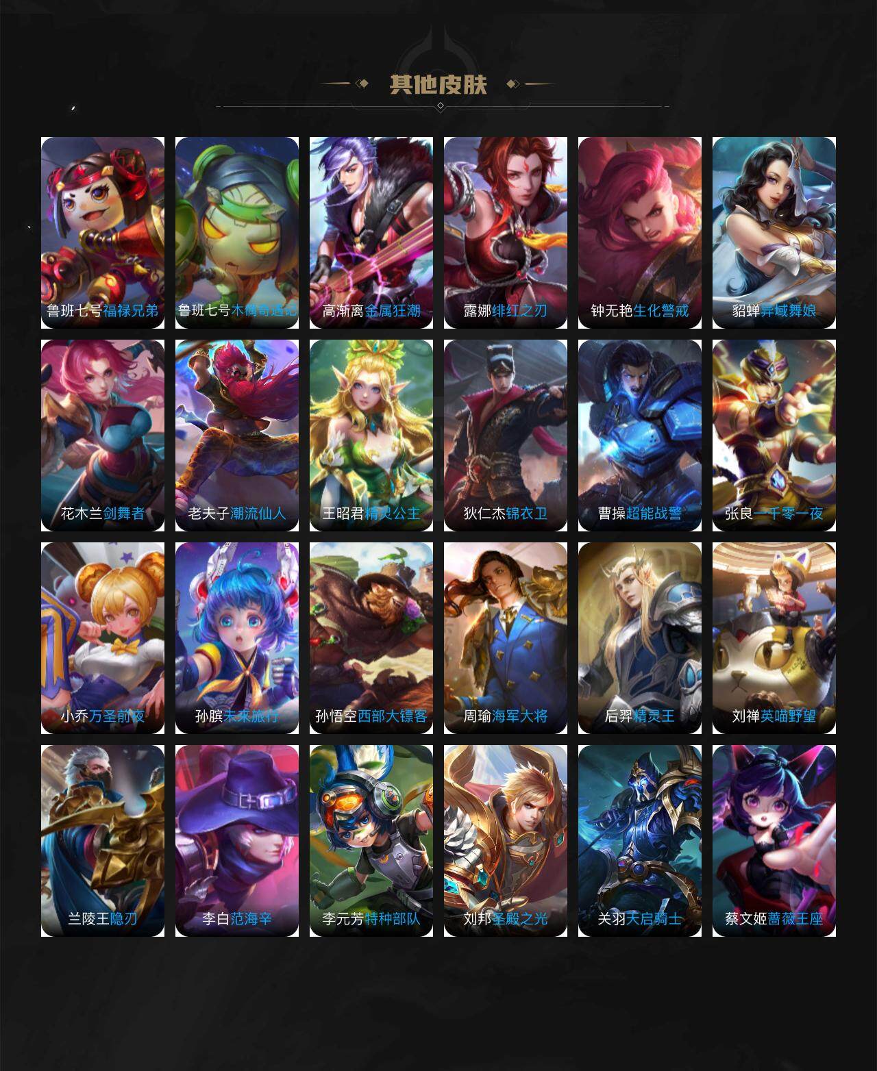 小乔青蛇,大乔白蛇,娜可露露晚萤,伽罗箭羽风息,李元芳逐浪之夏,不知火舞魅语,公孙离无限星赏官,孙策猫狗日记,阿轲节奏热浪,露娜紫霞仙子,诸葛亮黄金分割率,王昭君偶像歌手,韩信白龙吟,孙尚香时之恋人,吕布末日机甲,鲁班七号电玩小子,橘右京修罗,墨子龙骑士,嬴政摇滚巨星,刘禅绅士熊喵,刘禅天才门将,白起星夜王子,安琪拉心灵骇客,程咬金功夫厨神,兰陵王暗隐猎兽者,曹操幽灵船长,宫本武藏鬼剑武藏,司马懿暗渊魔法,亚瑟心灵战警,钟馗乐园奇幻夜,杨戬天秀·启明,蔡文姬舞动绿茵,廉颇地狱岩魂,小乔缤纷独角兽,夏侯惇乘风破浪,花木兰水晶猎龙者,铠曙光守护者,墨子金属风暴,吕布圣诞狂欢,貂蝉圣诞恋歌,百里守约特工魅影,嬴政暗夜贵公子,李白千年之狐,夏洛特永昼,澜赏金猎手,李白谪仙醉月,赵怀真器灵·浮梦炉