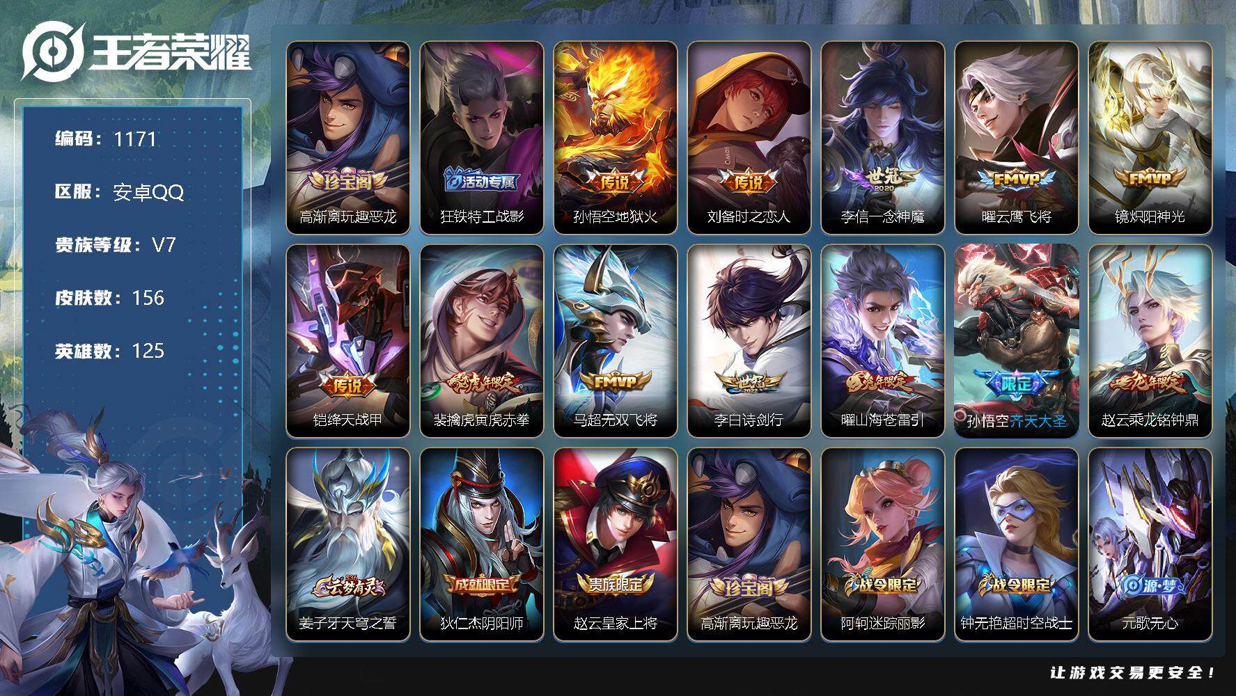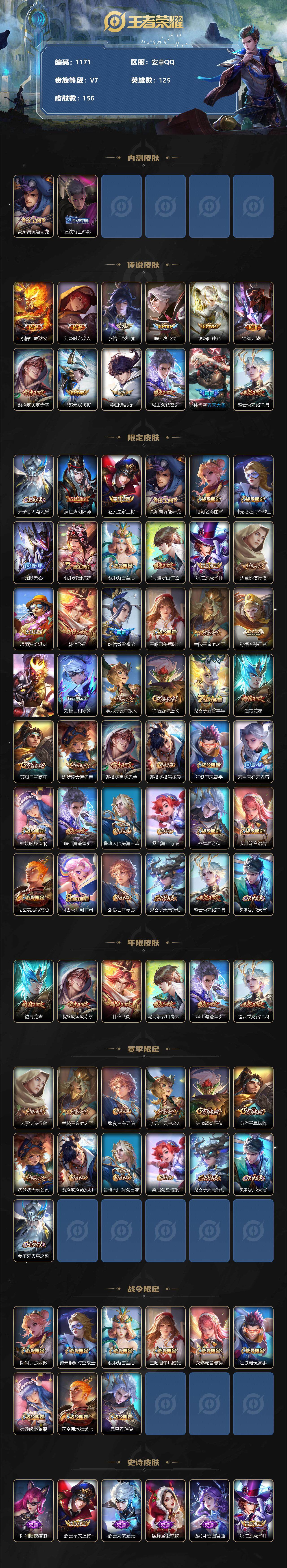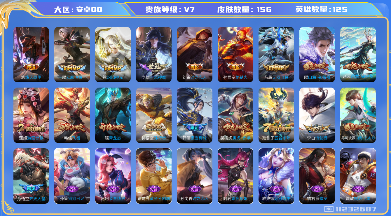 [11232687]【商品标题】:安卓Q-V7-至尊星耀IV段位-125英雄-156皮肤-0典藏-0珍品无双-0无双-0珍品传说-12传说-47史诗