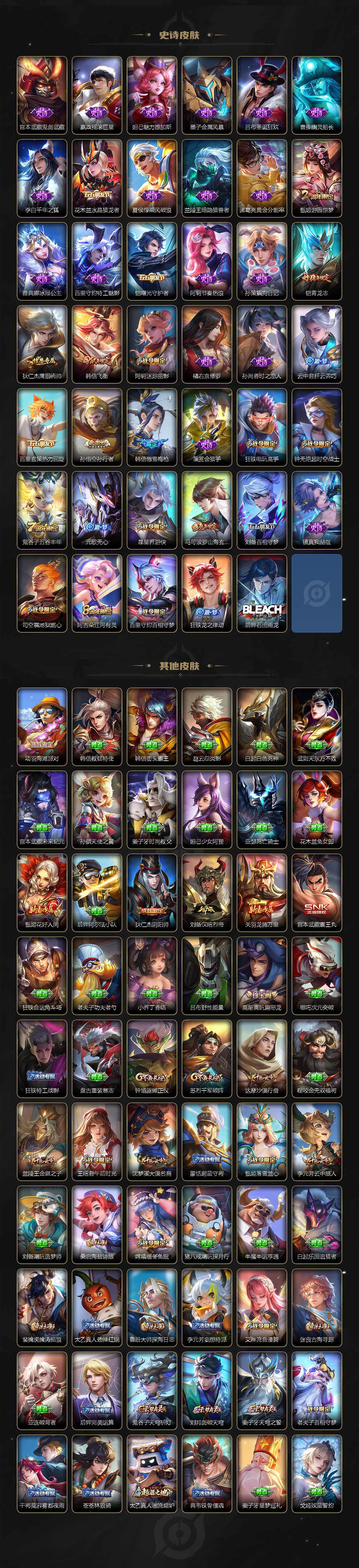 【史诗皮肤】:阿轲暗夜猫娘,赵云皇家上将,赵云未来纪元,貂蝉圣诞恋歌,甄姬冰雪圆舞曲,狄仁杰魔术师,宫本武藏鬼剑武藏,嬴政摇滚巨星,妲己魅力维加斯,墨子金属风暴,吕布圣诞狂欢,曹操幽灵船长,李白千年之狐,花木兰水晶猎龙者,夏侯惇乘风破浪,兰陵王暗隐猎兽者,诸葛亮黄金分割率,甄姬游园惊梦,雅典娜冰冠公主,百里守约特工魅影,铠曙光守护者,阿轲节奏热浪,孙策猫狗日记,铠青龙志,狄仁杰鹰眼统帅,韩信飞衡,阿轲迷踪丽影,橘右京修罗,孙尚香时之恋人,云中君纤云弄巧,百里玄策热力回旋,孙悟空孙行者,韩信傲雪梅枪,澜赏金猎手,狂铁电玩高手,钟无艳超时空战士,鬼谷子