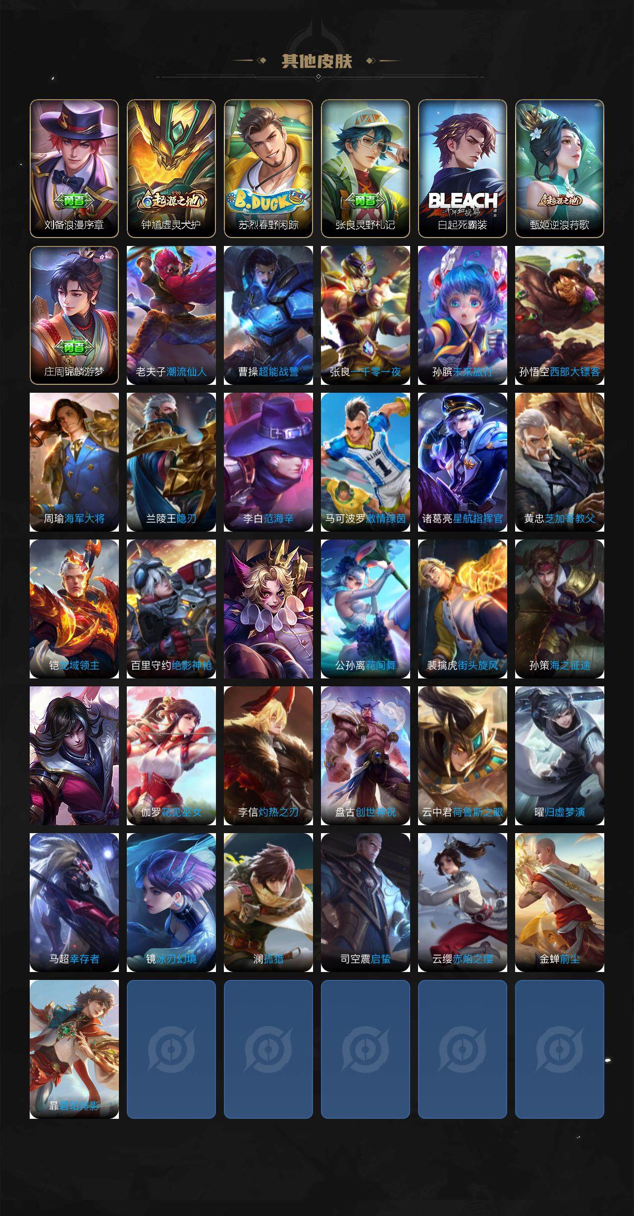 【赛季限定】:达摩沙漠行僧,兰陵王金庭之子,张良古海寻踪,李元芳云中旅人,钟馗驱傩正仪,苏烈千军破阵,沈梦溪大漠名商,裴擒虎擒涛扼浪,鲁班大师探海日志,桑启海盐诗旅,鬼谷子天穹祈灯,刘邦剑破天穹,姜子牙天穹之誓