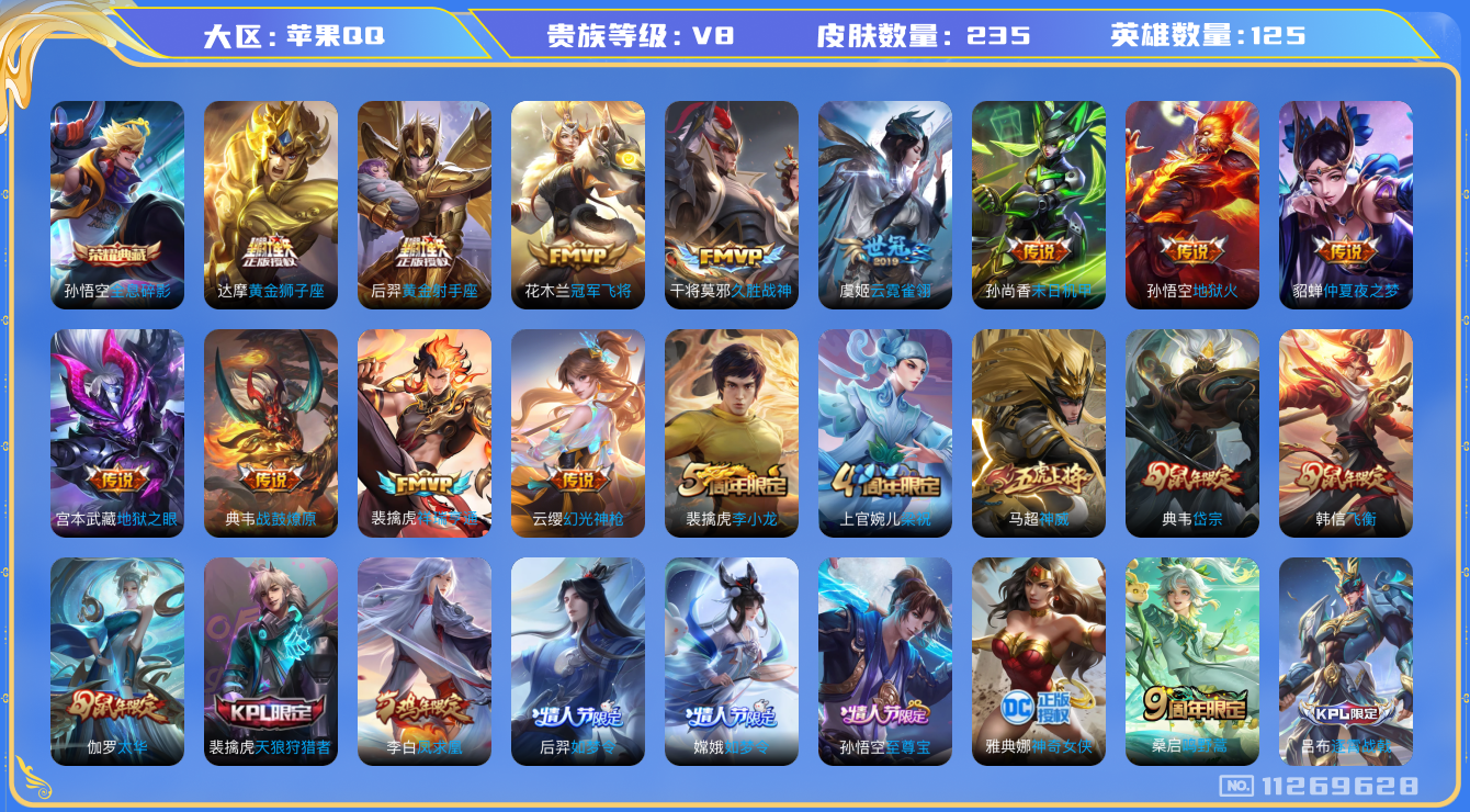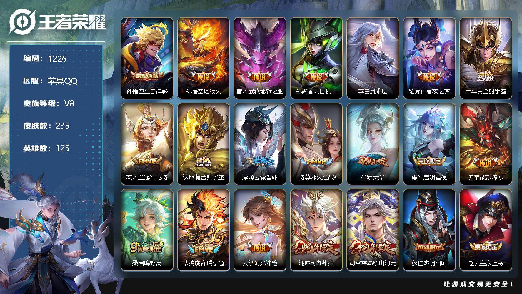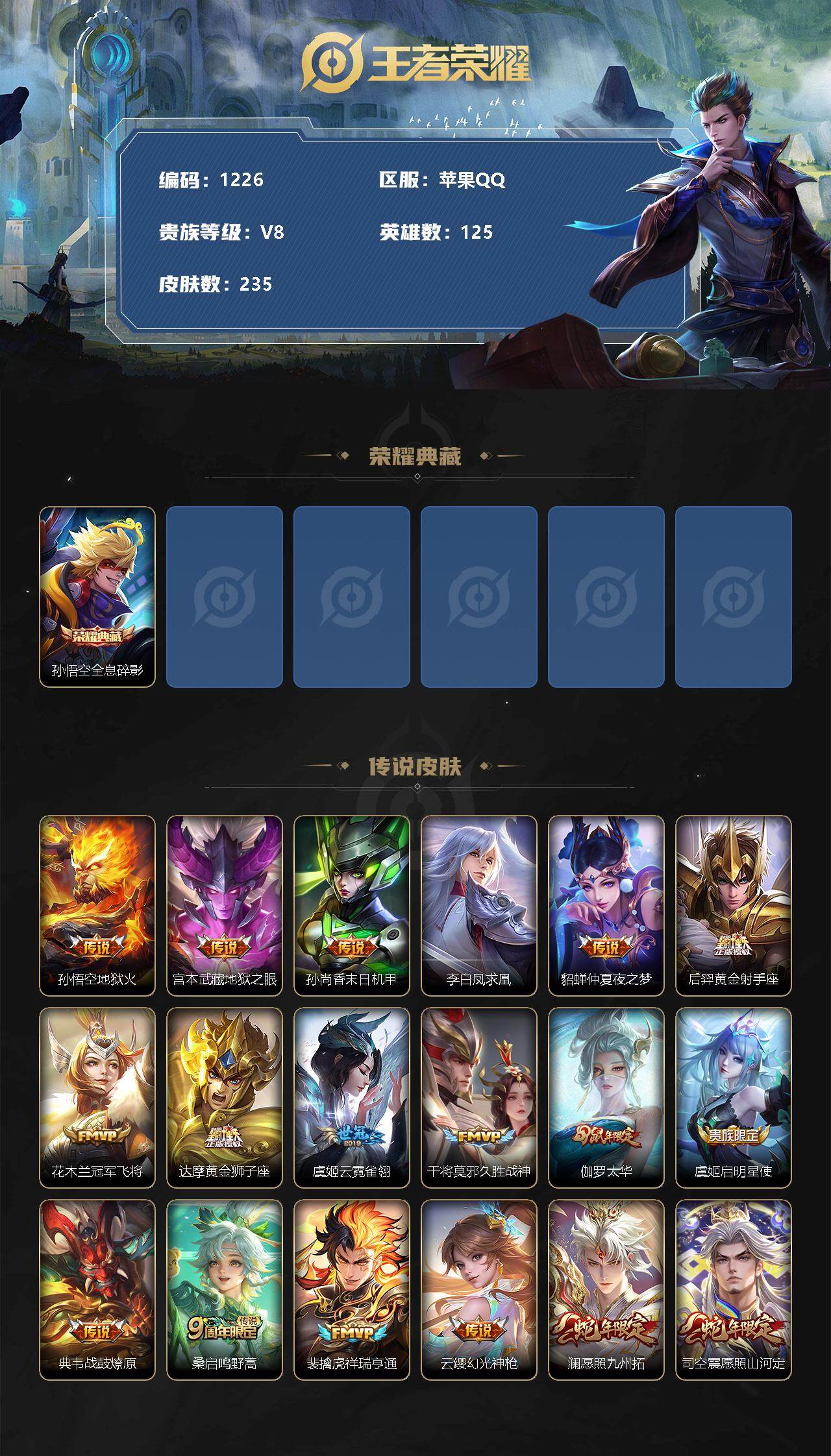 [11269628]【商品标题】:苹果Q-V8-至尊星耀II段位-125英雄-235皮肤-1典藏-0珍品无双-0无双-0珍品传说-18传说-64史诗