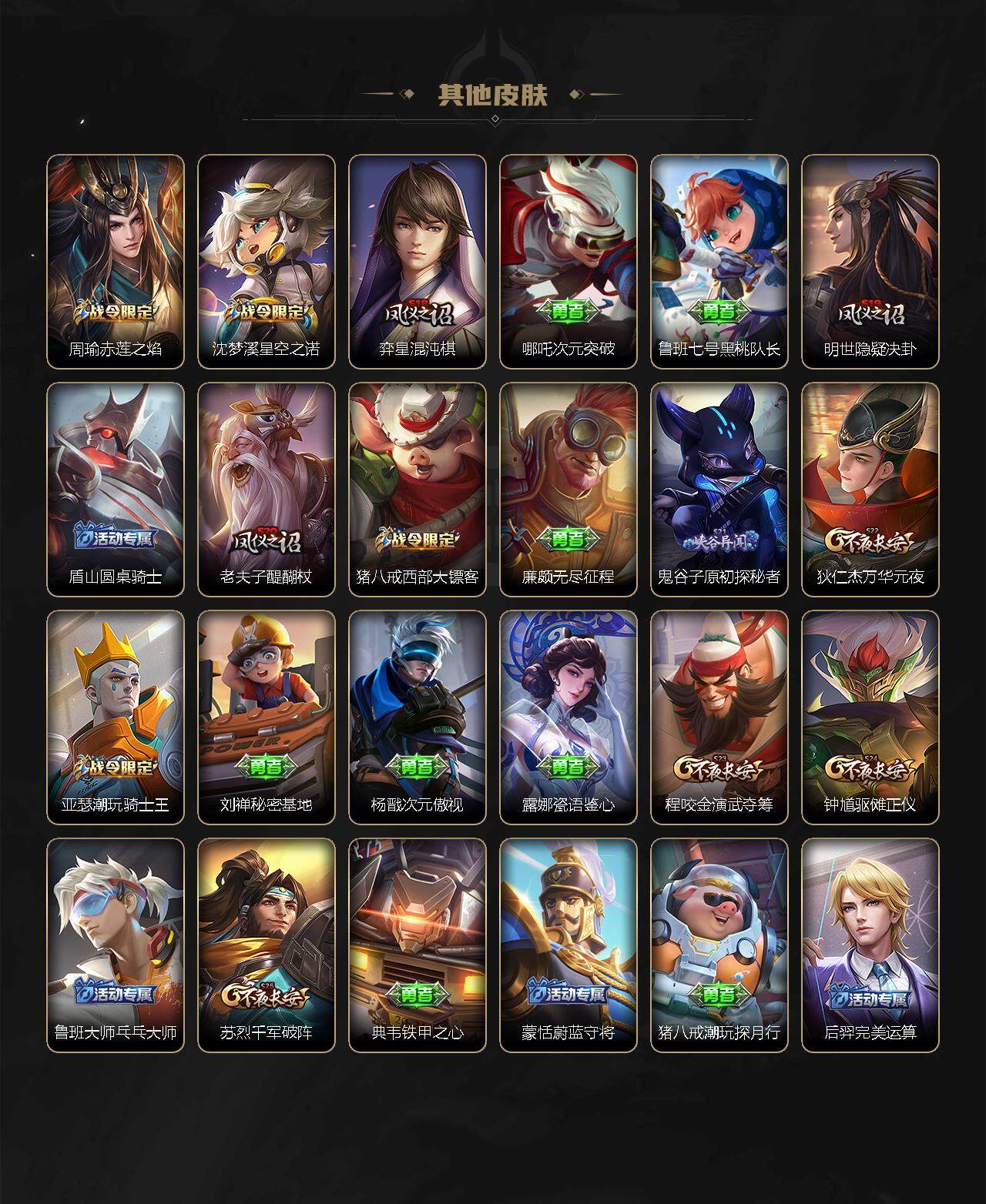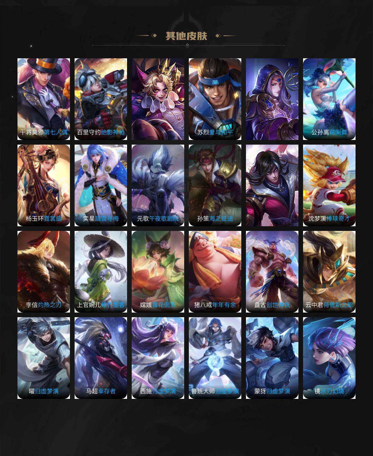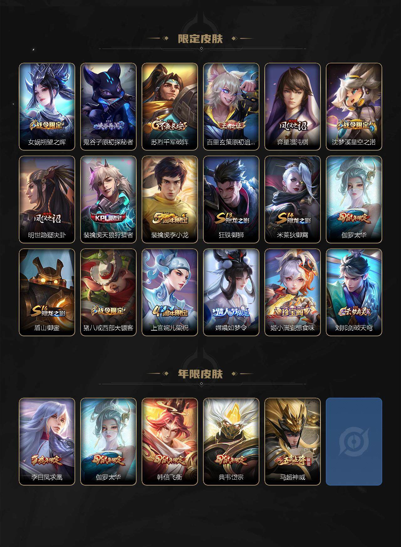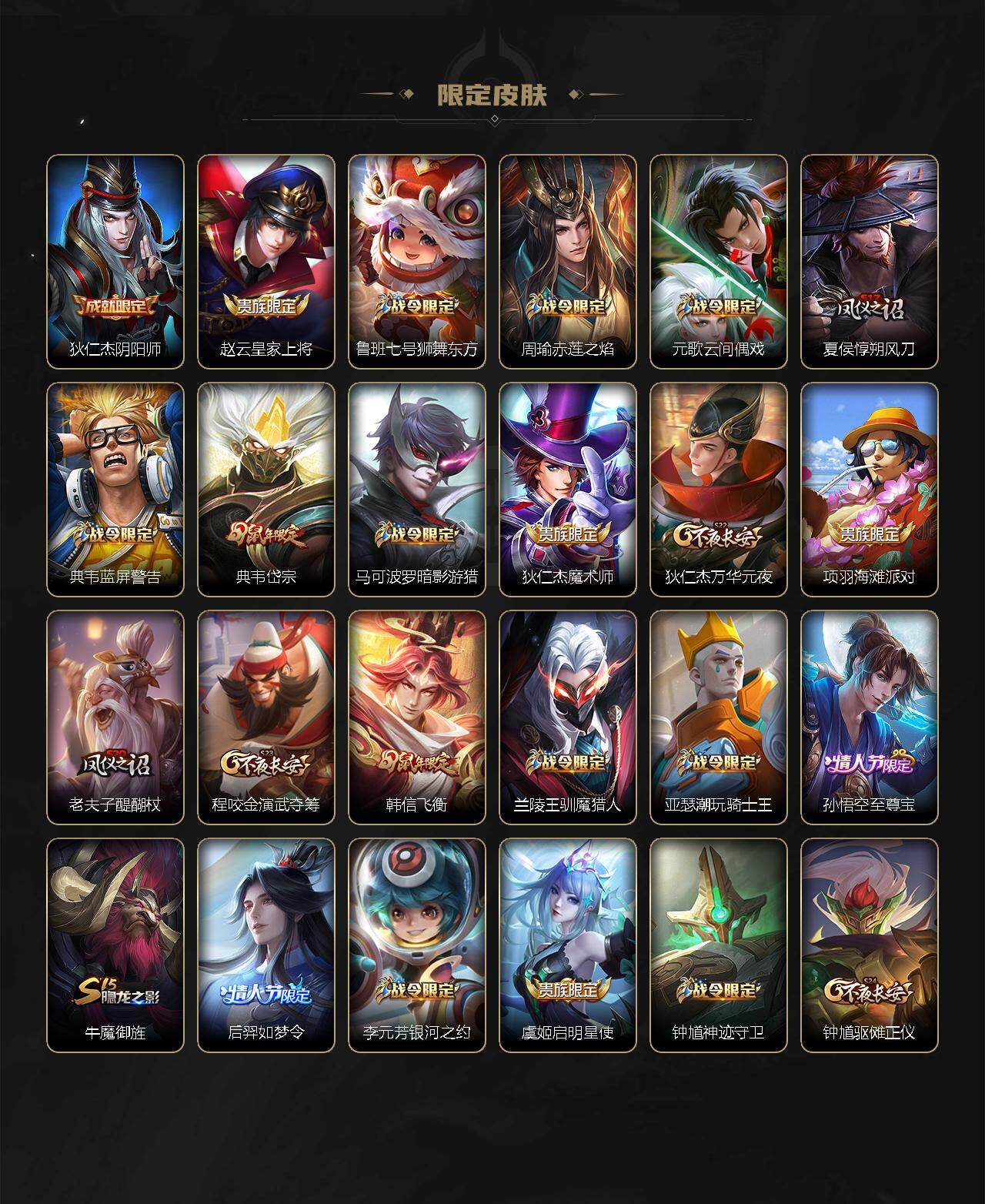 【限定皮肤】:狄仁杰阴阳师,赵云皇家上将,鲁班七号狮舞东方,周瑜赤莲之焰,元歌云间偶戏,夏侯惇朔风刀,典韦蓝屏警告,典韦岱宗,马可波罗暗影游猎,狄仁杰魔术师,狄仁杰万华元夜,项羽海滩派对,老夫子醍醐杖,程咬金演武夺筹,韩信飞衡,兰陵王驯魔猎人,亚瑟潮玩骑士王,孙悟空至尊宝,牛魔御旌,后羿如梦令,李元芳银河之约,虞姬启明星使,钟馗神迹守卫,钟馗驱傩正仪,女娲朔望之晖,鬼谷子原初探秘者,苏烈千军破阵,百里玄策原初追逐者,弈星混沌棋,沈梦溪星空之诺,明世隐疑决卦,裴擒虎天狼狩猎者,裴擒虎李小龙,狂铁御狮,米莱狄御霄,伽罗太华,盾山御銮,猪八戒西部大镖客,上官婉儿梁祝,嫦娥如梦令,姬小满妄想食味,刘邦剑破天穹