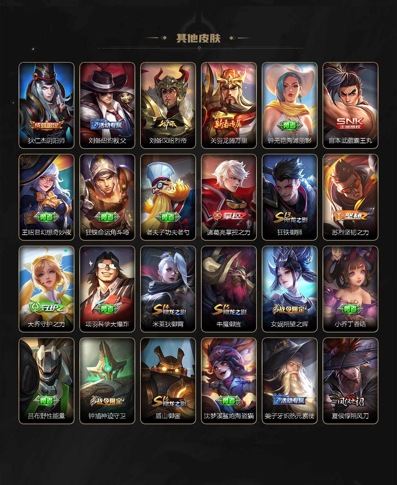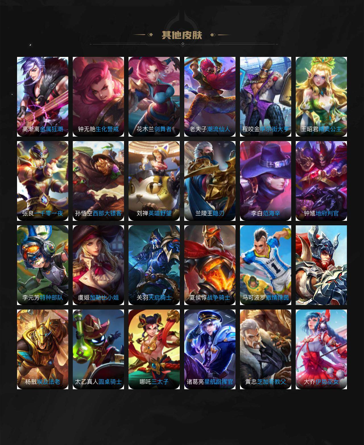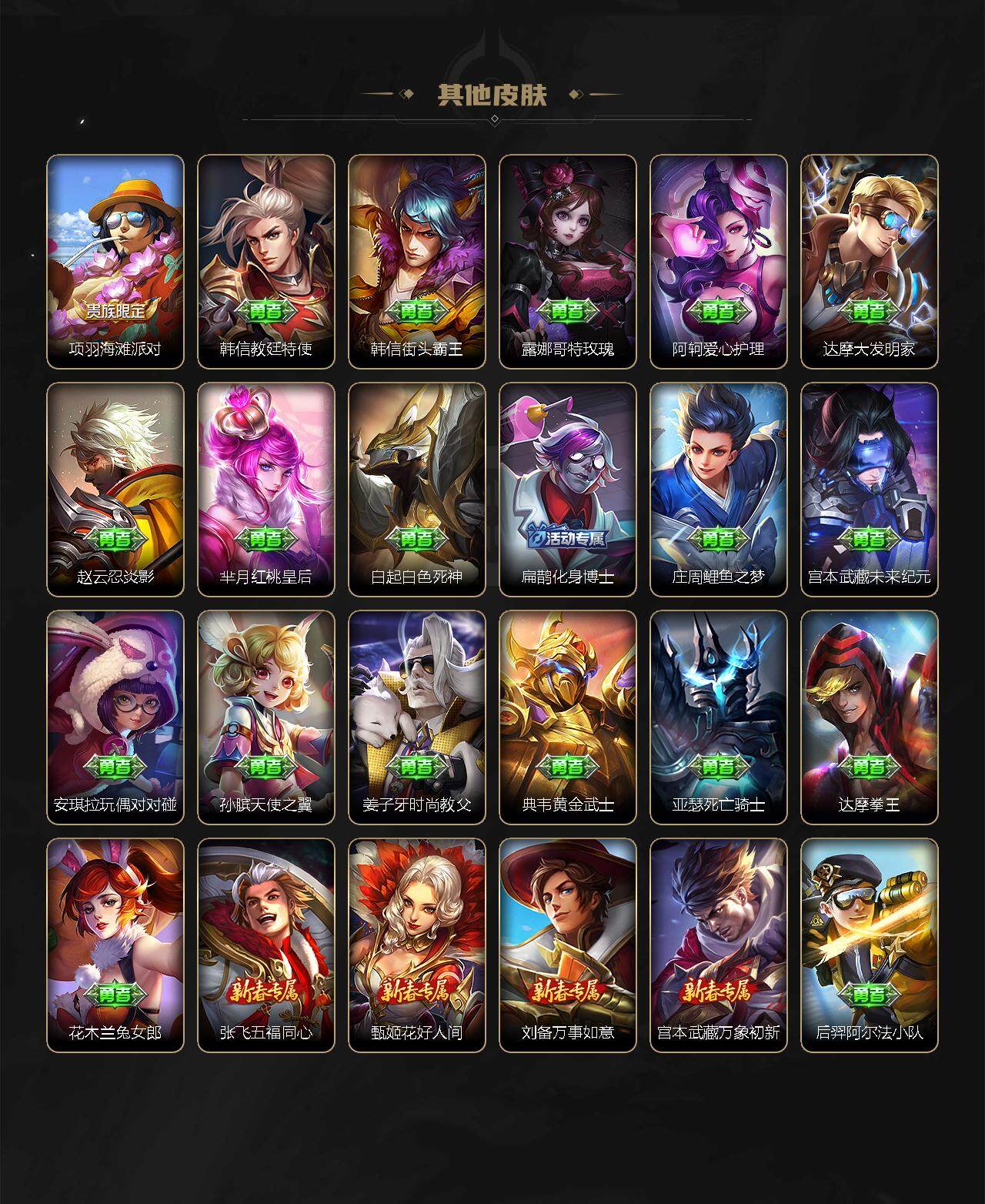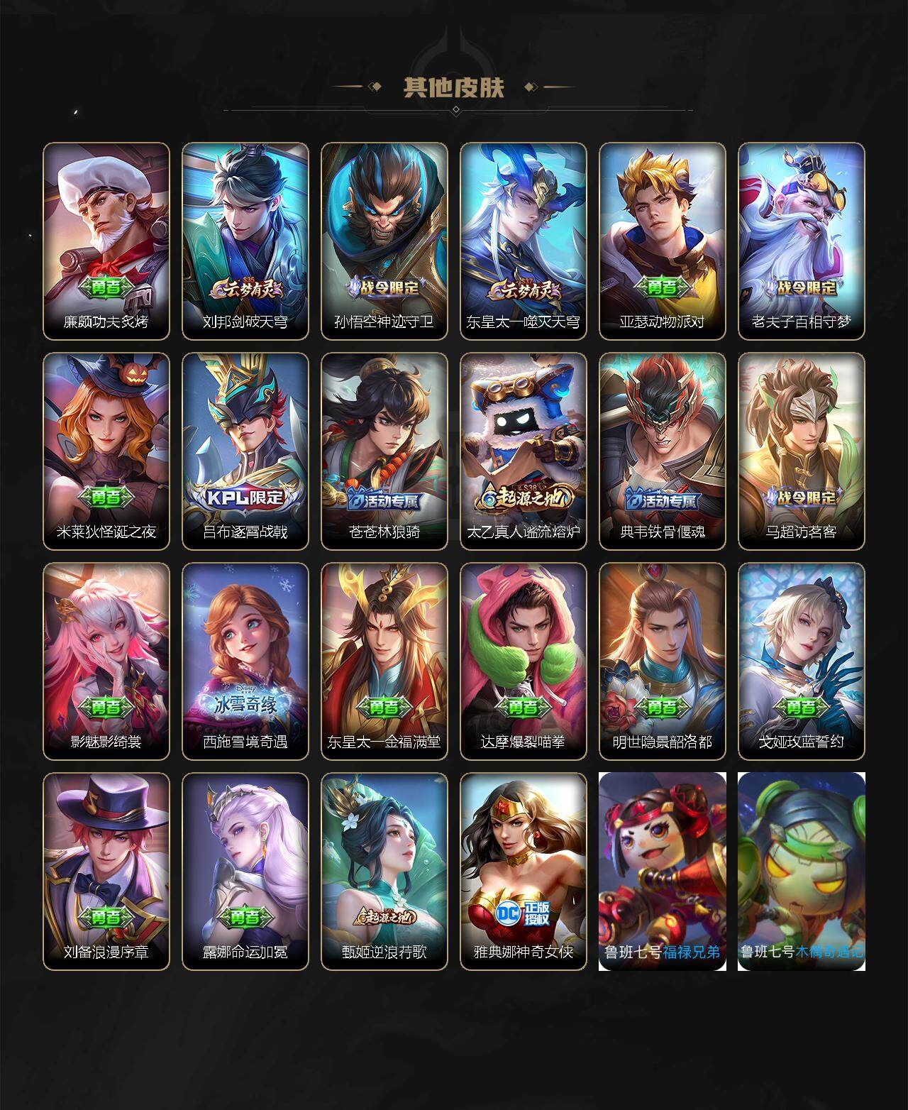 【限定皮肤】:狄仁杰阴阳师,赵云皇家上将,鲁班七号狮舞东方,周瑜赤莲之焰,元歌云间偶戏,夏侯惇朔风刀,典韦蓝屏警告,典韦岱宗,马可波罗暗影游猎,狄仁杰魔术师,狄仁杰万华元夜,项羽海滩派对,老夫子醍醐杖,程咬金演武夺筹,韩信飞衡,兰陵王驯魔猎人,亚瑟潮玩骑士王,孙悟空至尊宝,牛魔御旌,后羿如梦令,李元芳银河之约,虞姬启明星使,钟馗神迹守卫,钟馗驱傩正仪,女娲朔望之晖,鬼谷子原初探秘者,苏烈千军破阵,百里玄策原初追逐者,弈星混沌棋,沈梦溪星空之诺,明世隐疑决卦,裴擒虎天狼狩猎者,裴擒虎李小龙,狂铁御狮,米莱狄御霄,伽罗太华,盾山御銮,猪八戒西部大镖客,上官婉儿梁祝,嫦娥如梦令,姬小满妄想食味,刘邦剑破天穹