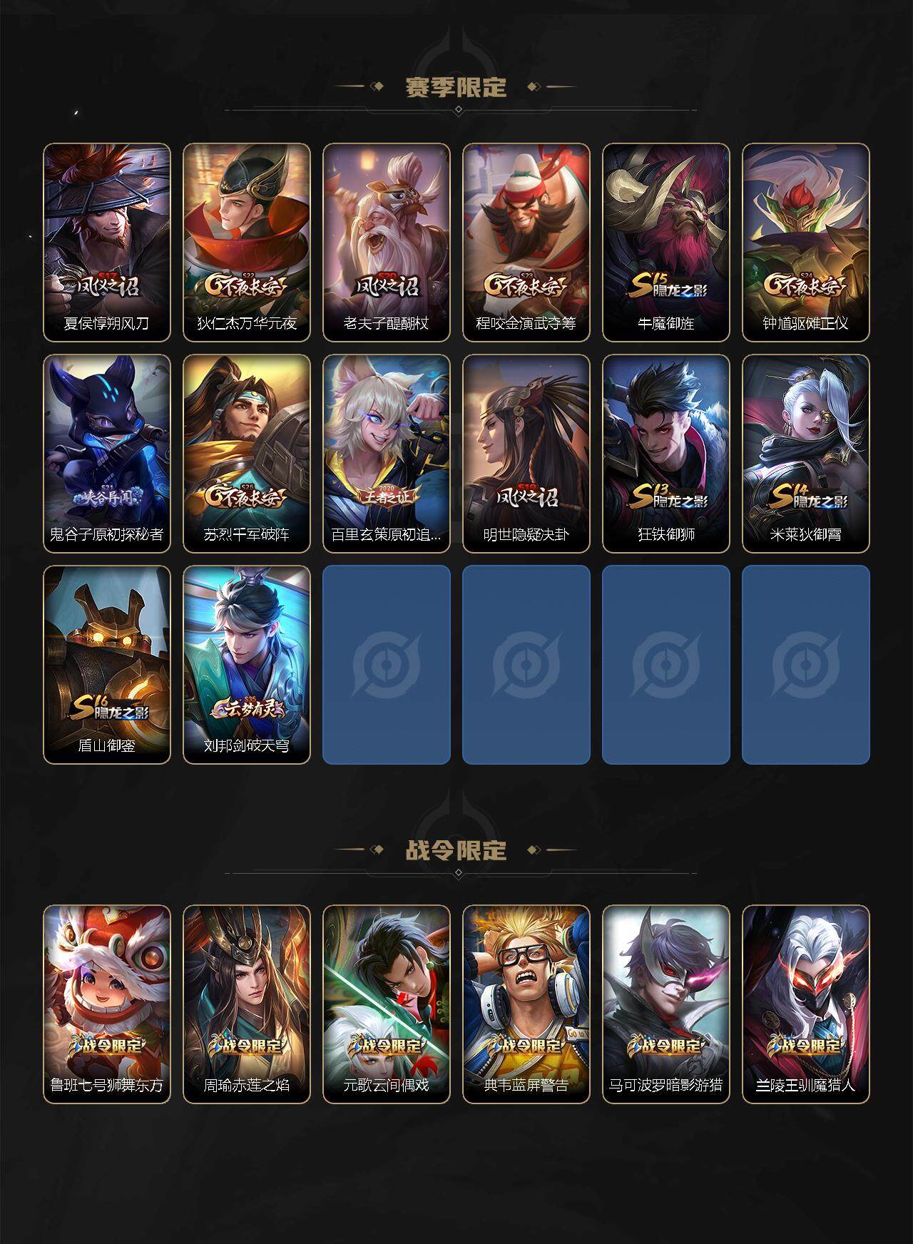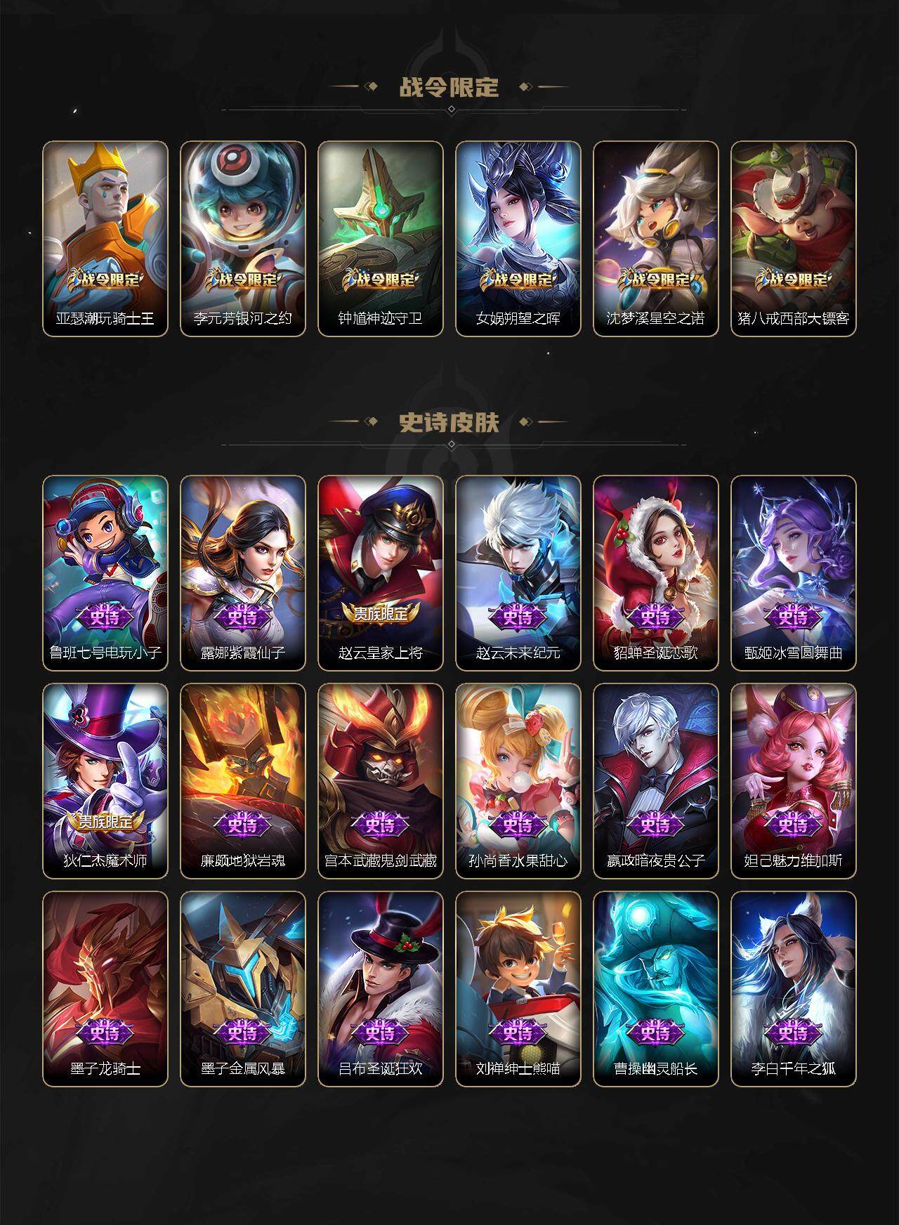 【战令限定】:鲁班七号狮舞东方,周瑜赤莲之焰,元歌云间偶戏,典韦蓝屏警告,马可波罗暗影游猎,兰陵王驯魔猎人,亚瑟潮玩骑士王,李元芳银河之约,钟馗神迹守卫,女娲朔望之晖,沈梦溪星空之诺,猪八戒西部大镖客