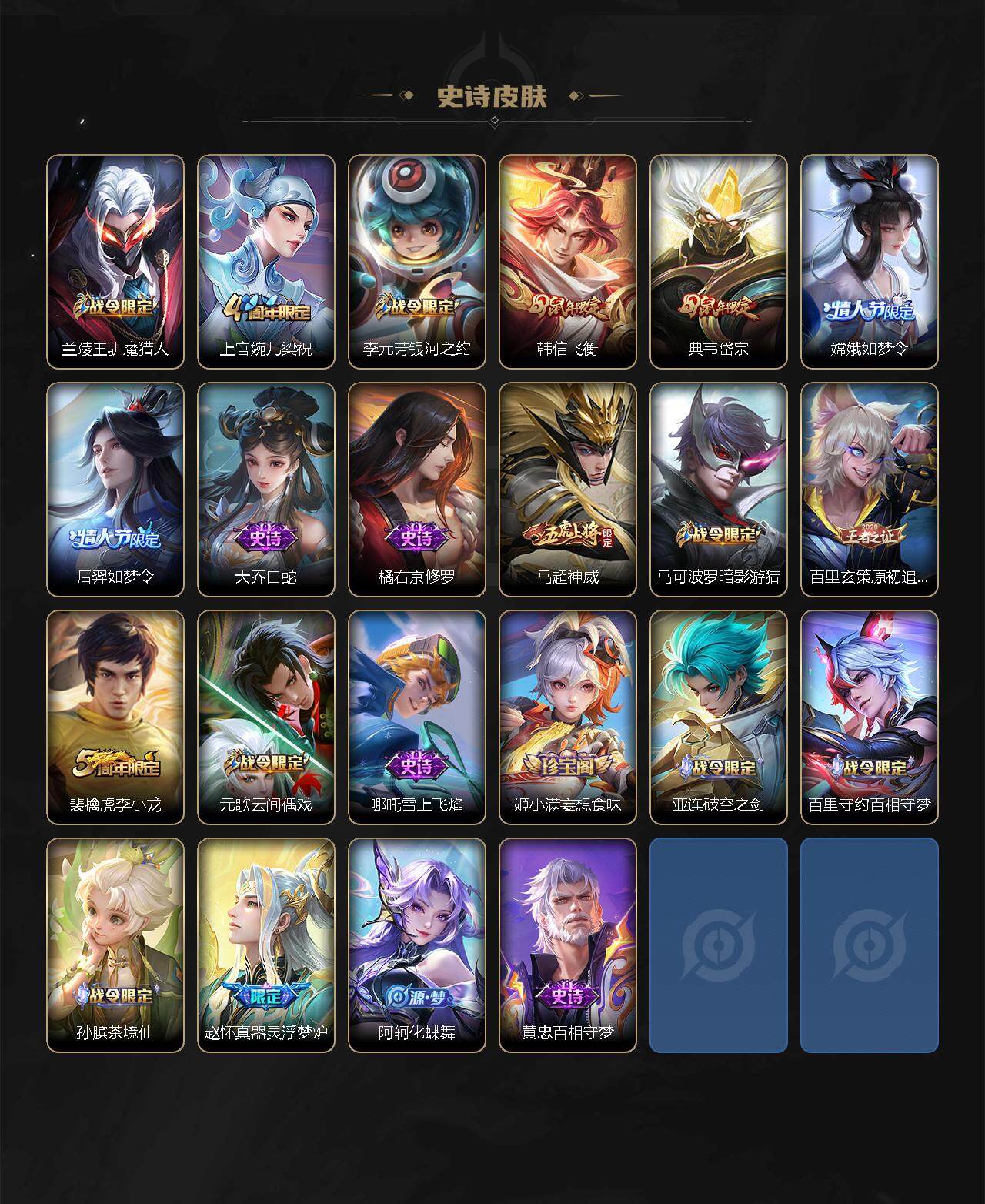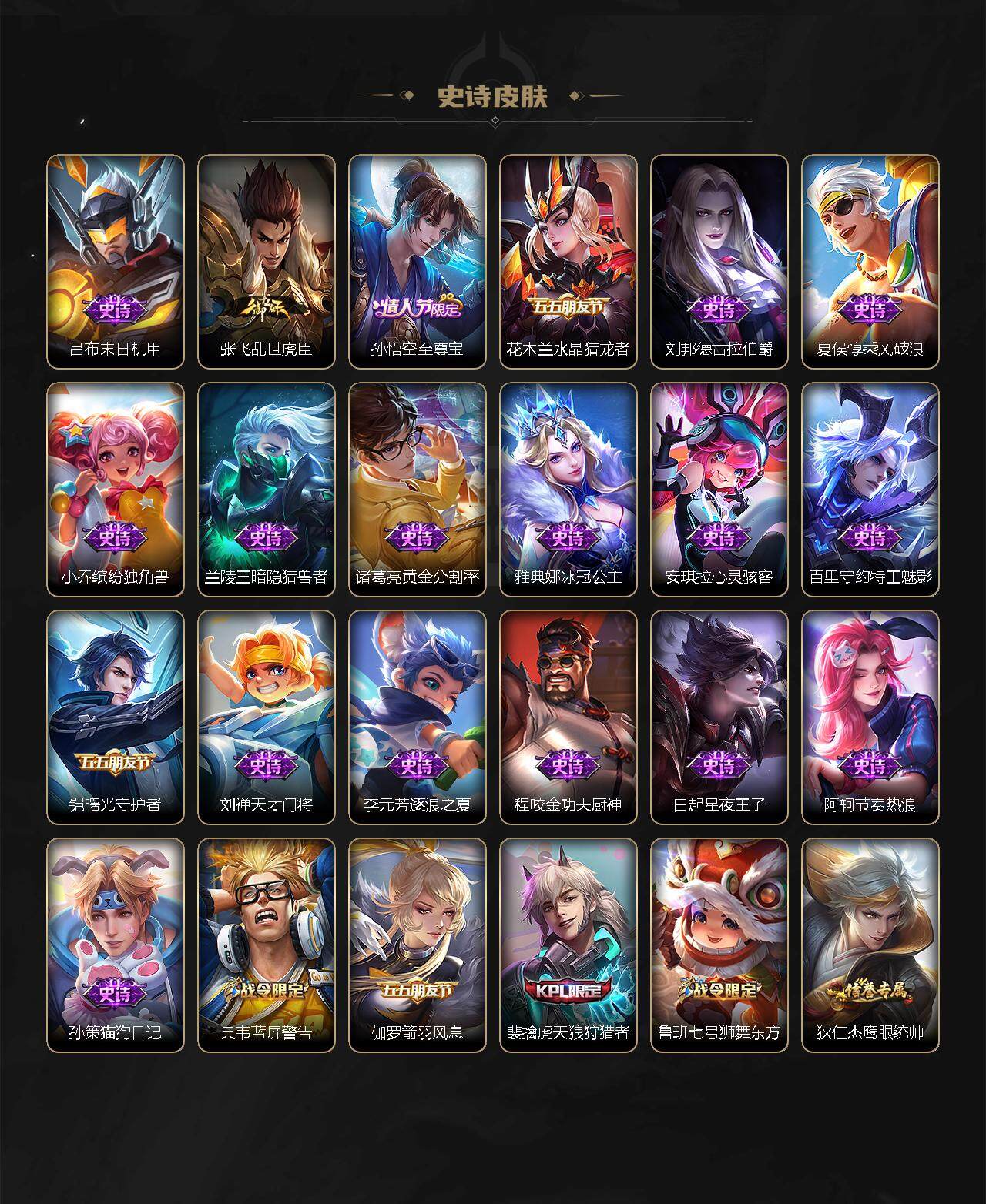 【史诗皮肤】:鲁班七号电玩小子,露娜紫霞仙子,赵云皇家上将,赵云未来纪元,貂蝉圣诞恋歌,甄姬冰雪圆舞曲,狄仁杰魔术师,廉颇地狱岩魂,宫本武藏鬼剑武藏,孙尚香水果甜心,嬴政暗夜贵公子,妲己魅力维加斯,墨子龙骑士,墨子金属风暴,吕布圣诞狂欢,刘禅绅士熊喵,曹操幽灵船长,李白千年之狐,吕布末日机甲,张飞乱世虎臣,孙悟空至尊宝,花木兰水晶猎龙者,刘邦德古拉伯爵,夏侯惇乘风破浪,小乔缤纷独角兽,兰陵王暗隐猎兽者,诸葛亮黄金分割率,雅典娜冰冠公主,安琪拉心灵骇客,