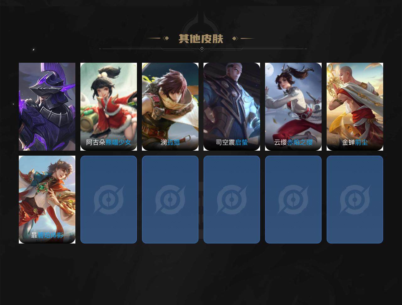 裴擒虎李小龙,上官婉儿梁祝,马超神威,典韦岱宗,韩信飞衡,伽罗太华,裴擒虎天狼狩猎者,后羿如梦令,嫦娥如梦令,孙悟空至尊宝,雅典娜神奇女侠,桑启鸣野蒿,澜愿照·九州拓,司空震愿照·山河定