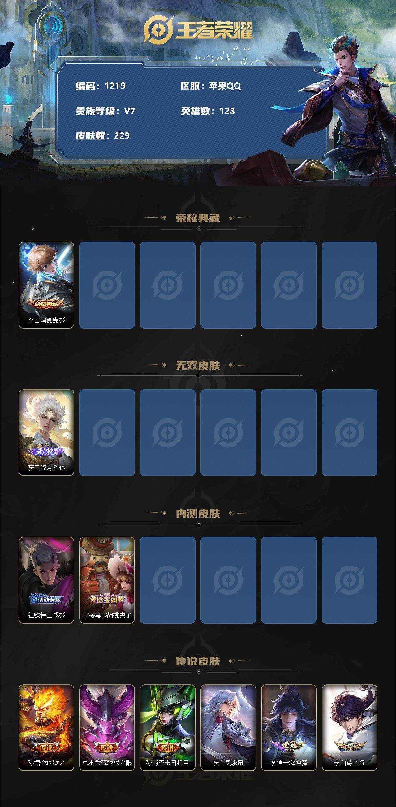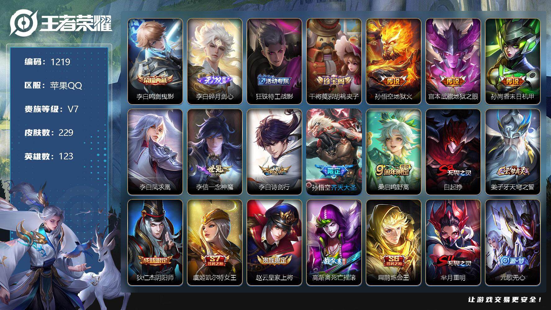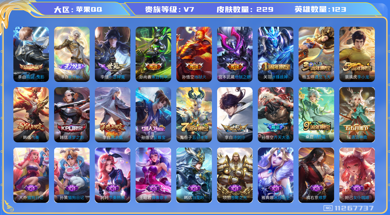 [11267737]【商品标题】:苹果Q-V4-至尊星耀V段位-123英雄-229皮肤-1典藏-0珍品无双-1无双-0珍品传说-8传说-54史诗