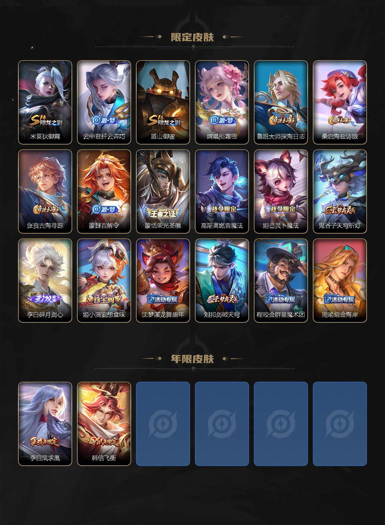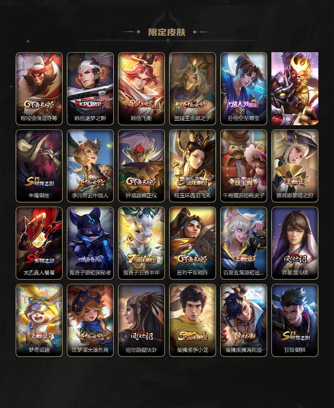 【限定皮肤】:白起狰,姜子牙天穹之誓,狄仁杰阴阳师,虞姬凯尔特女王,赵云皇家上将,高渐离死亡摇滚,扁鹊炼金王,芈月重明,元歌无心,夏侯惇朔风刀,曹操烛龙,典韦穷奇,狄仁杰魔术师,狄仁杰万华元夜,达摩沙漠行僧,项羽海滩派对,老夫子醍醐杖,关羽冰锋战神,程咬金演武夺筹,韩信逐梦之影,韩信飞衡,兰陵王金庭之子,孙悟空至尊宝,孙悟空齐天大圣,牛魔御旌,李元芳云中旅人,钟馗驱傩正仪,杨玉环遇见飞天,干将莫邪胡桃夹子,雅典娜黎明之约,太乙真人饕餮,鬼谷子原初探秘者,鬼谷子五谷丰年,苏烈千军破阵,百里玄策原初追逐者,弈星混沌棋,梦奇顽趣,沈梦溪大漠名商,明世隐疑决卦,裴擒虎李小龙,裴擒虎擒涛扼浪,狂铁御狮,米莱狄御霄,云中君纤云弄巧,盾山御銮,嫦娥拒霜思,鲁班大师探海日志,桑启海盐诗旅,张良古海寻踪,蒙犽百解令,蒙恬荣光圣徽,高渐离燃音魔法,妲己灵卜魔法,鬼谷子天穹祈灯,李白碎月剑心,姬小满妄想食味,沈梦溪龙舞盛年,刘邦剑破天穹,程咬金群星魔术团,周瑜熔金海岸