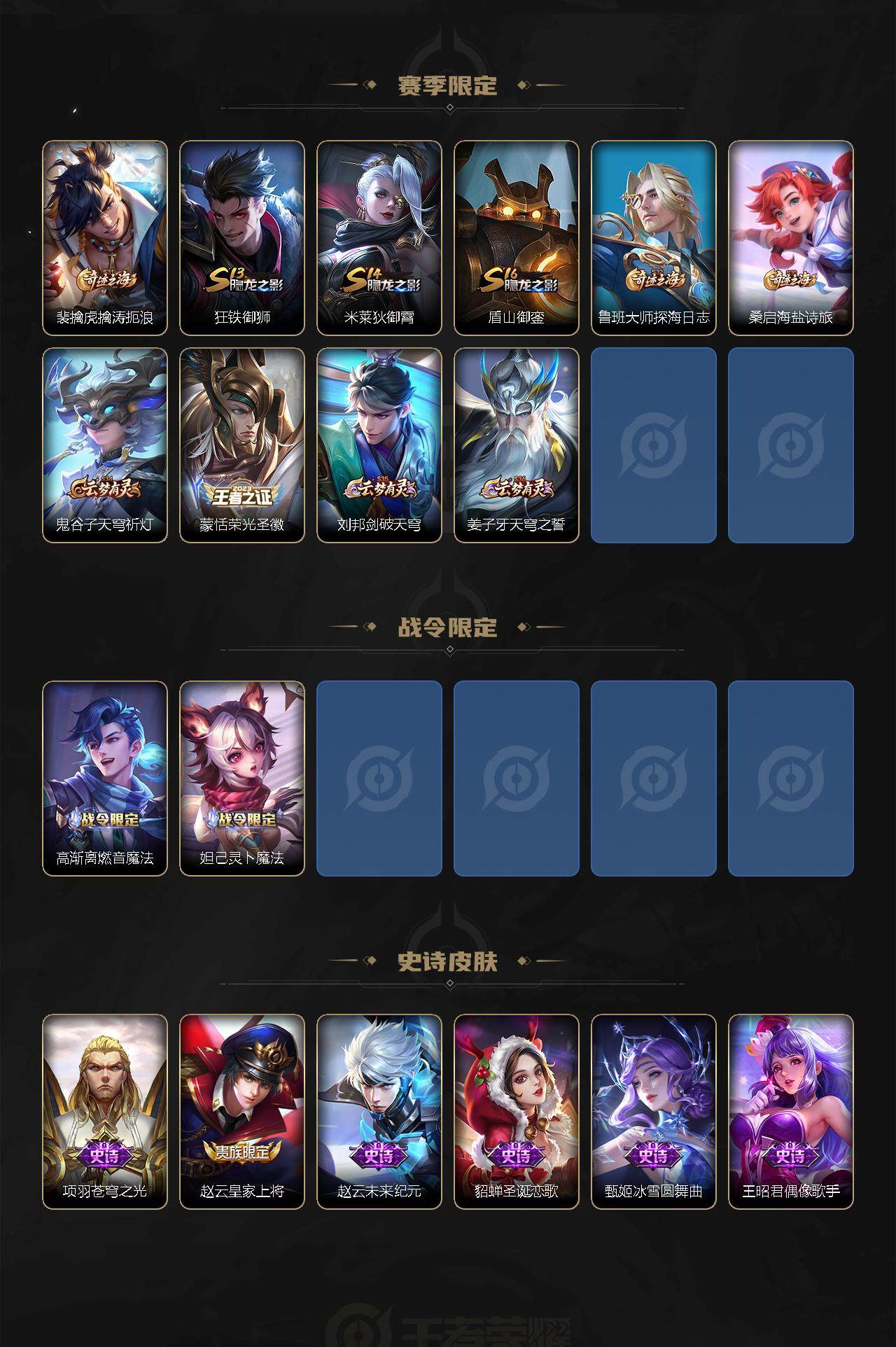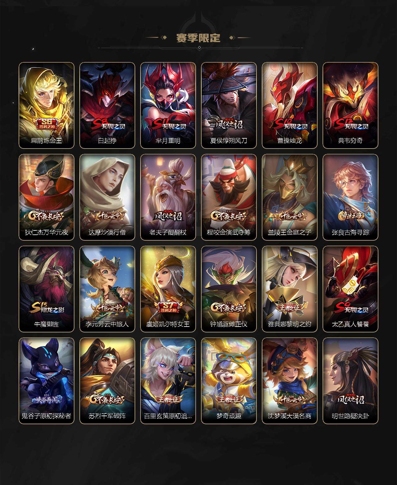 【赛季限定】:扁鹊炼金王,白起狰,芈月重明,夏侯惇朔风刀,曹操烛龙,典韦穷奇,狄仁杰万华元夜,达摩沙漠行僧,老夫子醍醐杖,程咬金演武夺筹,兰陵王金庭之子,张良古海寻踪,牛魔御旌,李元芳云中旅人,虞姬凯尔特女王,钟馗驱傩正仪,雅典娜黎明之约,太乙真人饕餮,鬼谷子原初探秘者,苏烈千军破阵,百里玄策原初追逐者,弈星混沌棋,梦奇顽趣,沈梦溪大漠名商,明世隐疑决卦,裴擒虎擒涛扼浪,狂铁御狮,米莱狄御霄,盾山御銮,鲁班大师探海日志,桑启海盐诗旅,鬼谷子天穹祈灯,蒙恬荣光圣徽,刘邦剑破天穹,姜子牙天穹之誓