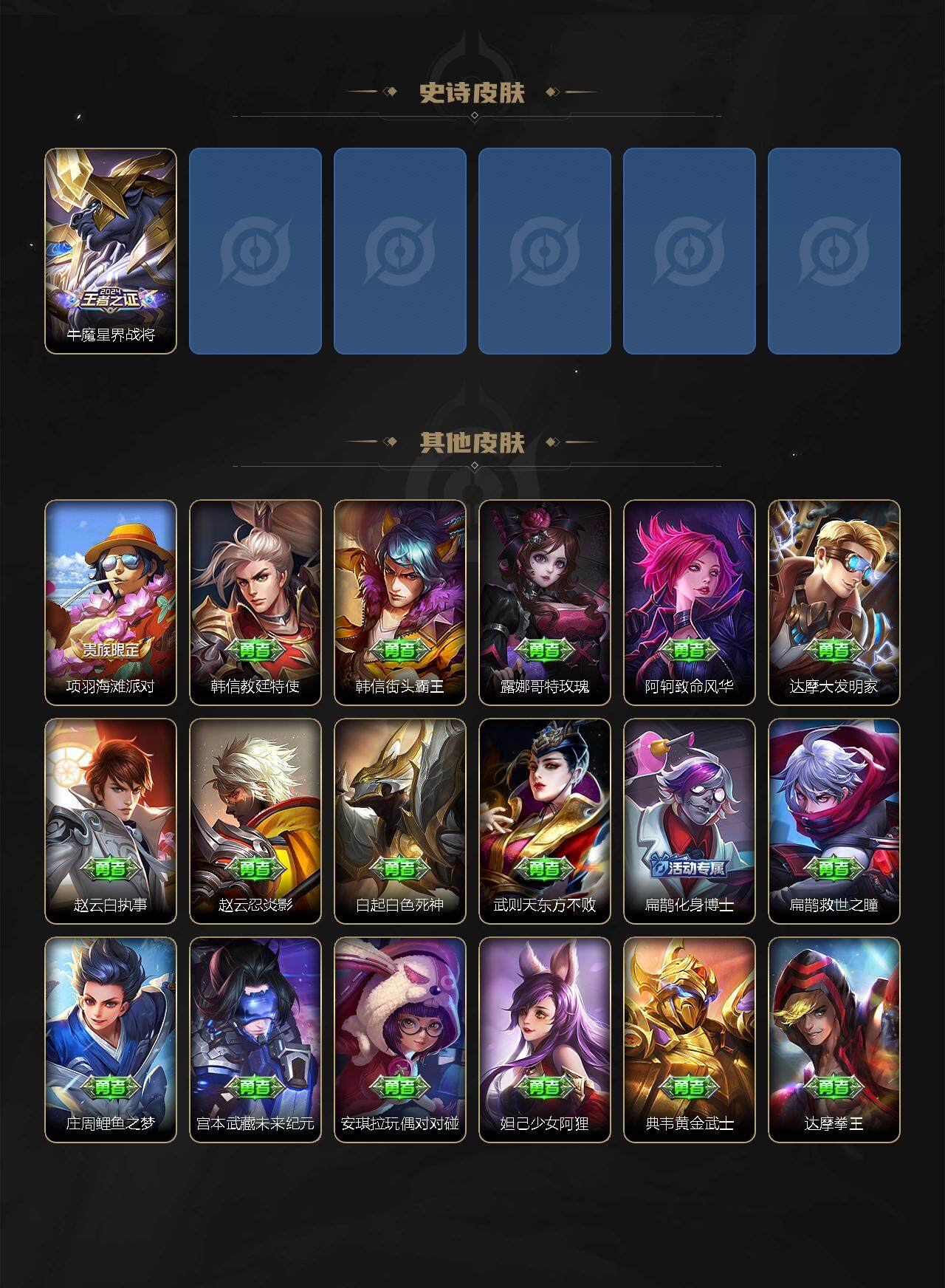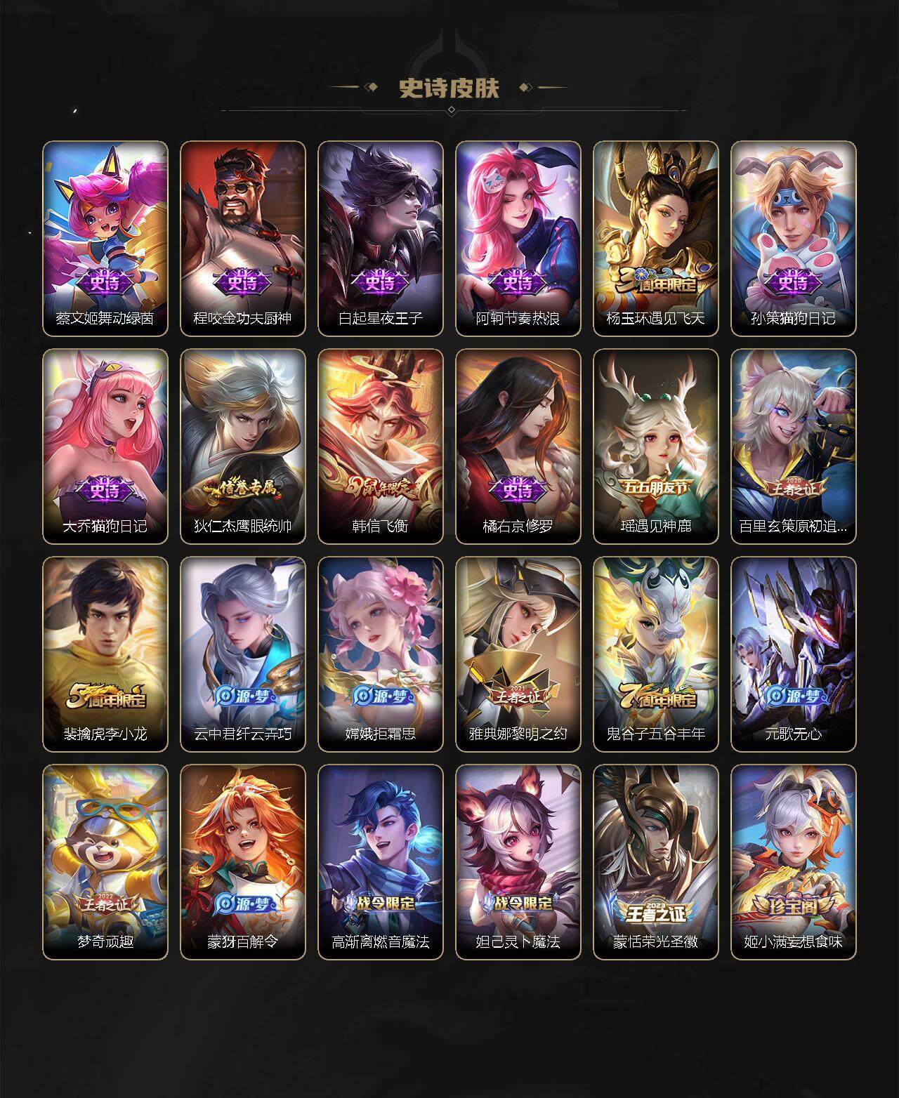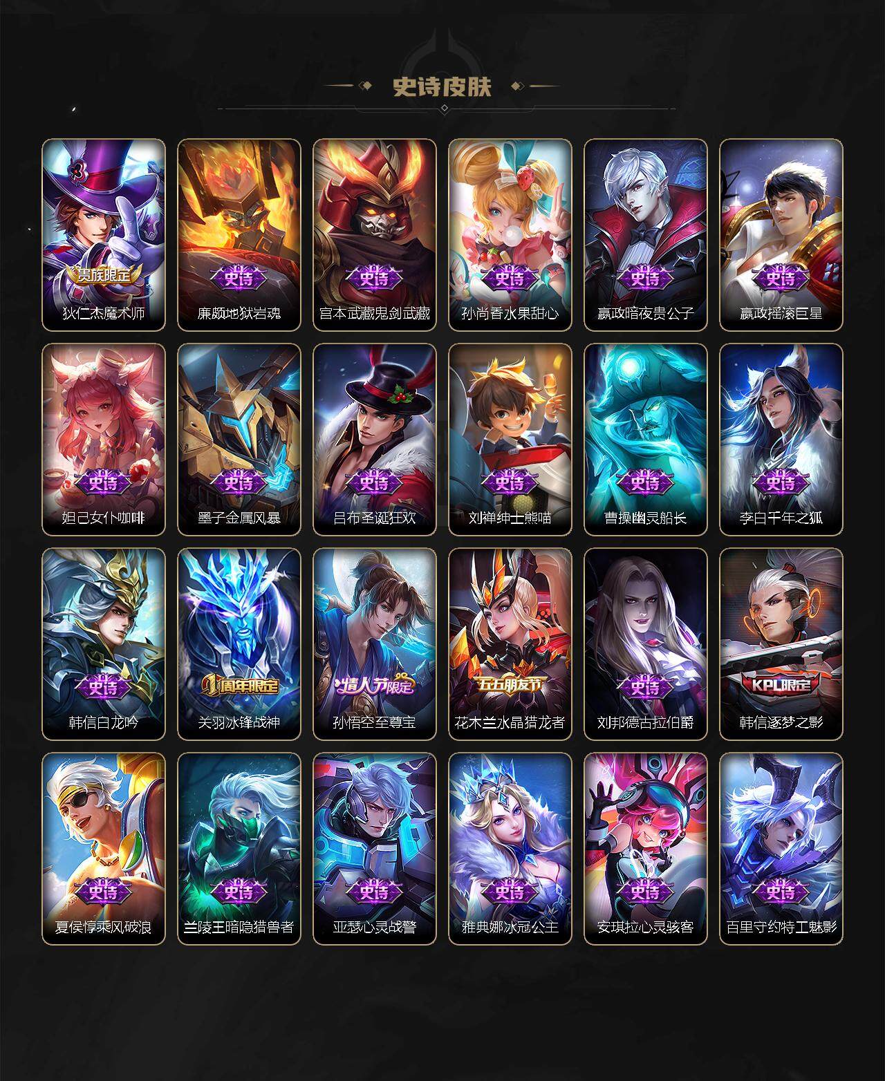 【史诗皮肤】:项羽苍穹之光,赵云皇家上将,赵云未来纪元,貂蝉圣诞恋歌,甄姬冰雪圆舞曲,王昭君偶像歌手,狄仁杰魔术师,廉颇地狱岩魂,宫本武藏鬼剑武藏,孙尚香水果甜心,嬴政暗夜贵公子,嬴政摇滚巨星,妲己女仆咖