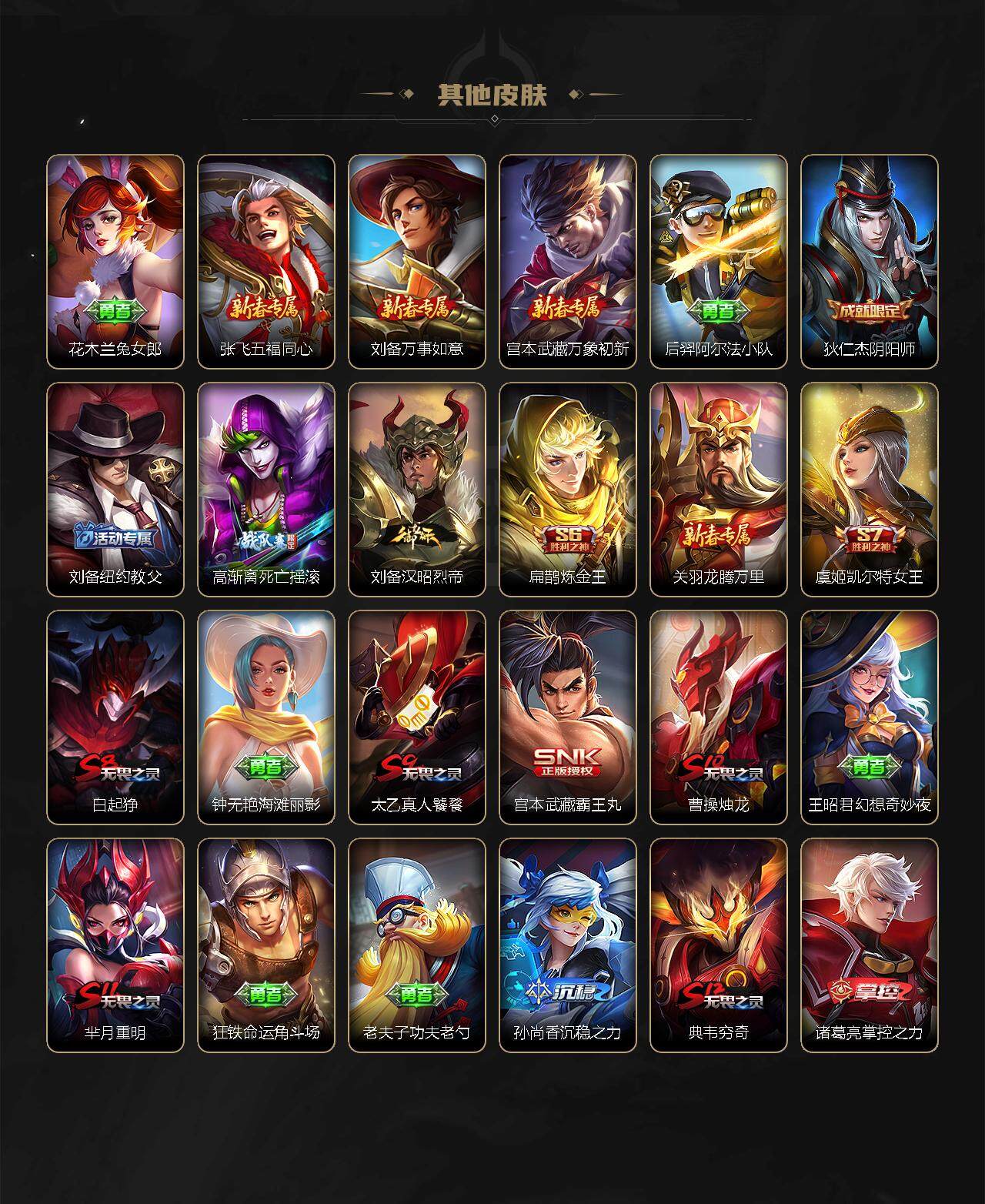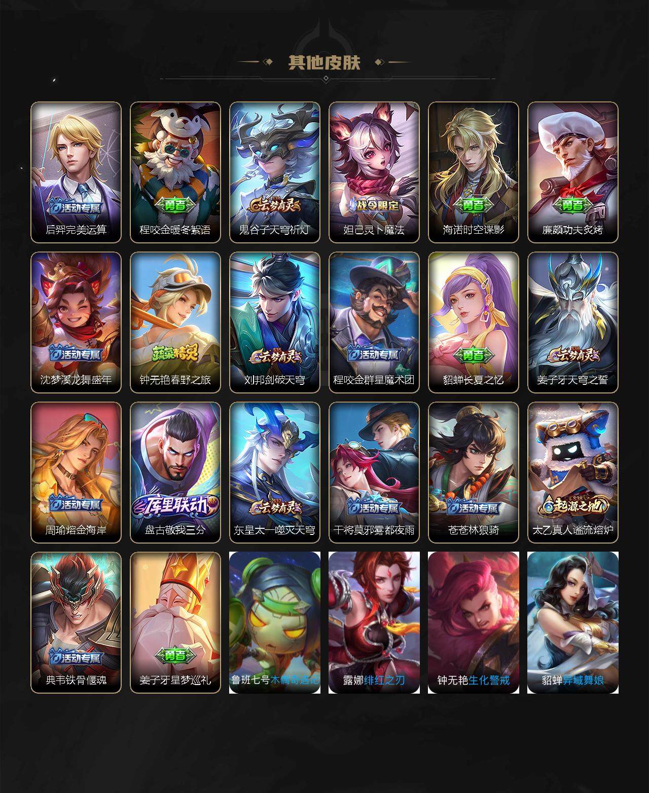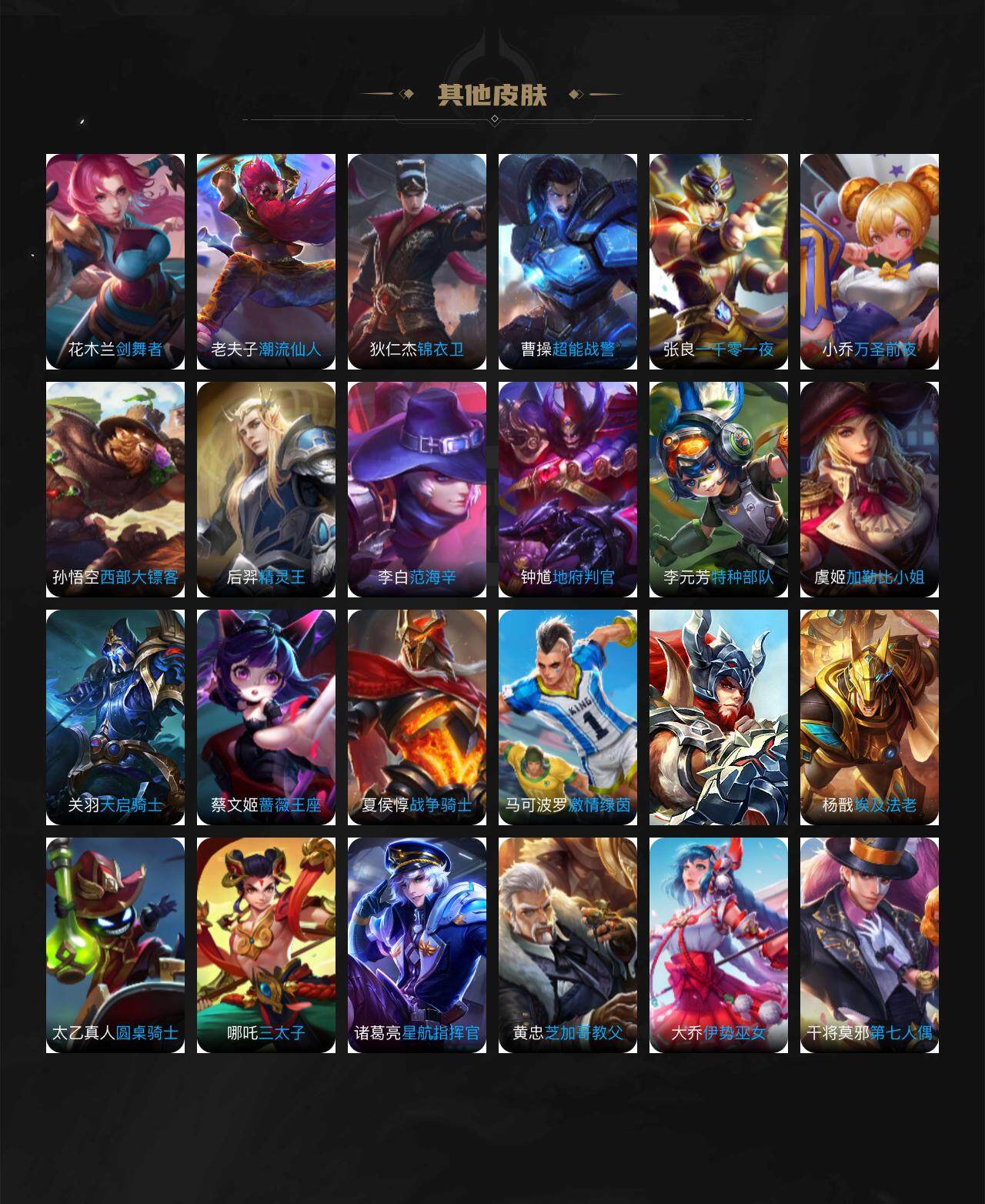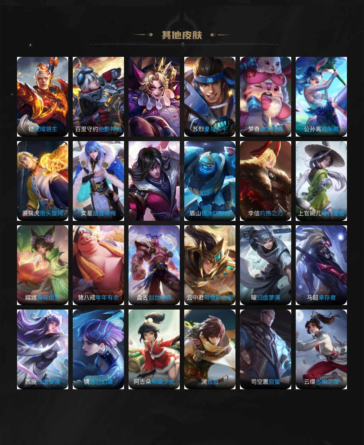 瑶遇见神鹿,大乔猫狗日记,孙策猫狗日记,阿轲节奏热浪,王昭君偶像歌手,韩信白龙吟,项羽苍穹之光,雅典娜冰冠公主,橘右京修罗,嬴政摇滚巨星,刘禅绅士熊喵,白起星夜王子,安琪拉心灵骇客,程咬金功夫厨神,刘邦德古拉伯爵,兰陵王暗隐猎兽者,曹操幽灵船长,宫本武藏鬼剑武藏,亚瑟心灵战警,蔡文姬舞动绿茵,廉颇地狱岩魂,夏侯惇乘风破浪,花木兰水晶猎龙者,墨子金属风暴,百里玄策原初追逐者,吕布圣诞狂欢,貂蝉圣诞恋歌,百里守约特工魅影,嬴政暗夜贵公子,嫦娥拒霜思,雅典娜黎明之约,李白千年之狐,蒙犽百解令,高渐离燃音魔法
