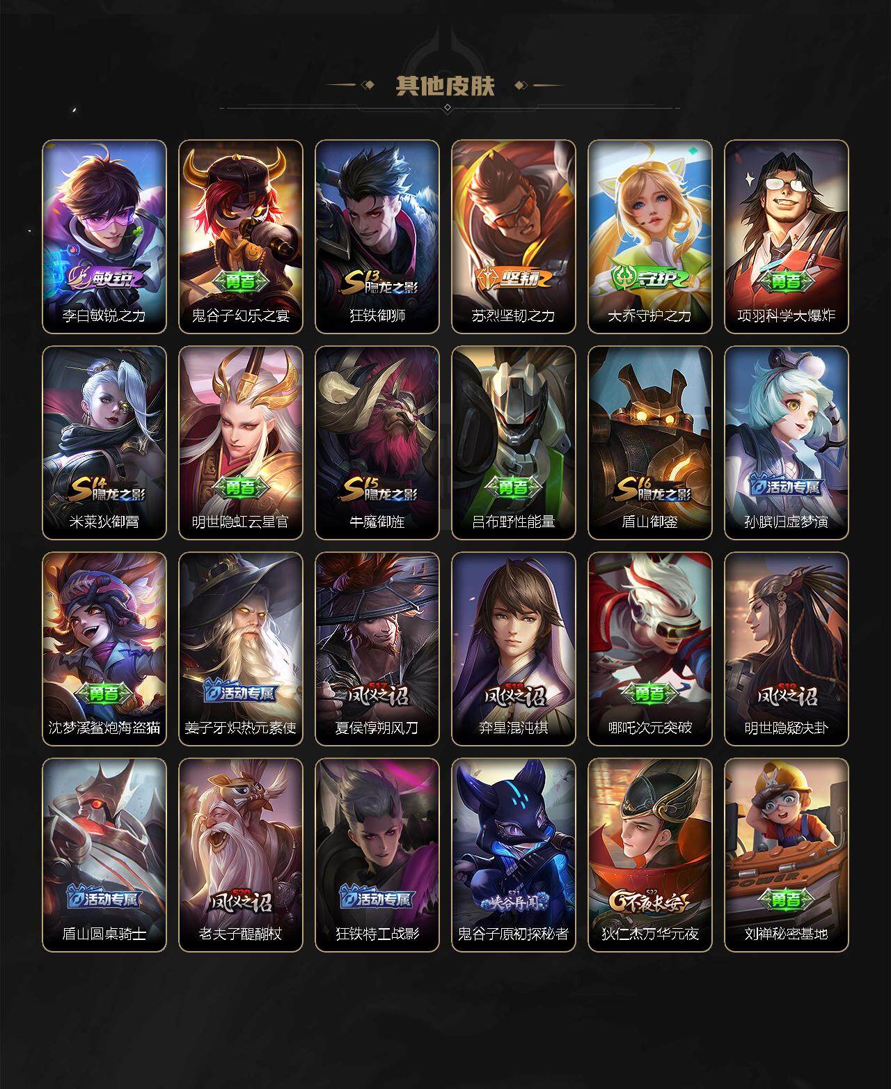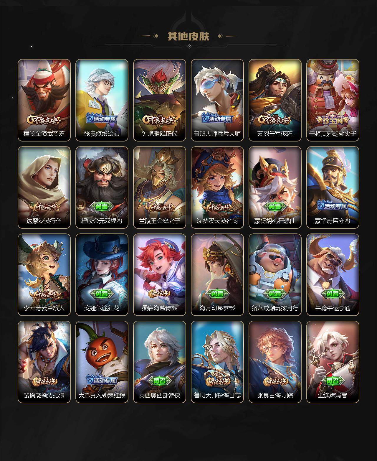 扁鹊炼金王,虞姬凯尔特女王,白起狰,太乙真人饕餮,曹操烛龙,芈月重明,典韦穷奇,狂铁御狮,米莱狄御霄,牛魔御旌,盾山御銮,夏侯惇朔风刀,明世隐疑决卦,老夫子醍醐杖,鬼谷子原初探秘者,狄仁杰万华元夜,程咬金演武夺筹,钟馗驱傩正仪,苏烈千军破阵,弈星混沌棋,达摩沙漠行僧,兰陵王金庭之子,沈梦溪大漠名商,李元芳云中旅人,桑启海盐诗旅,裴擒虎擒涛扼浪,鲁班大师探海日志,张良古海寻踪