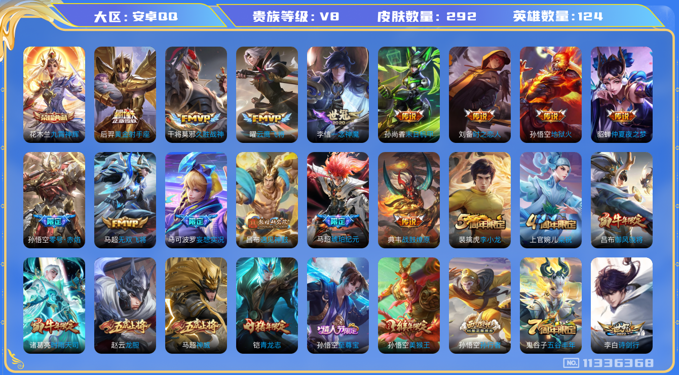 [11336368]【商品标题】:安卓Q-V8-最强王者段位-124英雄-292皮肤-1典藏-0珍品无双-0无双-0珍品传说-19传说-87史诗