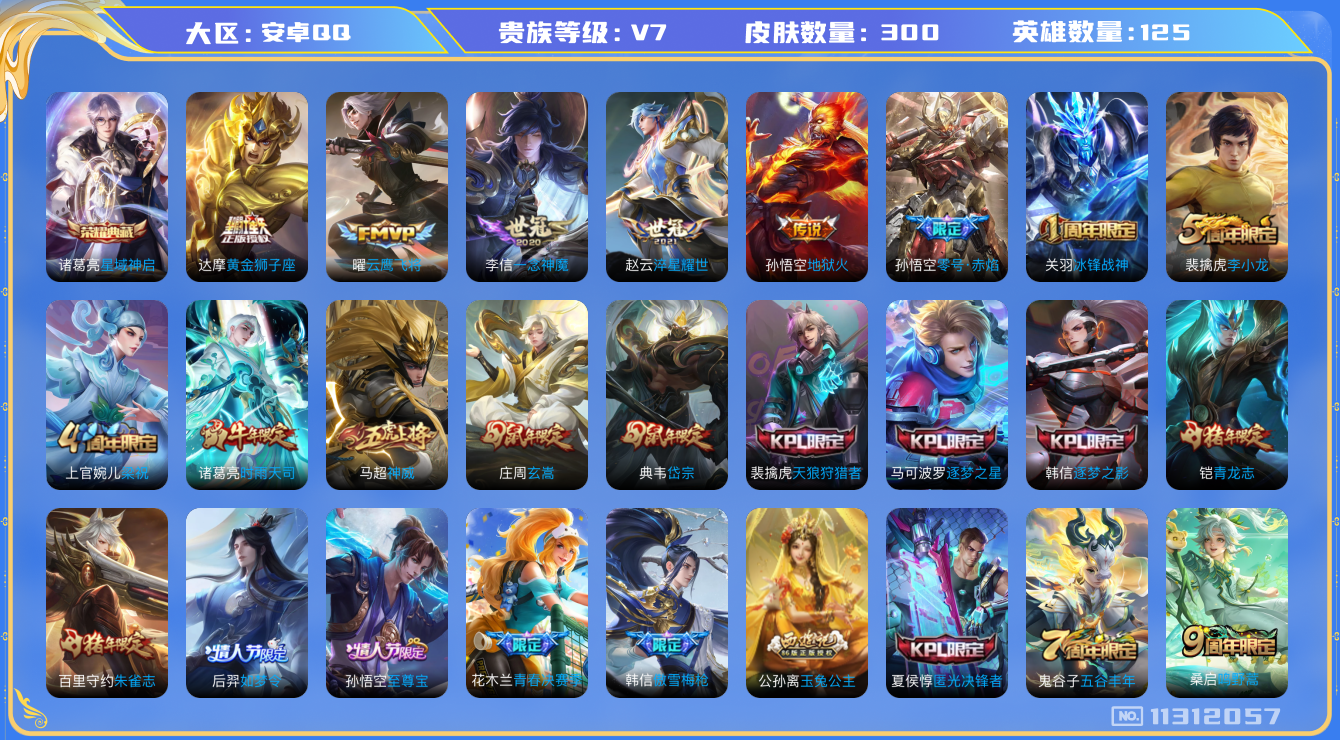 [11312057]【商品标题】:安卓Q-V7-最强王者段位-125英雄-300皮肤-1典藏-0珍品无双-0无双-0珍品传说-8传说-89史诗