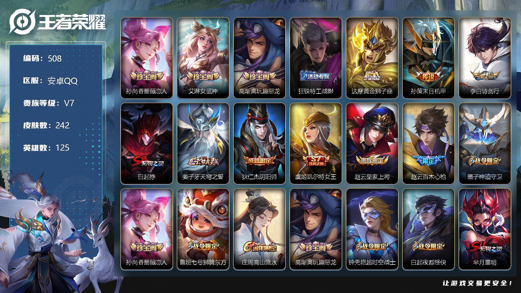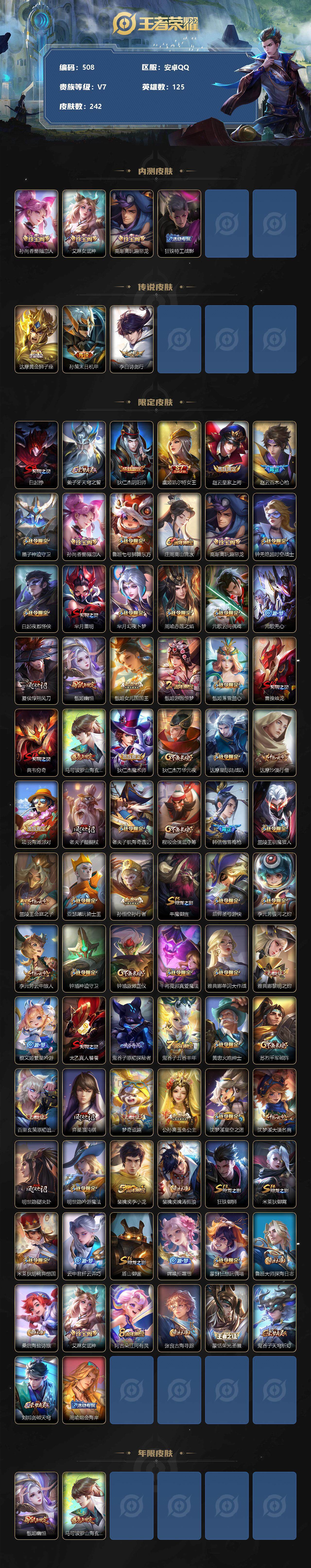 [10977112]【商品标题】:安卓Q-V7-永恒钻石V段位-125英雄-242皮肤-0典藏-0珍品无双-0无双-0珍品传说-3传说-73史诗