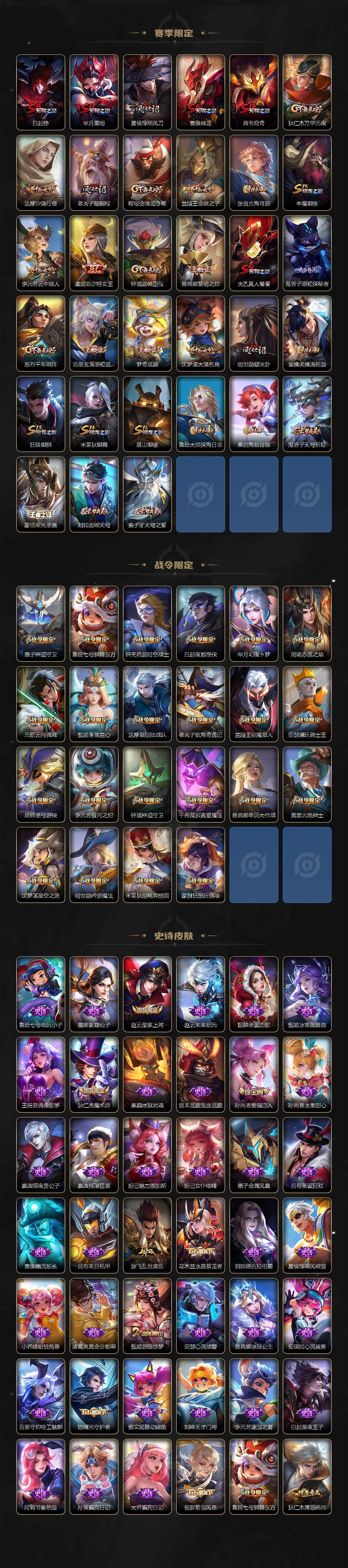 【赛季限定】:白起狰,芈月重明,夏侯惇朔风刀,曹操烛龙,典韦穷奇,狄仁杰万华元夜,达摩沙漠行僧,老夫子醍醐杖,程咬金演武夺筹,兰陵王金庭之子,张良古海寻踪,牛魔御旌,李元芳云中旅人,虞姬凯尔特女王,钟馗驱傩正仪,雅典娜黎明之约,太乙真人饕餮,鬼谷子原初探秘者,苏烈千军破阵,百里玄策原初追逐者,弈星混沌棋,梦奇顽趣,沈梦溪大漠名商,明世隐疑决卦,裴擒虎擒涛扼浪,狂铁御狮,米莱狄御霄,盾山御銮,鲁班大师探海日志,桑启海盐诗旅,鬼谷子天穹祈灯,蒙恬荣光圣徽,刘邦剑破天穹,姜子牙天穹之誓