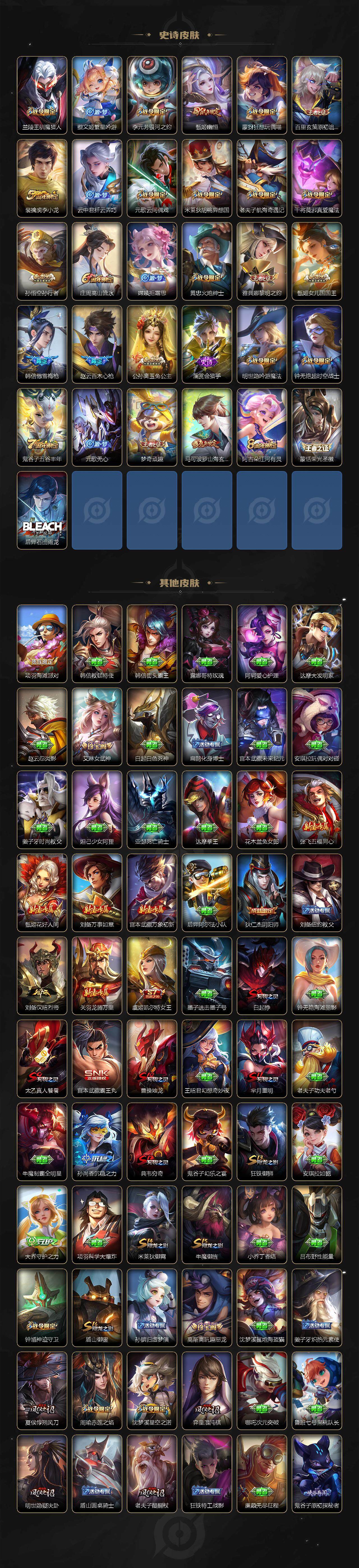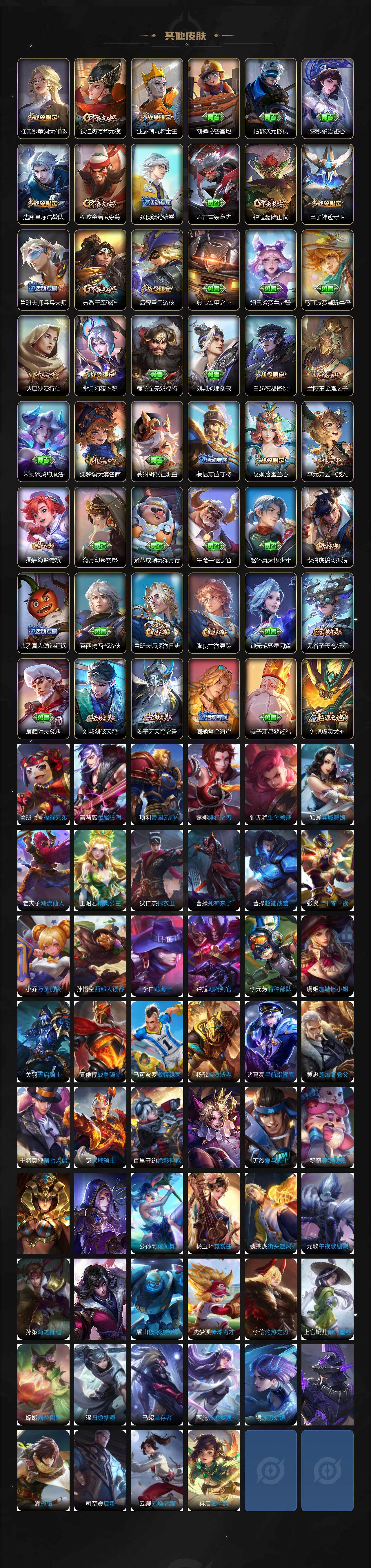 【限定皮肤】:白起狰,姜子牙天穹之誓,狄仁杰阴阳师,虞姬凯尔特女王,赵云皇家上将,赵云百木心枪,墨子神迹守卫,孙尚香蔷薇恋人,鲁班七号狮舞东方,庄周高山流水,高渐离玩趣恶龙,钟无艳超时空战士,白起夜都怪侠,芈月重明,芈月幻夜卜梦,周瑜赤莲之焰,元歌云间偶戏,元歌无心,夏侯惇朔风刀,甄姬幽恒,甄姬女儿国国王,甄姬游园惊梦,甄姬落雪兰心,曹操烛龙,典韦穷奇,马可波罗山海玄木吟,狄仁杰魔术师,狄仁杰万华元夜,达摩星际陆战队,达摩沙漠行僧,项羽海滩派对,老夫子醍醐杖,老夫子航海奇遇记,程咬金演武夺筹,韩信傲雪梅枪,兰陵王驯魔猎人,兰陵王金庭之子,亚瑟潮玩骑士王,孙悟空孙行者,牛魔御旌,后羿圣弓游侠,李元芳银河之约,李元芳云中旅人,钟馗神迹守卫,钟馗驱傩正仪,干将莫邪真爱魔法,雅典娜单词大作战,雅典娜黎明之约,蔡文姬繁星吟游,太乙真人饕餮,鬼谷子原初探秘者,鬼谷子五谷丰年,黄忠火炮绅士,苏烈千军破阵,百里玄策原初追逐者,弈星混沌棋,梦奇顽趣,公孙离玉兔公主,沈梦溪星空之诺,沈梦溪大漠名商,明世隐疑决卦,明世隐吟游魔法,裴擒虎李小龙,裴擒虎擒涛扼浪,狂铁御狮,米莱狄御霄,米莱狄胡桃异想国,云中君纤云弄巧,盾山御銮,嫦娥拒霜思,蒙犽狂想玩偶喵,鲁班大师探海日志,桑启海盐诗旅,艾琳女武神,阿古朵江河有灵,张良古海寻踪,蒙恬荣光圣徽,鬼谷子天穹祈灯,刘邦剑破天穹,周瑜熔金海岸