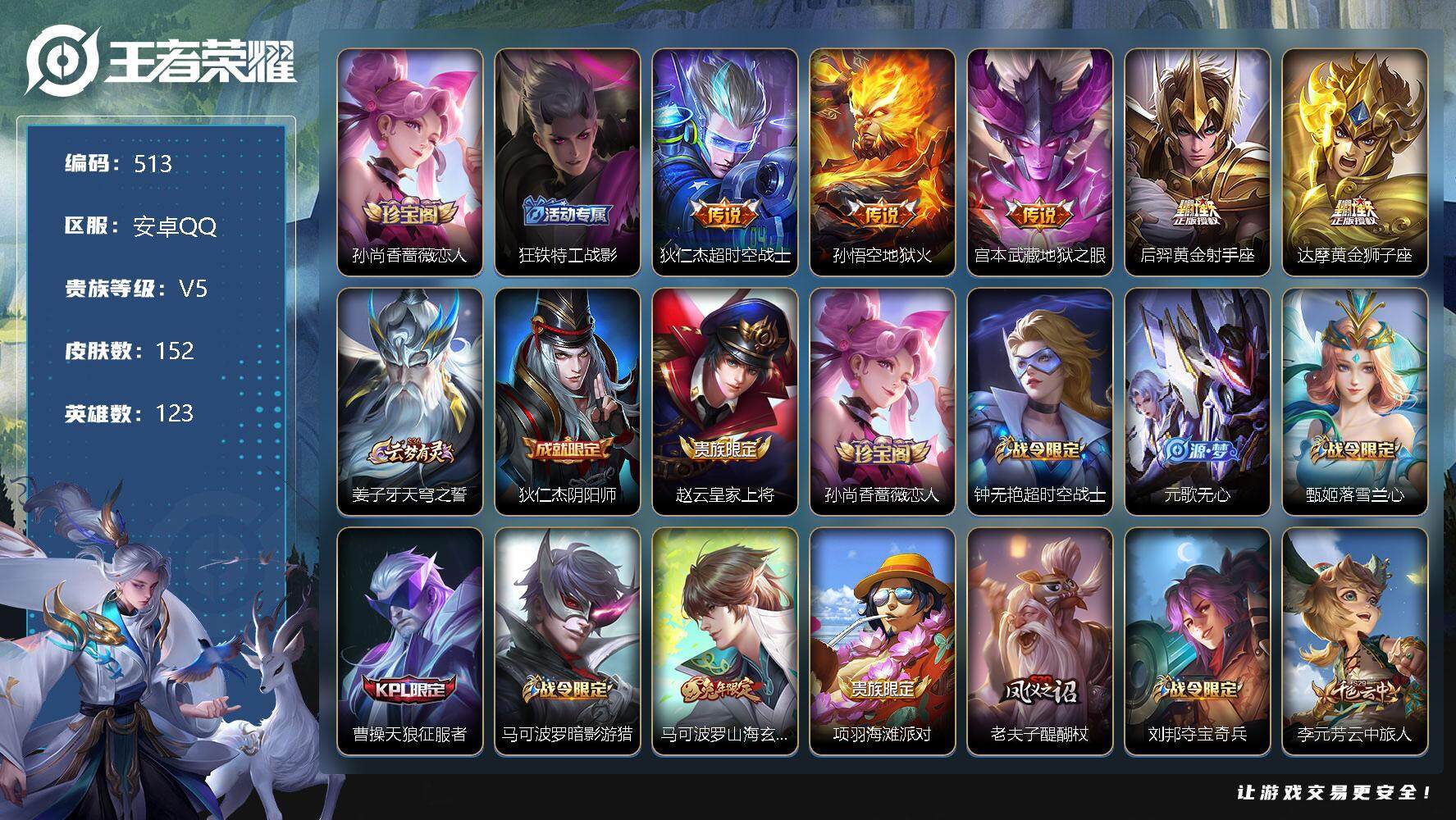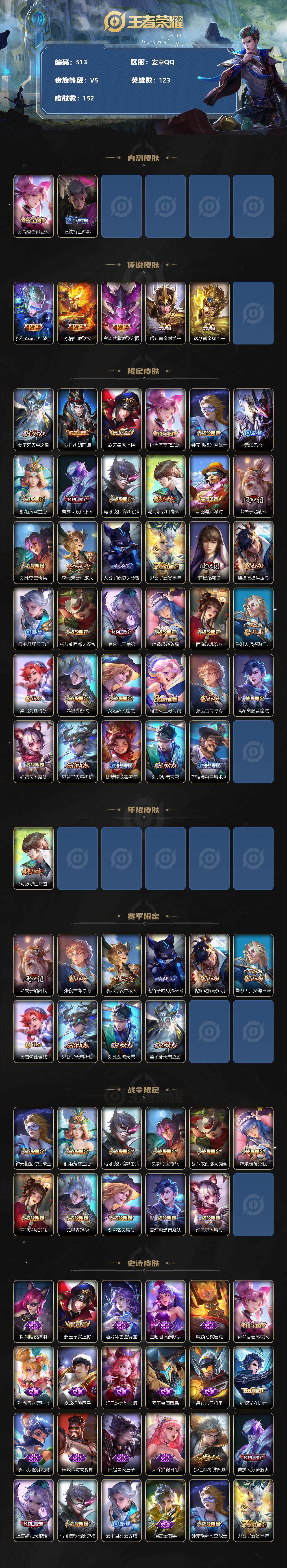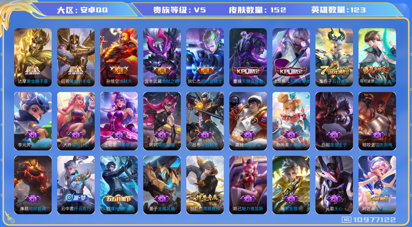 [10977122]【商品标题】:安卓Q-V5-最强王者段位-123英雄-152皮肤-0典藏-0珍品无双-0无双-0珍品传说-5传说-30史诗