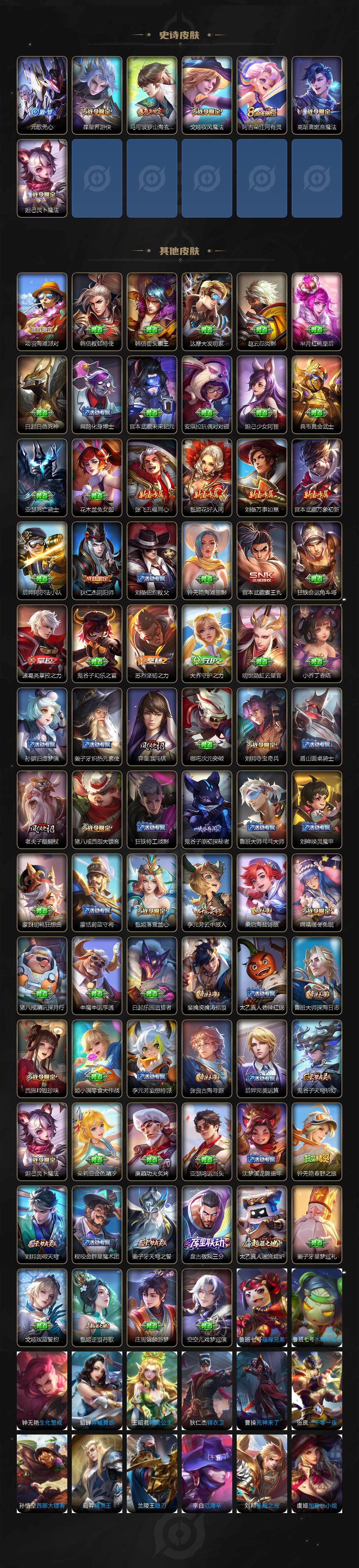 【史诗皮肤】:阿轲暗夜猫娘,赵云皇家上将,甄姬冰雪圆舞曲,王昭君偶像歌手,廉颇地狱岩魂,孙尚香蔷薇恋人,孙尚香水果甜心,嬴政摇滚巨星,妲己魅力维加斯,墨子金属风暴,吕布末日机甲,铠曙光守护者,李元芳逐浪之夏,程咬金功夫厨神,白起星夜王子,大乔猫狗日记,狄仁杰鹰眼统帅,曹操天狼征服者,上官婉儿天狼绘梦者,马可波罗暗影游猎,云中君纤云弄巧,澜赏金猎手,钟无艳超时空战士,鬼谷子五谷丰年,元歌无心,暃星界游侠,马可波罗山海玄木吟,戈娅驭风魔法,阿古朵江河有灵,妲己灵卜魔法,高渐离燃音魔法