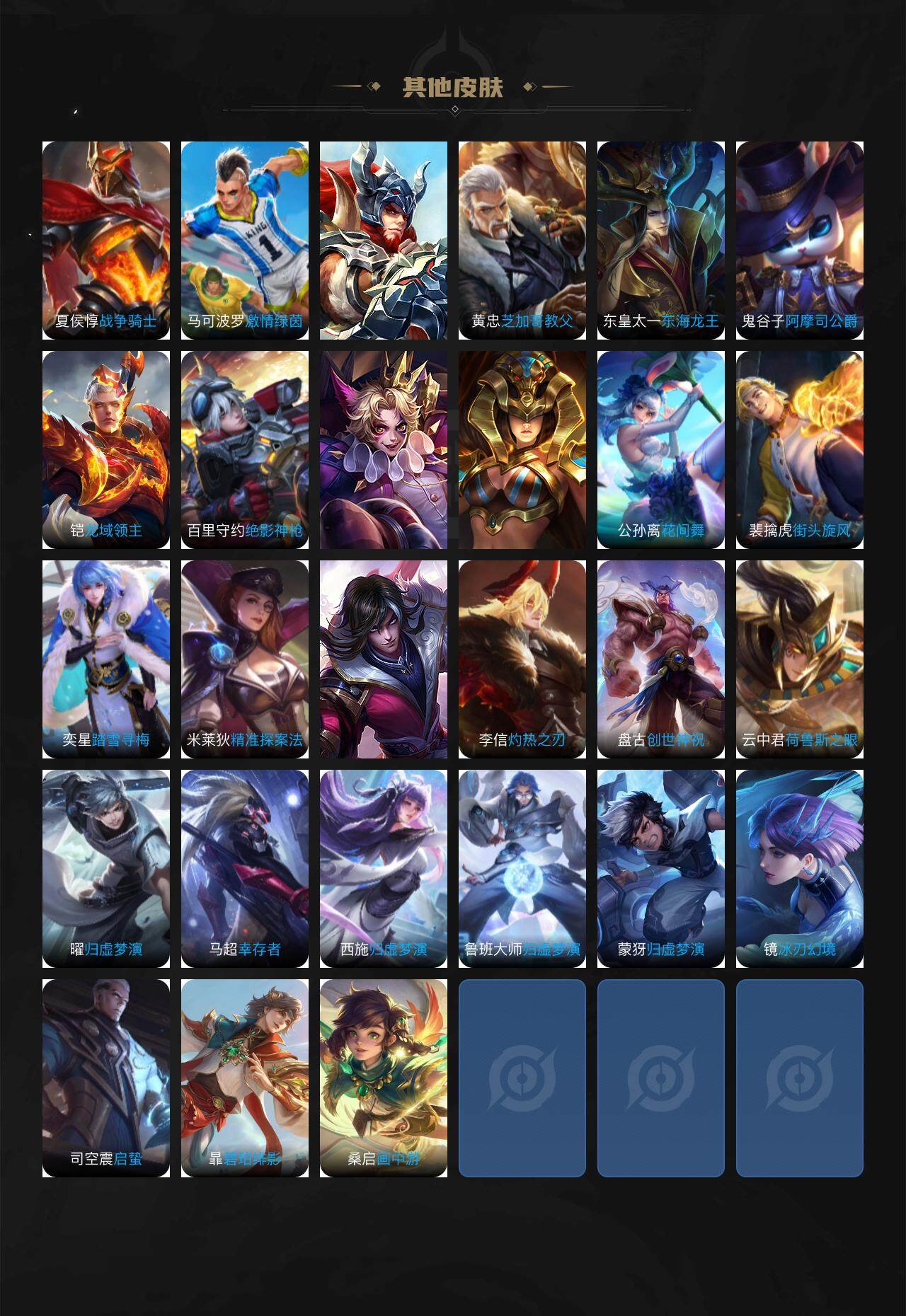 【其他皮肤】:项羽海滩派对,韩信教廷特使,韩信街头霸王,达摩大发明家,赵云忍炎影,芈月红桃皇后,白起白色死神,扁鹊化身博士,宫本武藏未来纪元,安琪拉玩偶对对碰,妲己少女阿狸,典韦黄金武士,亚瑟死亡骑士,花木兰兔女郎,张飞五福同心,甄姬花好人间,刘备万事如意,宫本武藏万象初新,后羿阿尔法小队,狄仁杰