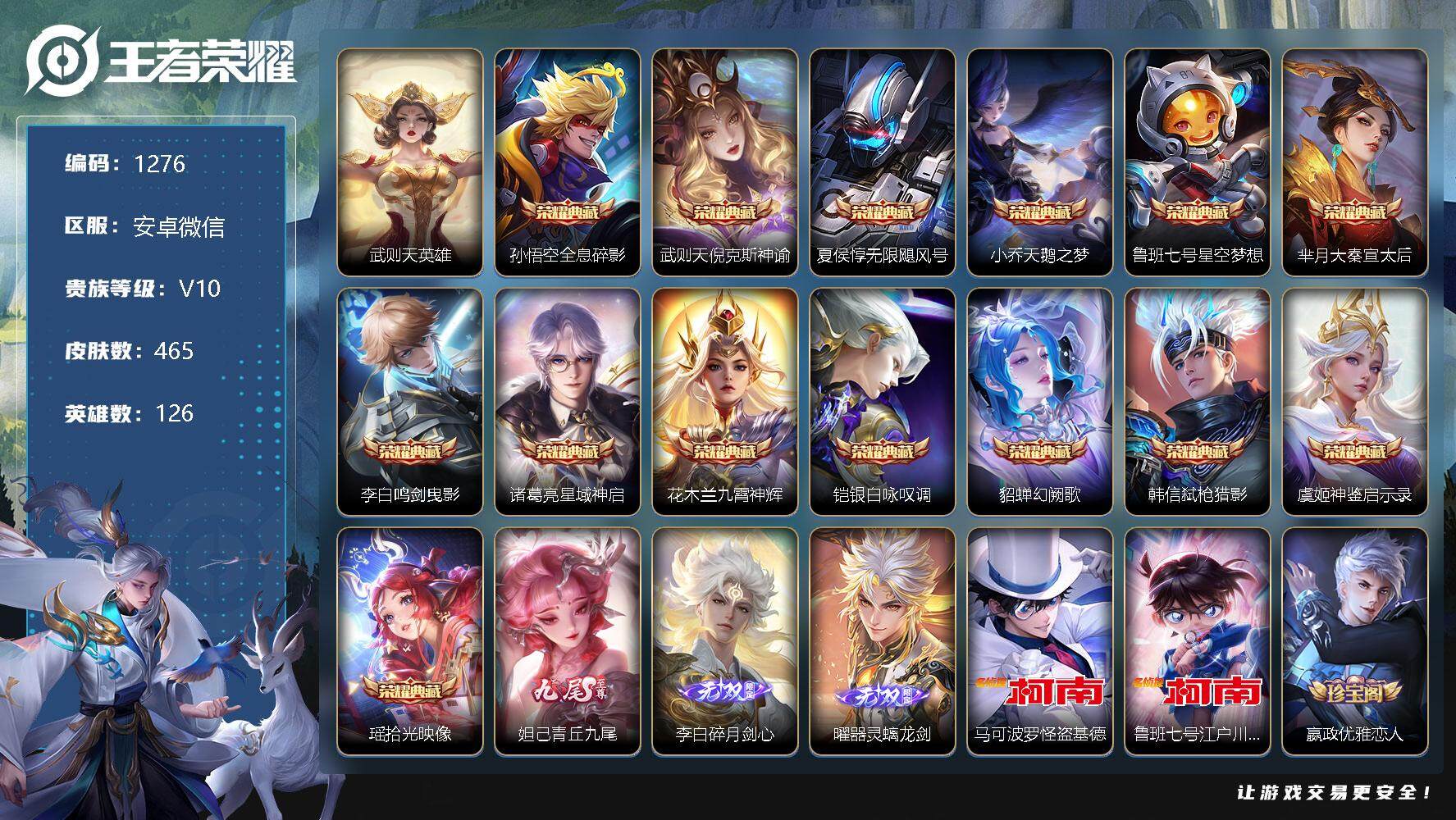 [11363307]【商品标题】:安卓WX-V10-至尊星耀II段位-126英雄-465皮肤-14典藏-0珍品无双-3无双-2珍品传说-82传说-142史诗
