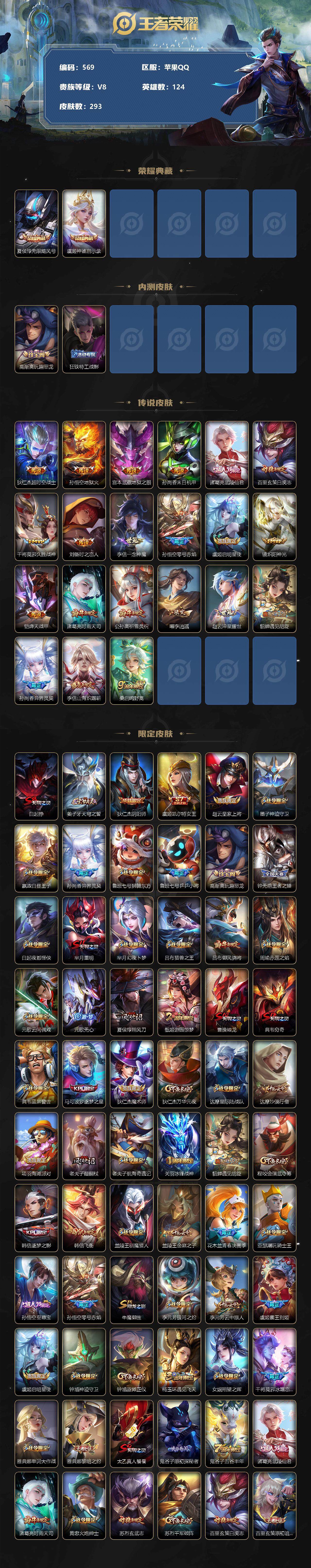 - PX_2095389-96 安卓QQ/永恒钻石/285皮肤/124英雄/1典藏/0珍品无双/1无双/1珍品传说/16传说/89史诗/8稀有英雄 【1 珍品传说】时之奇旅 孙策, 【1 典藏皮肤】弑枪猎影 韩信, 【1 无双皮肤】雪境奇遇 甄姬, 【16 传说皮肤】启明星使 虞姬,云鹰飞将 曜,诗剑行 李白,浮生妄 夏洛特,炽阳神光 镜,黄金射手座 后羿,乞巧织情 王昭君,绯月行 不知火舞,一念神魔