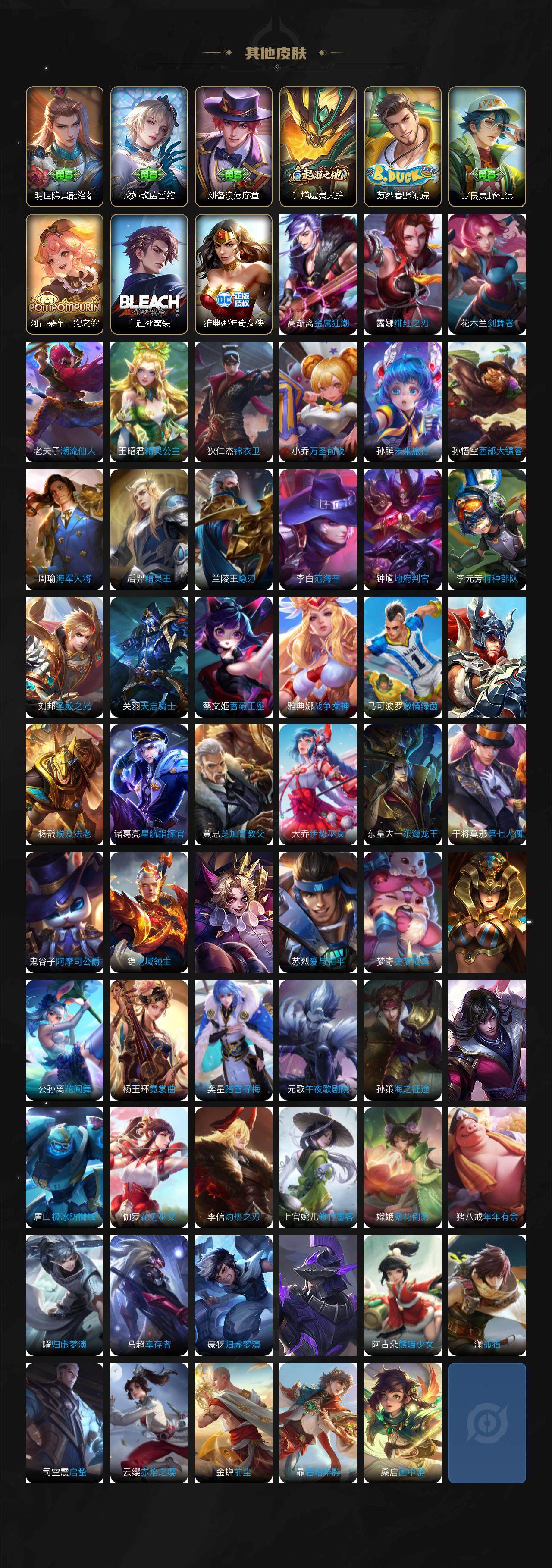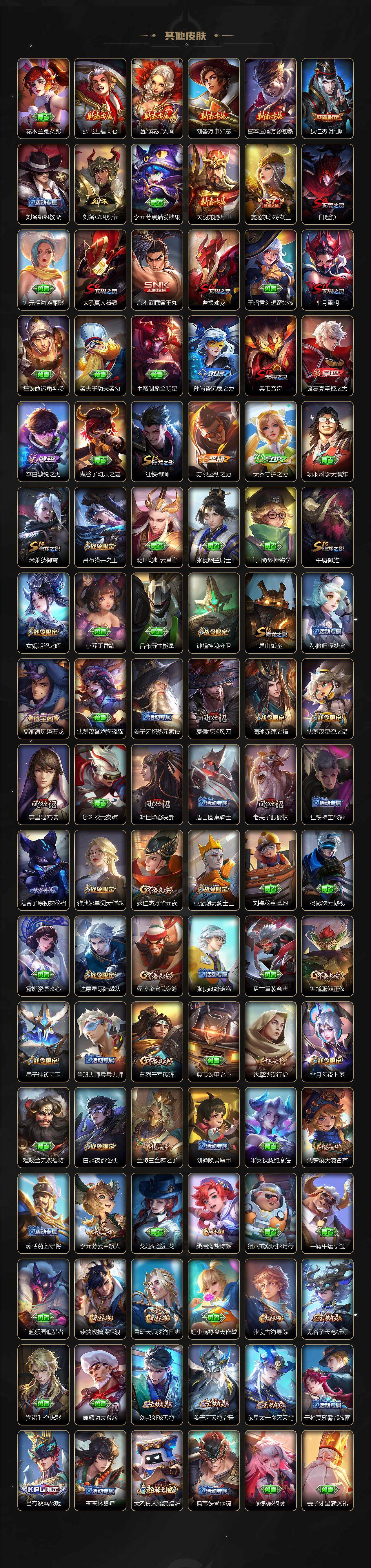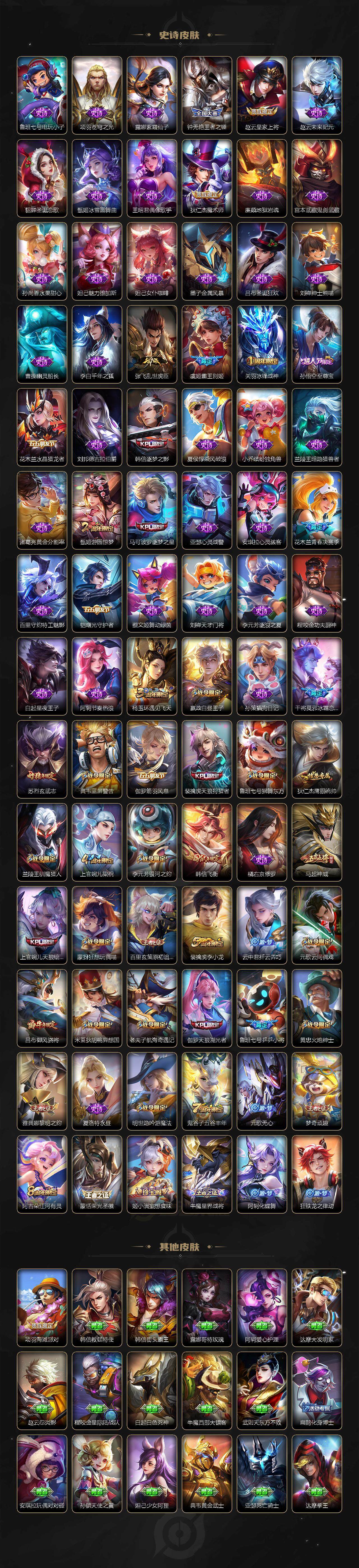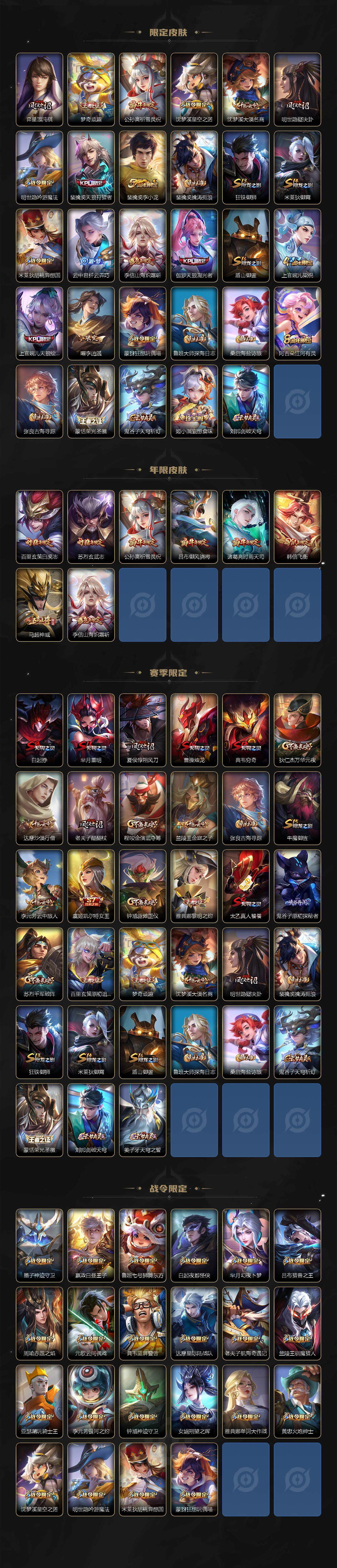 【限定皮肤】:白起狰,姜子牙天穹之誓,狄仁杰阴阳师,虞姬凯尔特女王,赵云皇家上将,墨子神迹守卫,嬴政白昼王子,孙尚香异界灵契,鲁班七号狮舞东方,鲁班七号乒乒小将,高渐离玩趣恶龙,钟无艳王者之锤,白起夜都怪侠,芈月重明,芈月幻夜卜梦,吕布猎兽之王,吕布御风骁将,周瑜赤莲之焰,元歌云间偶戏,元歌无心,夏侯惇朔风刀,甄姬游园惊梦,曹操烛龙,典韦穷奇,典韦蓝屏警告,马可波罗逐梦之星,狄仁杰魔术师,狄仁杰万华元夜,达摩星际陆战队,达摩沙漠行僧,项羽海滩派对,老夫子醍醐杖,老夫子航海奇遇记,关羽冰锋战神,貂蝉遇见胡旋,程咬金演武夺筹,韩信逐梦之影,韩信飞衡,兰陵王驯魔猎人,兰陵王金庭之子,花木兰青春决赛季,亚瑟潮玩骑士王,孙悟空至尊宝,孙悟空零号赤焰,牛魔御旌,李元芳银河之约,李元芳云中旅人,虞姬霸王别姬,虞姬启明星使,钟馗神迹守卫,钟馗驱傩正仪,杨玉环遇见飞天,女娲朔望之晖,干将莫邪冰霜恋舞曲,雅典娜单词大作战,雅典娜黎明之约,太乙真人饕餮,鬼谷子原初探秘者,鬼谷子五谷丰年,诸葛亮武陵仙君,诸葛亮时雨天司,黄忠火炮绅士,苏烈玄武志,苏烈千军破阵,百里玄策白虎志,百里玄策原初追逐者,弈星混沌棋,梦奇顽趣,公孙离祈雪灵祝,沈梦溪星空之诺,沈梦溪大漠名商,明世隐疑决卦,明世隐吟游魔法,裴擒虎天狼狩猎者,裴擒虎李小龙,裴擒虎擒涛扼浪,狂铁御狮,米莱狄御霄,米莱狄胡桃异想国,云中君纤云弄巧,李信山海炽霜斩,伽罗天狼溯光者,盾山御銮,上官婉儿梁祝,上官婉儿天狼绘梦者,曜李逍遥 ,蒙犽狂想玩偶喵,鲁班大师探海日志,桑启海盐诗旅,阿古朵江河有灵,张良古海寻踪,蒙恬荣光圣徽,鬼谷子天穹祈灯,姬小满妄想食味,刘邦剑破天穹