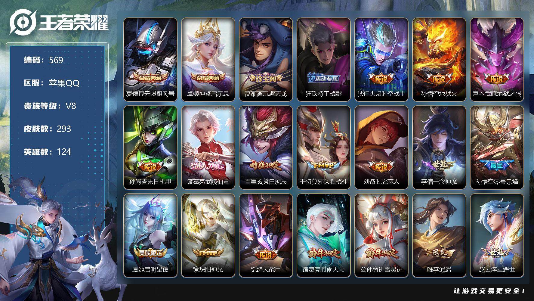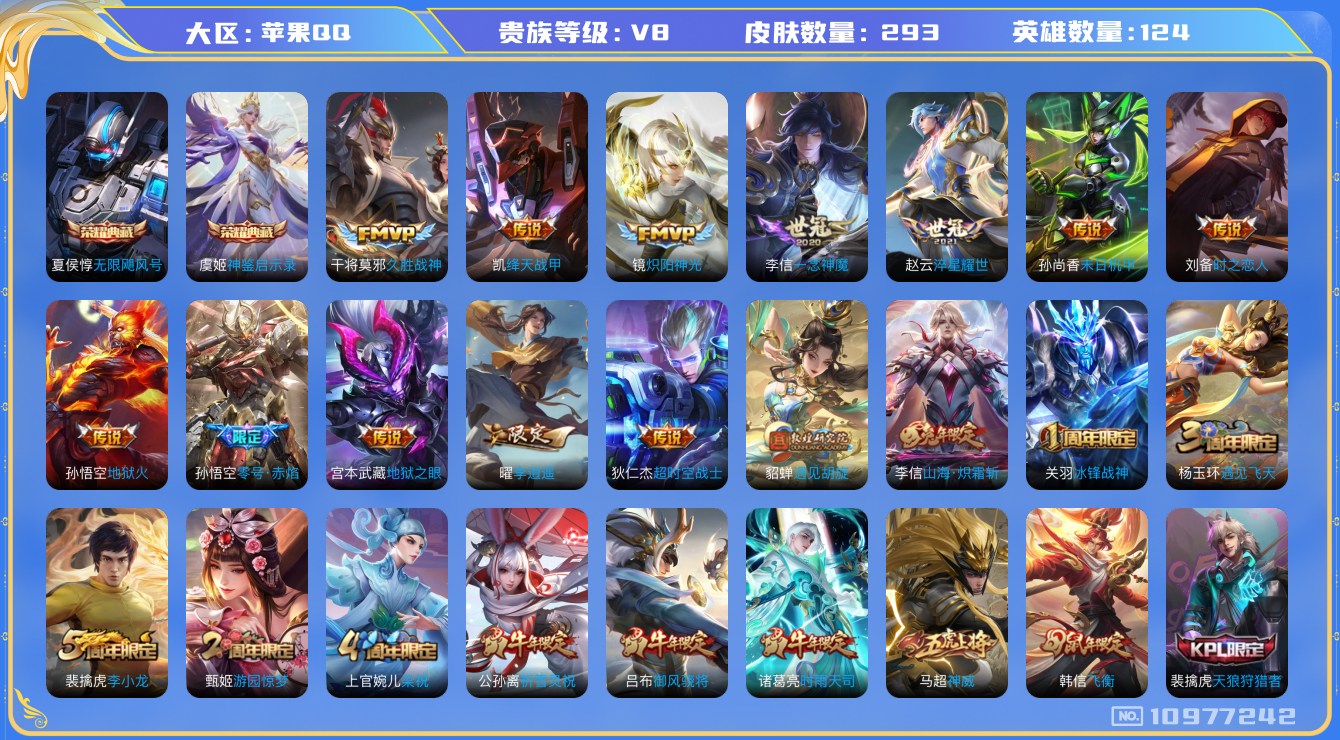[10977242]【商品标题】:苹果Q-V8-永恒钻石III段位-124英雄-293皮肤-2典藏-0珍品无双-0无双-0珍品传说-21传说-84史诗