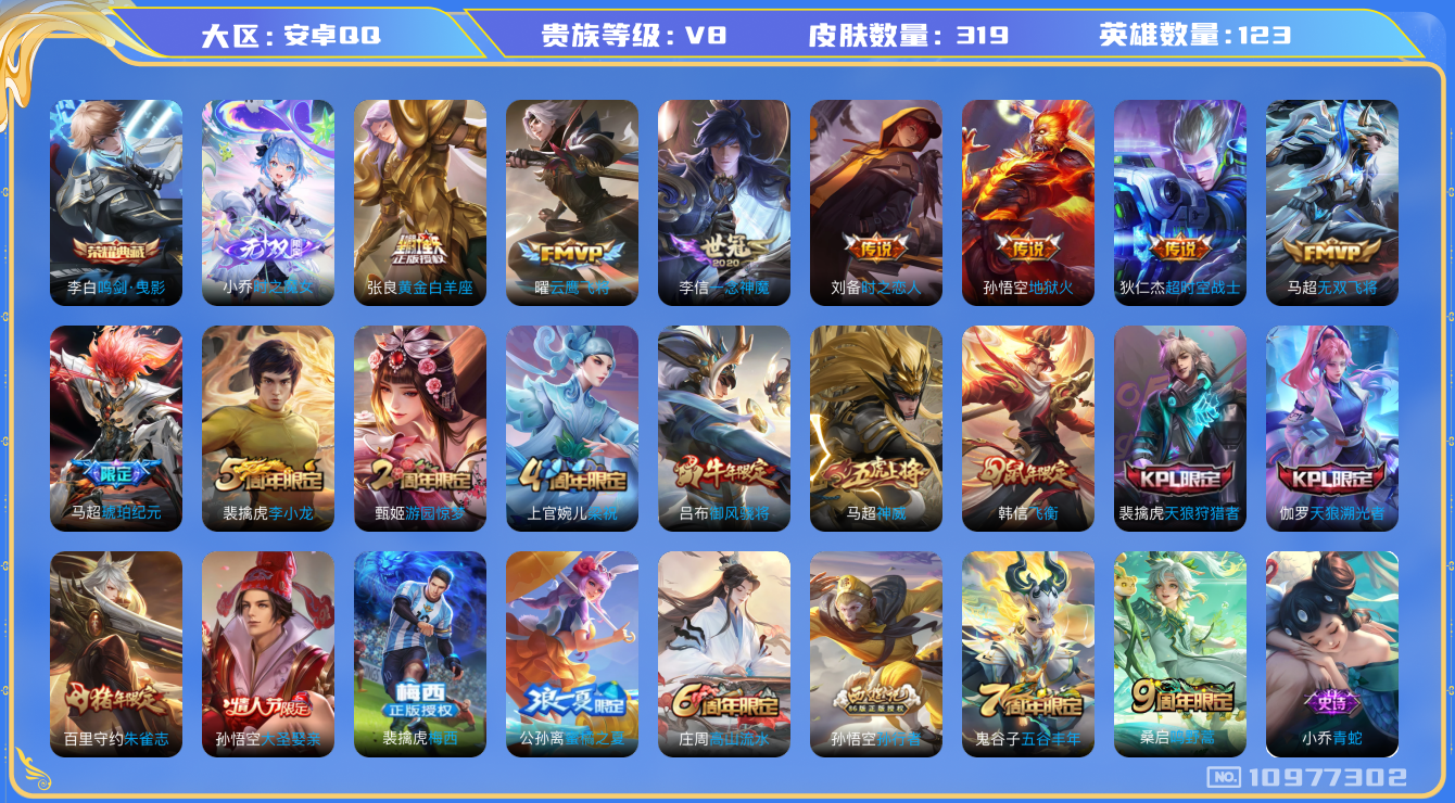 [10977302]【商品标题】:安卓Q-V8-至尊星耀III段位-123英雄-319皮肤-1典藏-0珍品无双-1无双-0珍品传说-10传说-96史诗