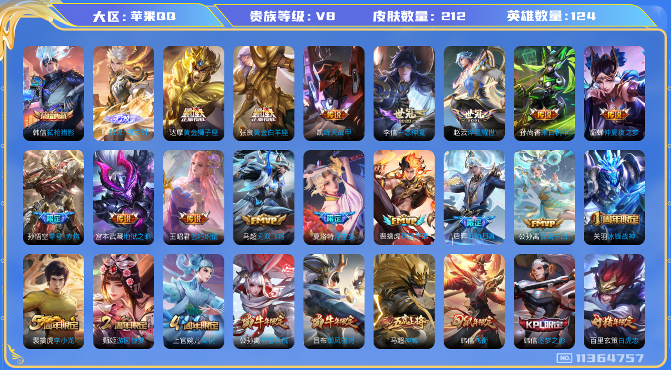 [11364757]【商品标题】:苹果Q-V8-最强王者段位-124英雄-212皮肤-1典藏-0珍品无双-1无双-0珍品传说-23传说-49史诗