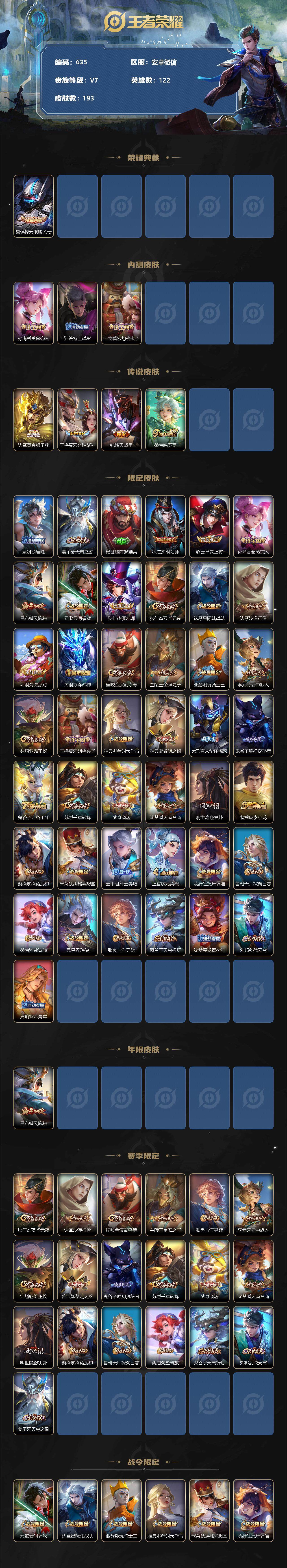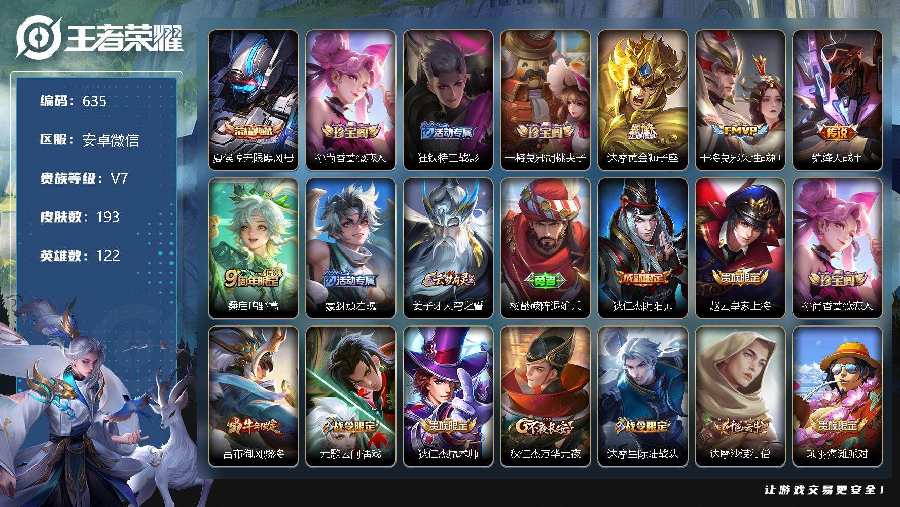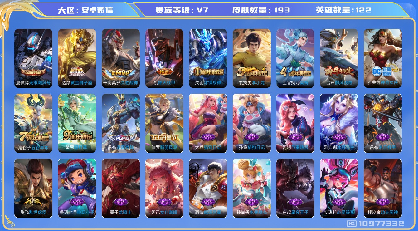 [10977332]【商品标题】:安卓WX-V7-最强王者段位-122英雄-193皮肤-1典藏-0珍品无双-0无双-0珍品传说-4传说-49史诗