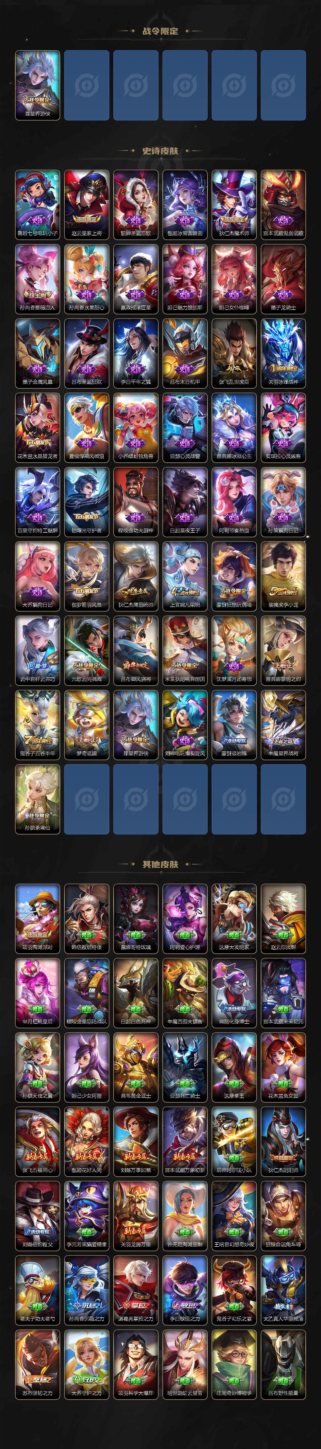 【史诗皮肤】:鲁班七号电玩小子,赵云皇家上将,貂蝉圣诞恋歌,甄姬冰雪圆舞曲,狄仁杰魔术师,宫本武藏鬼剑武藏,孙尚香蔷薇恋人,孙尚香水果甜心,嬴政摇滚巨星,妲己魅力维加斯,妲己女仆咖啡,墨子龙骑士,墨子金属风暴,吕布圣诞狂欢,李白千年之狐,吕布末日机甲,张飞乱世虎臣,关羽冰锋战神,花木兰水晶猎龙者,夏侯惇乘风破浪,小乔缤纷独角兽,亚瑟心灵战警,雅典娜冰冠公主,安琪拉心灵骇客,百里守约特工魅影,铠曙光守护者,程咬金功夫厨神,白起星夜王子,阿轲节奏热浪,孙策猫狗日记,大乔猫狗日记,伽罗箭羽风息,狄仁杰鹰眼统帅,上官婉儿梁祝,蒙犽狂想玩偶喵,裴擒虎李小龙,云中君纤云弄巧,元歌云间偶戏,吕