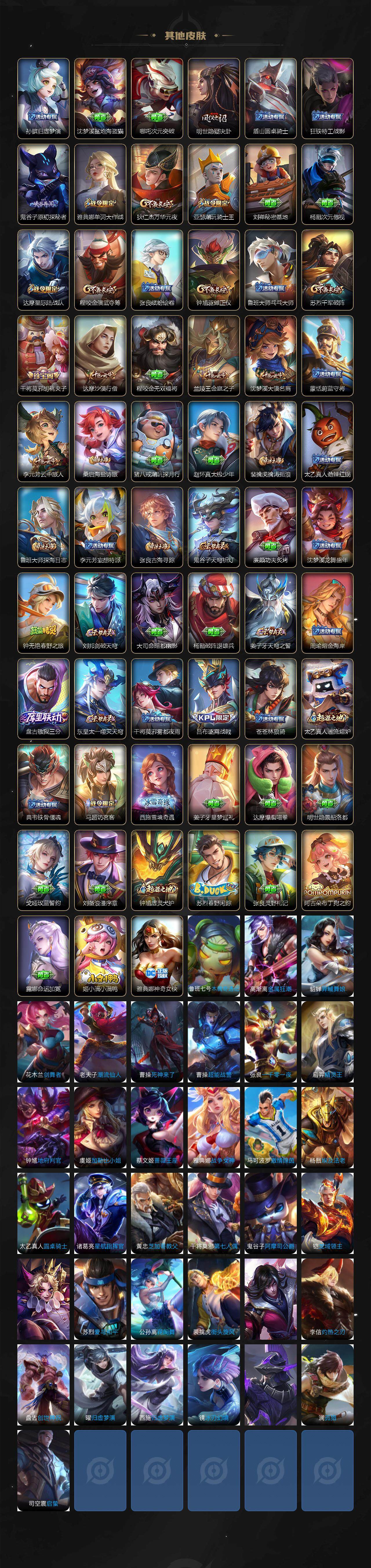 【赛季限定】:狄仁杰万华元夜,达摩沙漠行僧,程咬金演武夺筹,兰陵王金庭之子,张良古海寻踪,李元芳云中旅人,钟馗驱傩正仪,雅典娜黎明之约,鬼谷子原初探秘者,苏烈千军破阵,梦奇顽趣,沈梦溪大漠名商,明世隐疑决卦,裴擒虎擒涛扼浪,鲁班大师探海日志,桑启海盐诗旅,鬼谷子天穹祈灯,刘邦剑破天穹,姜子牙天穹之誓