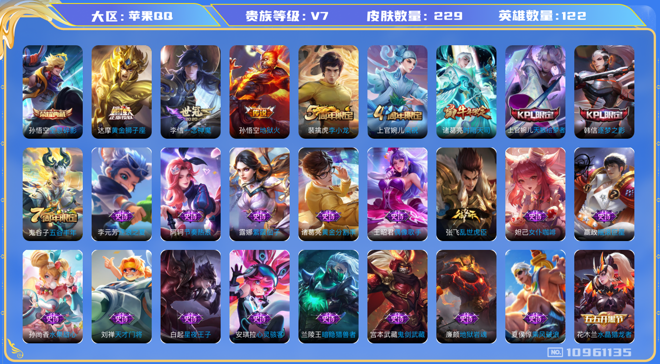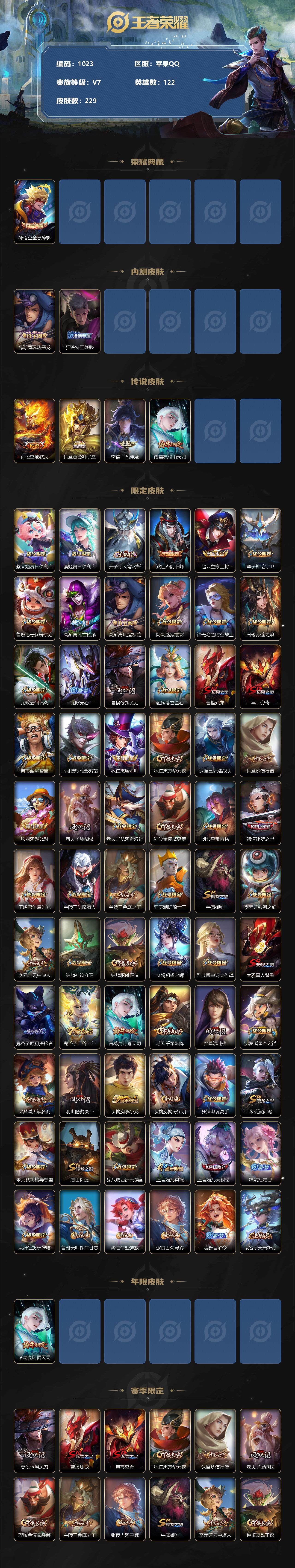 [10961135]【商品标题】:苹果Q-V7-永恒钻石III段位-122英雄-229皮肤-1典藏-0珍品无双-0无双-0珍品传说-4传说-50史诗