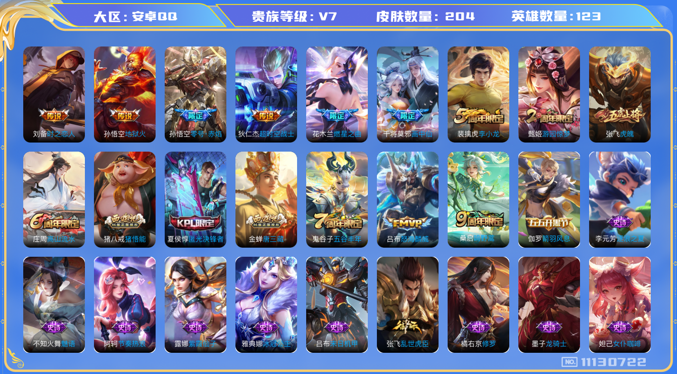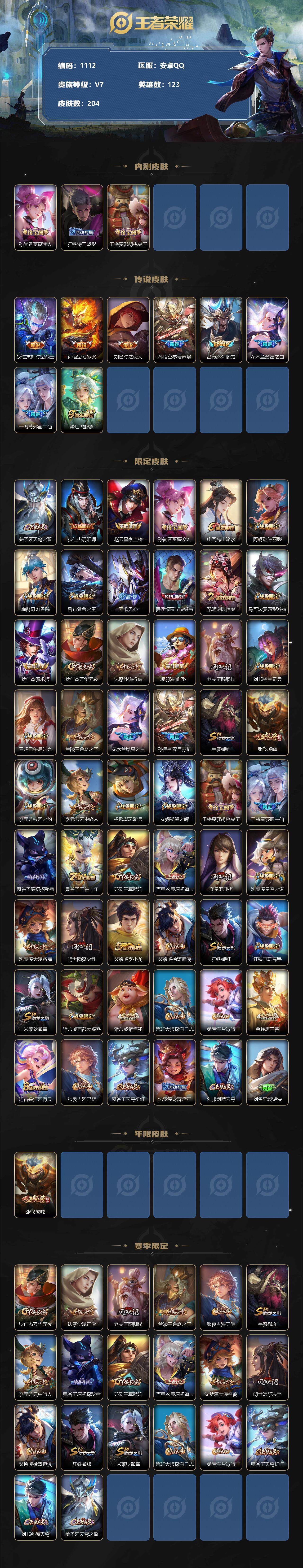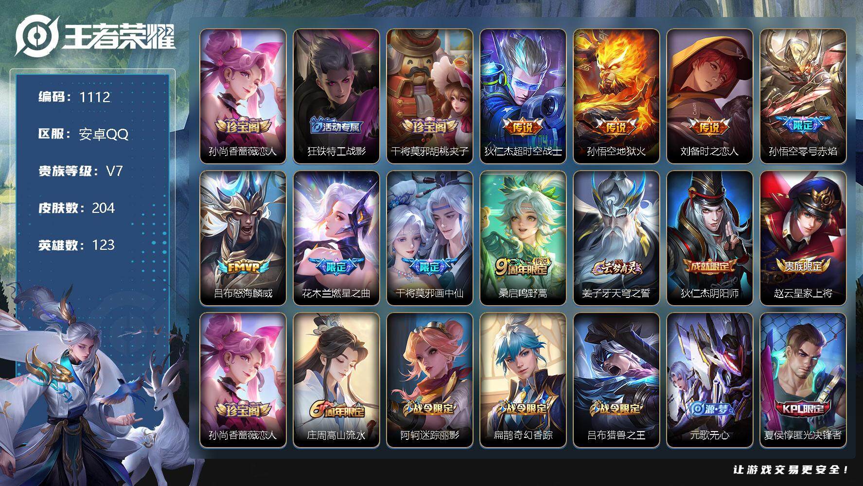 [11130722]【商品标题】:安卓Q-V4-至尊星耀III段位-123英雄-204皮肤-0典藏-0珍品无双-0无双-0珍品传说-8传说-51史诗