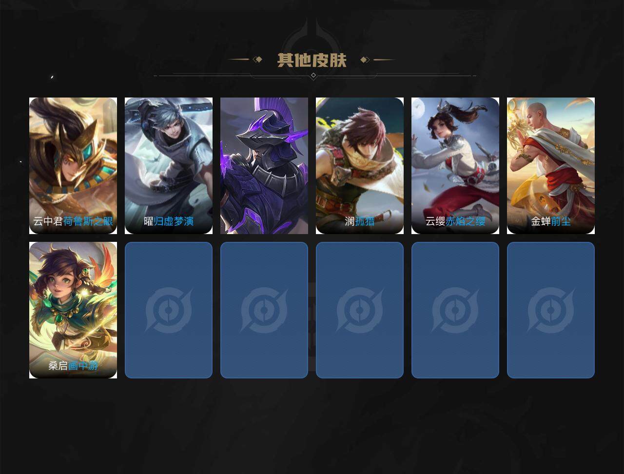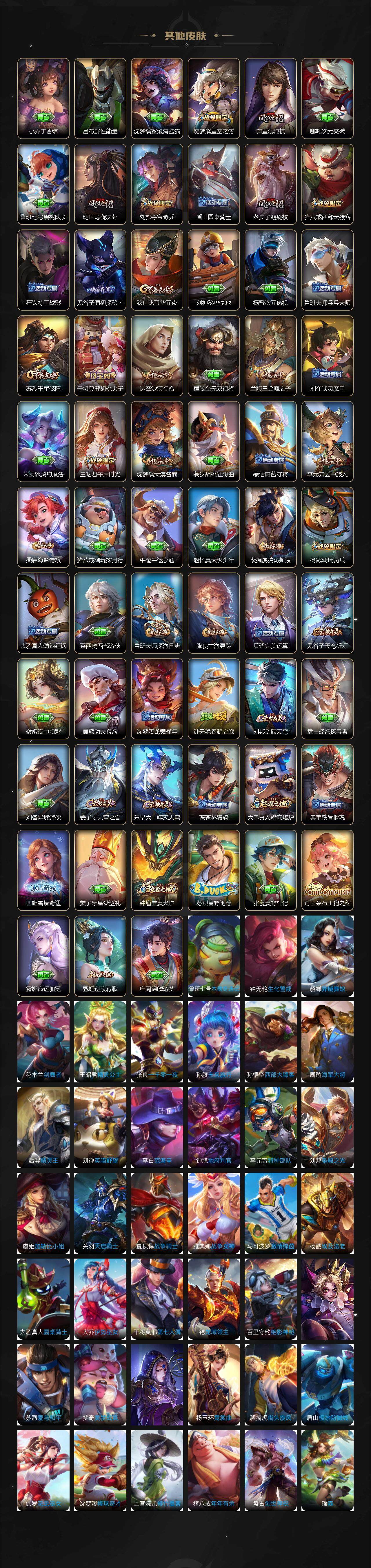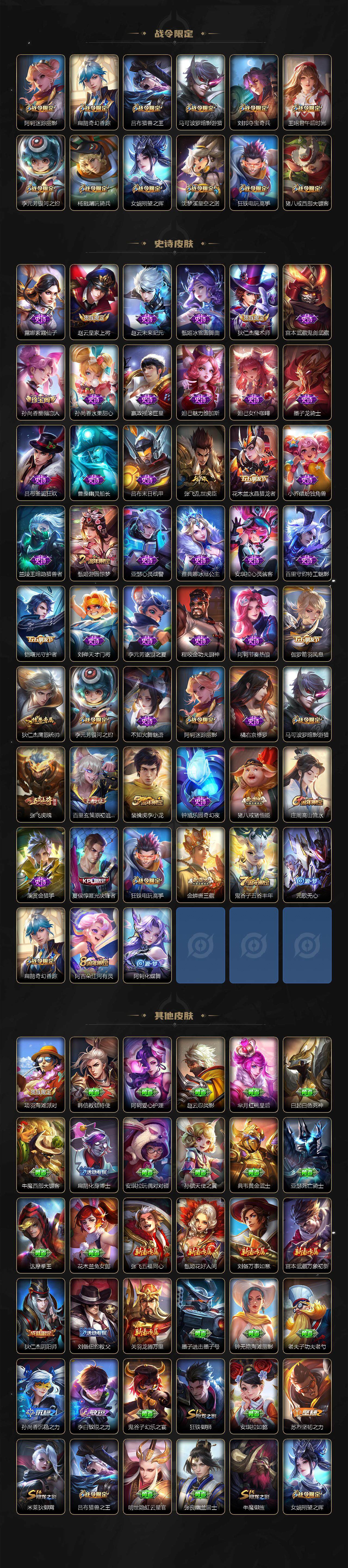 【限定皮肤】:姜子牙天穹之誓,狄仁杰阴阳师,赵云皇家上将,孙尚香蔷薇恋人,庄周高山流水,阿轲迷踪丽影,扁鹊奇幻香踪,吕布猎兽之王,元歌无心,夏侯惇匿光决锋者,甄姬游园惊梦,马可波罗暗影游猎,狄仁杰魔术师,狄仁杰万华元夜,达摩沙漠行僧,项羽海滩派对,老夫子醍醐杖,刘邦夺宝奇兵,王昭君午后时光,兰陵王金庭之子,花木兰燃星之曲,孙悟空零号赤焰,牛魔御旌,张飞虎魄,李元芳银河之约,李元芳云中旅人,杨戬潮玩骑兵,女娲朔望之晖,干将莫邪胡桃夹子,干将莫邪画中仙,鬼谷子原初探秘者,鬼谷子五谷丰年,苏烈千军破阵,百里玄策原初追逐者,弈星混沌棋,沈梦溪星空之诺,沈梦溪大漠名商,明世隐疑决卦,裴擒虎李小龙,裴擒虎擒涛扼浪,狂铁御狮,狂铁电玩高手,米莱狄御霄,猪八戒西部大镖客,猪八戒猪悟能,鲁班大师探海日志,桑启海盐诗旅,金蝉唐三藏,阿古朵江河有灵,张良古海寻踪,鬼谷子天穹祈灯,沈梦溪龙舞盛年,刘邦剑破天穹,刘备异域游侠