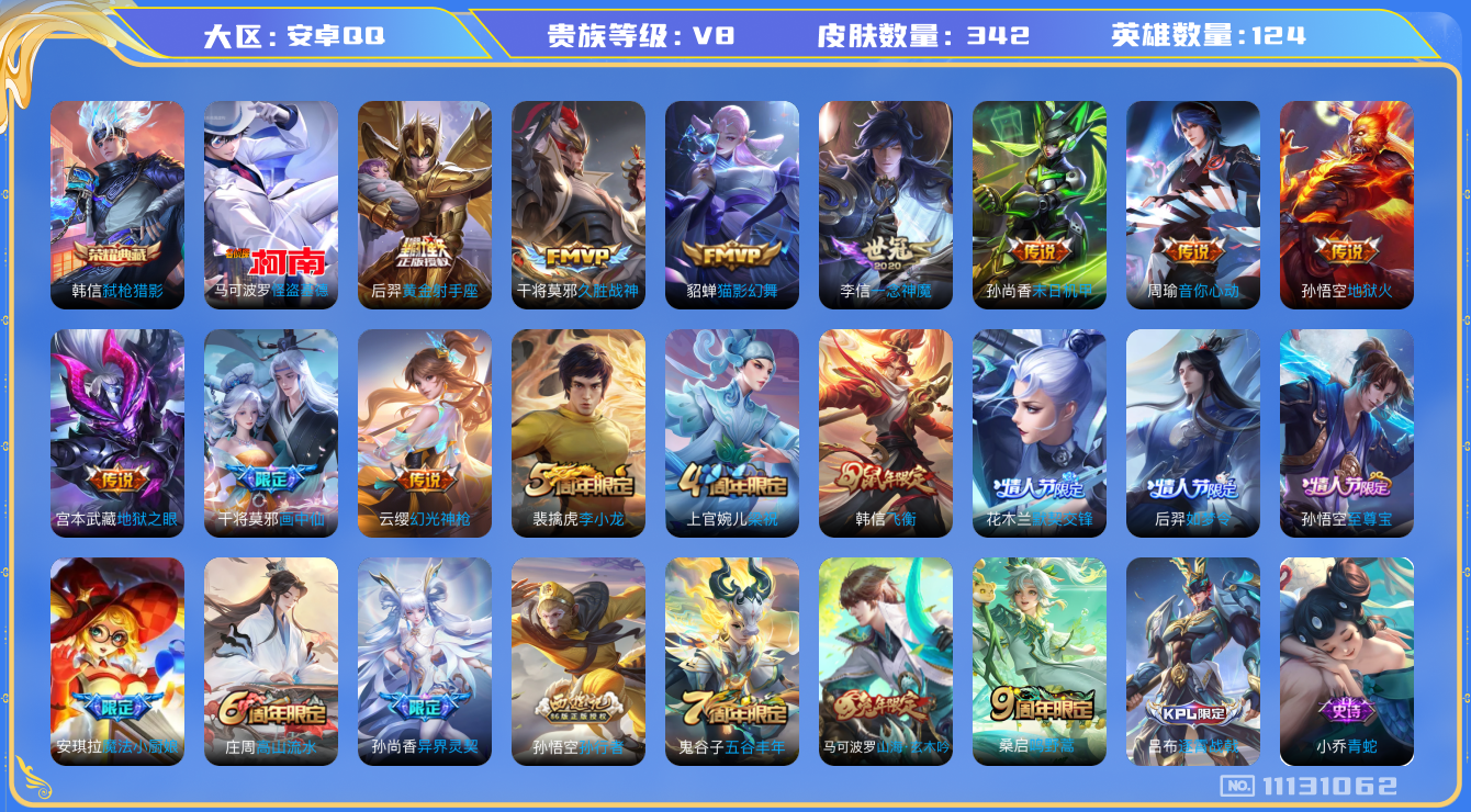 [11131062]【商品标题】:安卓Q-V7-至尊星耀I段位-124英雄-342皮肤-1典藏-0珍品无双-0无双-1珍品传说-13传说-91史诗