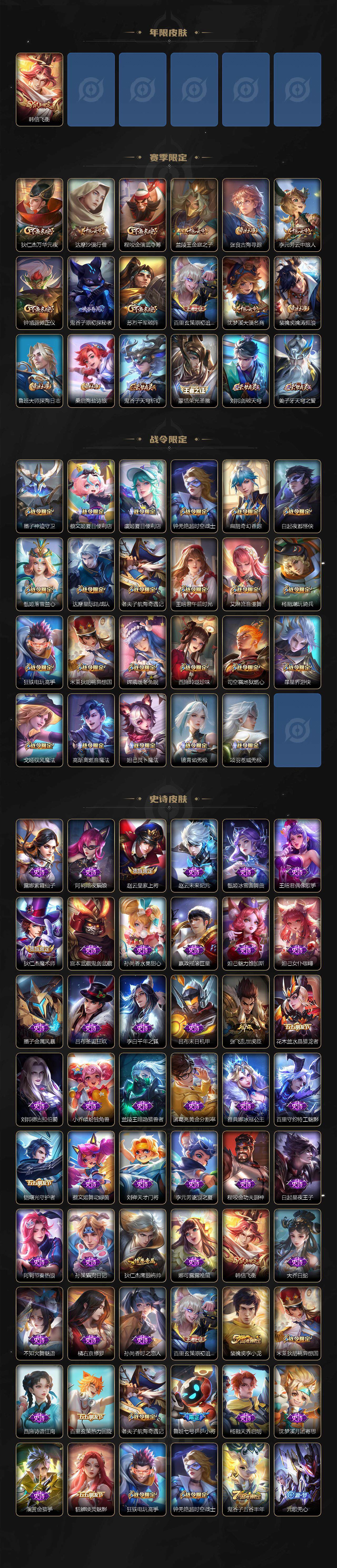 【赛季限定】:狄仁杰万华元夜,达摩沙漠行僧,程咬金演武夺筹,兰陵王金庭之子,张良古海寻踪,李元芳云中旅人,钟馗驱傩正仪,鬼谷子原初探秘者,苏烈千军破阵,百里玄策原初追逐者,沈梦溪大漠名商,裴擒虎擒涛扼浪,鲁班大师探海日志,桑启海盐诗旅,鬼谷子天穹祈灯,蒙恬荣光圣徽,刘邦剑破天穹,姜子牙天穹之誓